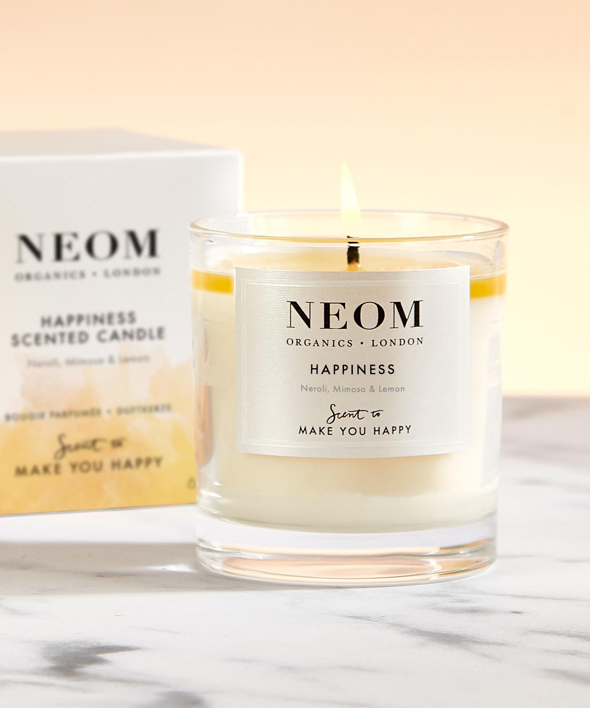 NEOM Wellbeing London's Happiness scented candle is infused with the delicate blend of essential oils that form the brand's Happiness™ scent.
