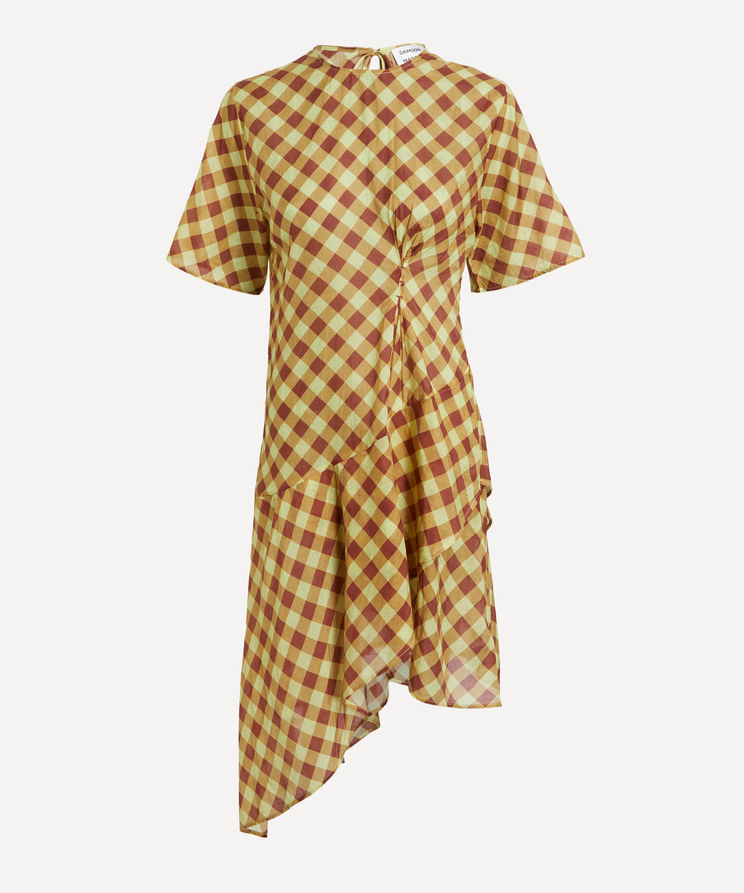 Cut from a sheer cotton blend in a gingham print, this midi dress is shaped to a regular fit, featuring short sleeves, an asymmetrical and flared hem, a cinched waist, and a side seam zipper for effortless comfort.