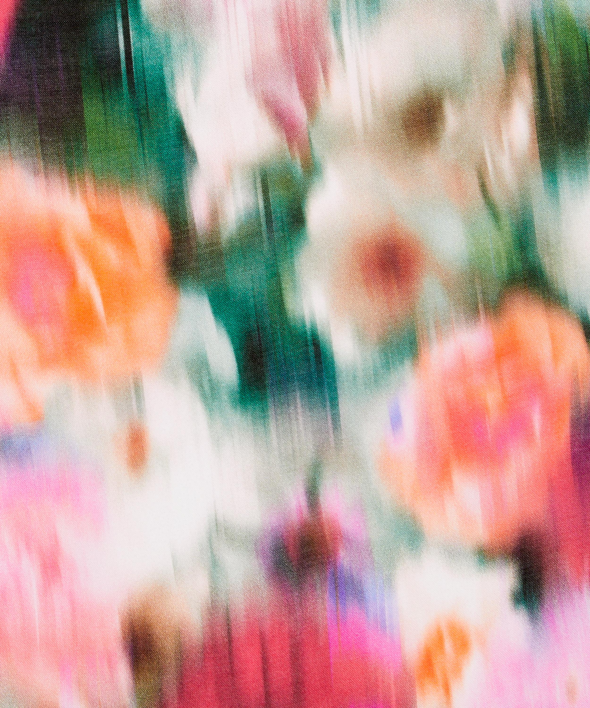 Hazy Days offers a playful, almost photographic interpretation of the natural world, capturing the essence of botany through a soft, dreamlike lens. The design suggests the shifting movement of petals and leaves, with bursts of bright, bold flowers emerging through a gentle haze- evoking the feeling of a summer’s day seen slightly out of focus.
