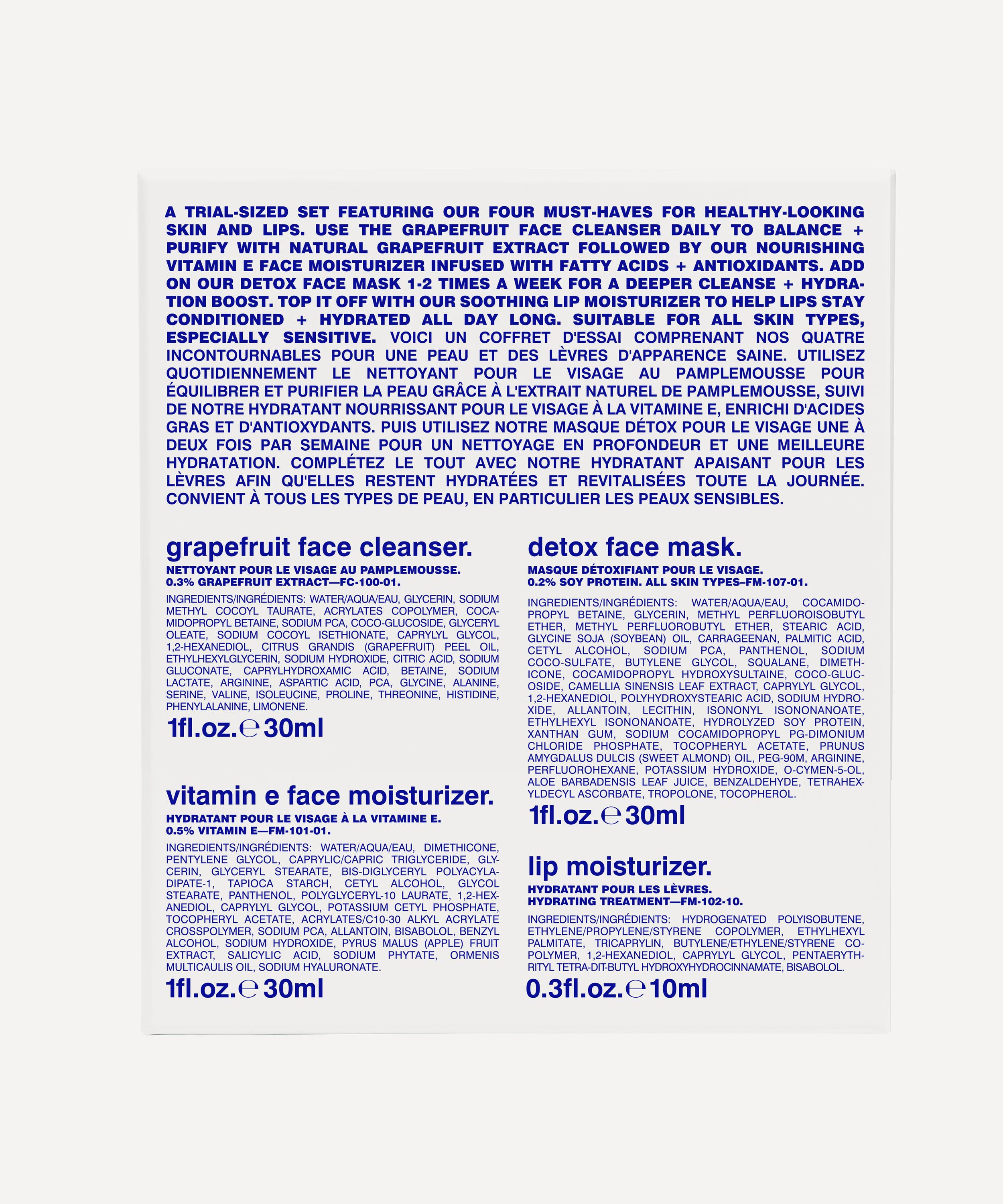 - Starter set includes: Grapefruit Face Cleanser 30ml, Vitamin E Face Moisturiser 30ml, Detox Face Mask 30ml and Lip Moisturiser 10ml