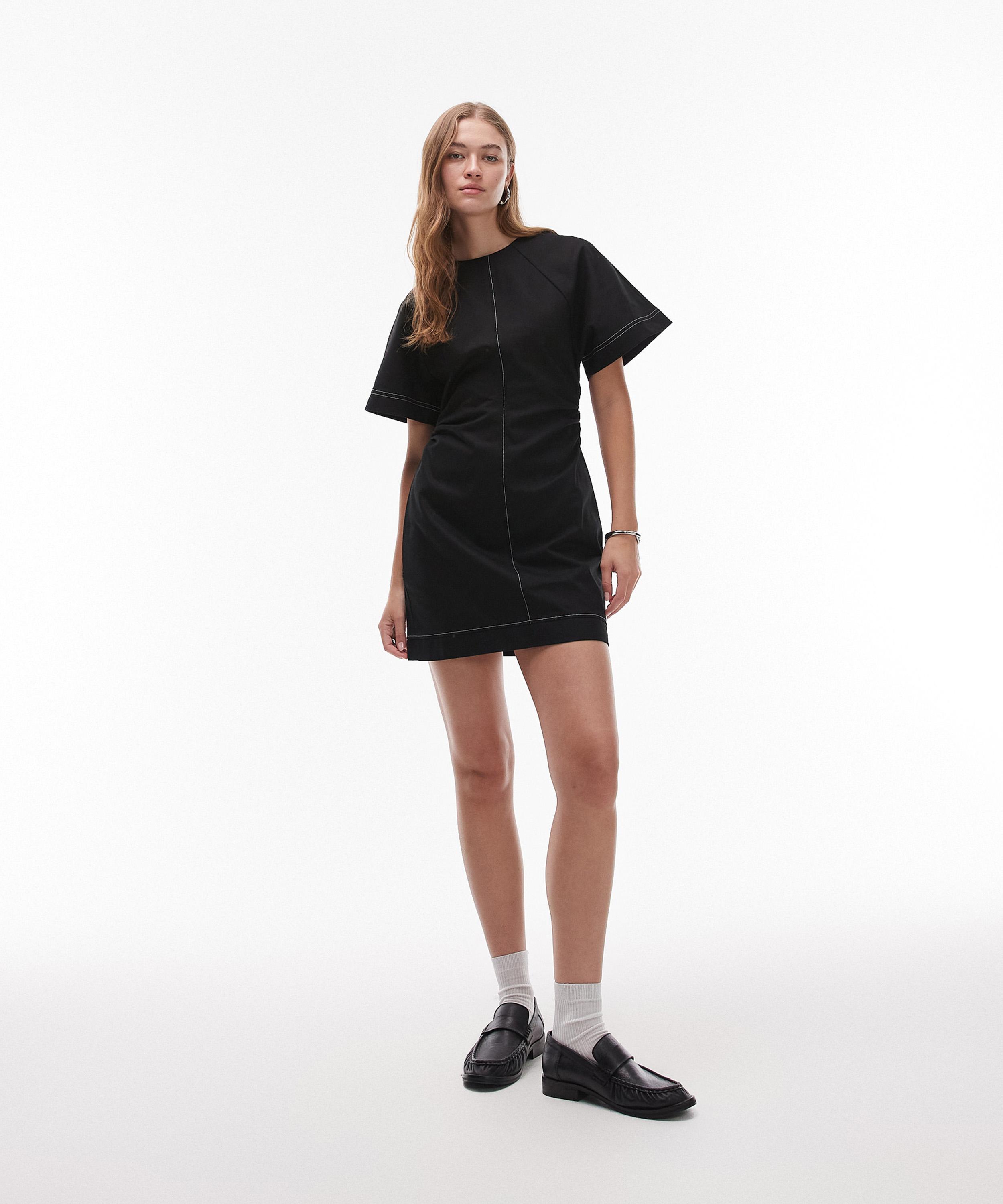 Crafted from a heavy, semi-structured twill and detailed with contrast white topstitching, this mini dress features a boxy silhouette with a crew neckline, short sleeves, and a ruched waist that adds a softly gathered finish.