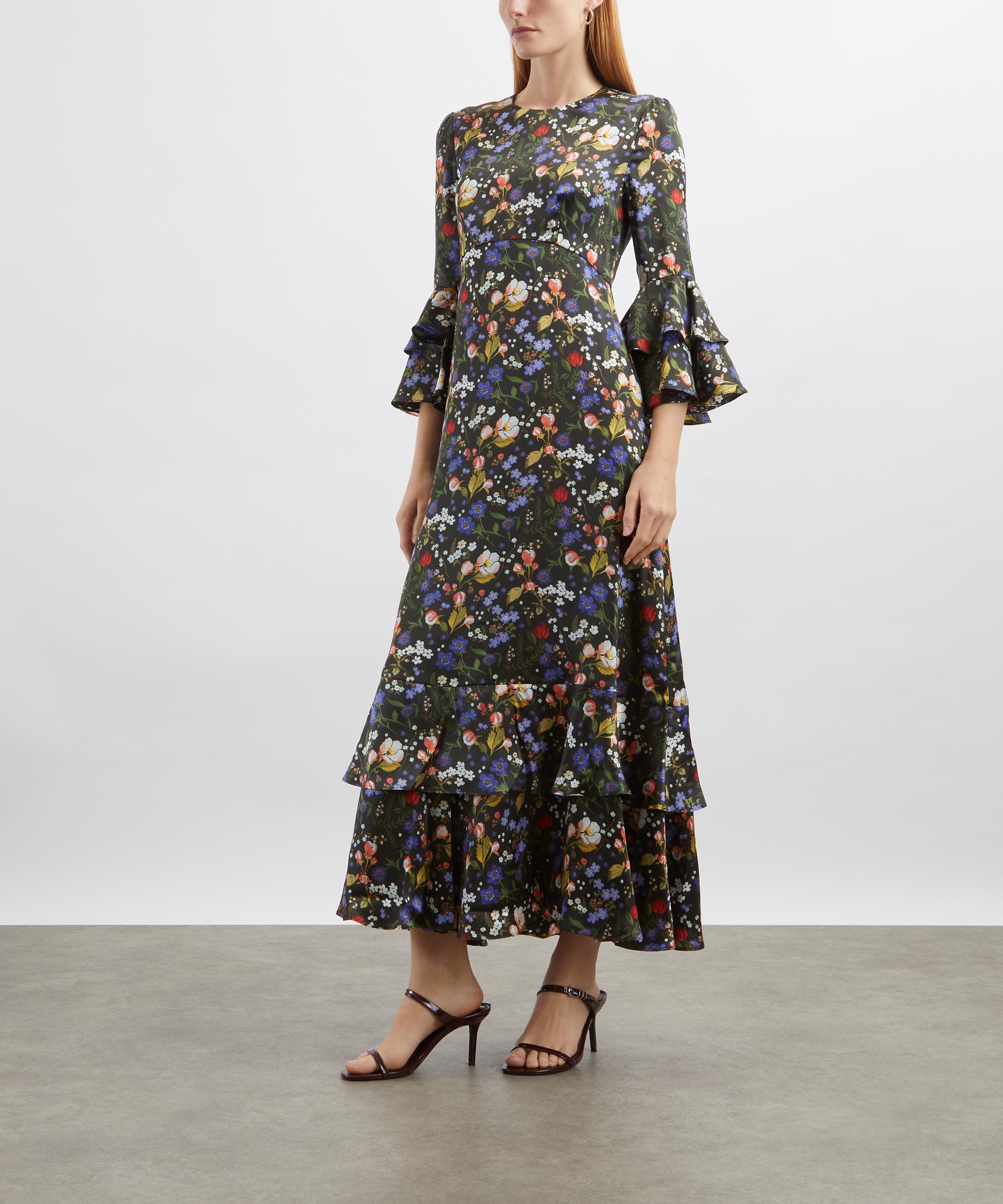 Cut from lustrous Silk-Satin, it’s designed to flatter with its elegant empire waist and sweeping A-line silhouette. A true statement piece, it’s defined by flouncy pagoda sleeves and a softly tiered hem—blending timeless femininity with a playful edge.