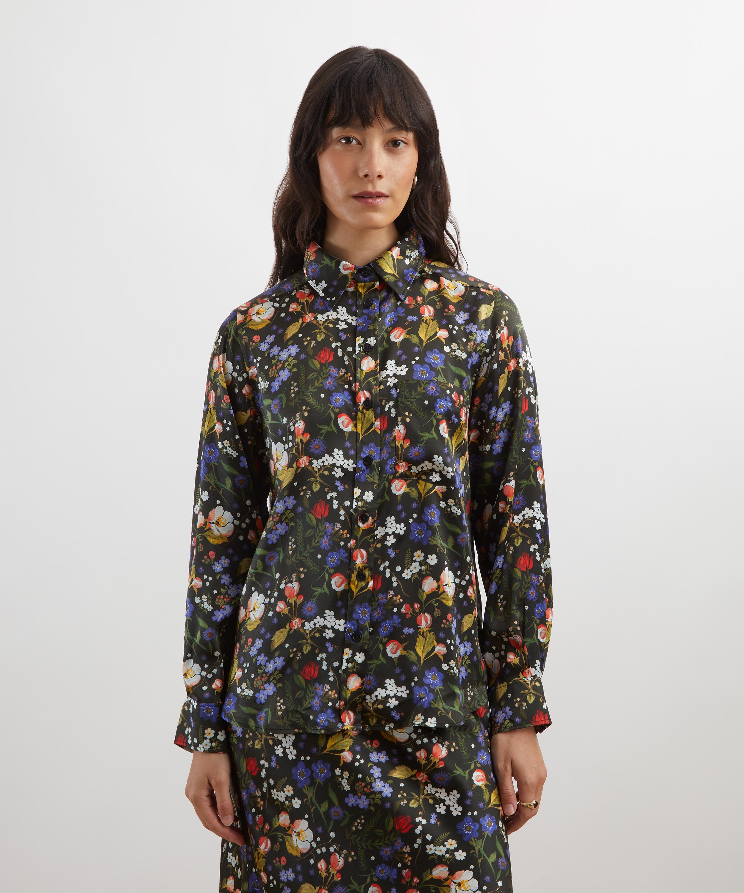Crafted from silk satin, this sleek shirt is adorned with our Heidi print. The Heidi print draws inspiration from the fresh blooms of mountain flora, its feminine and youthful forms shimmering with Alpine cool. Traditional hand-painted flowers evoke the chaotic beauty of mountain meadows.