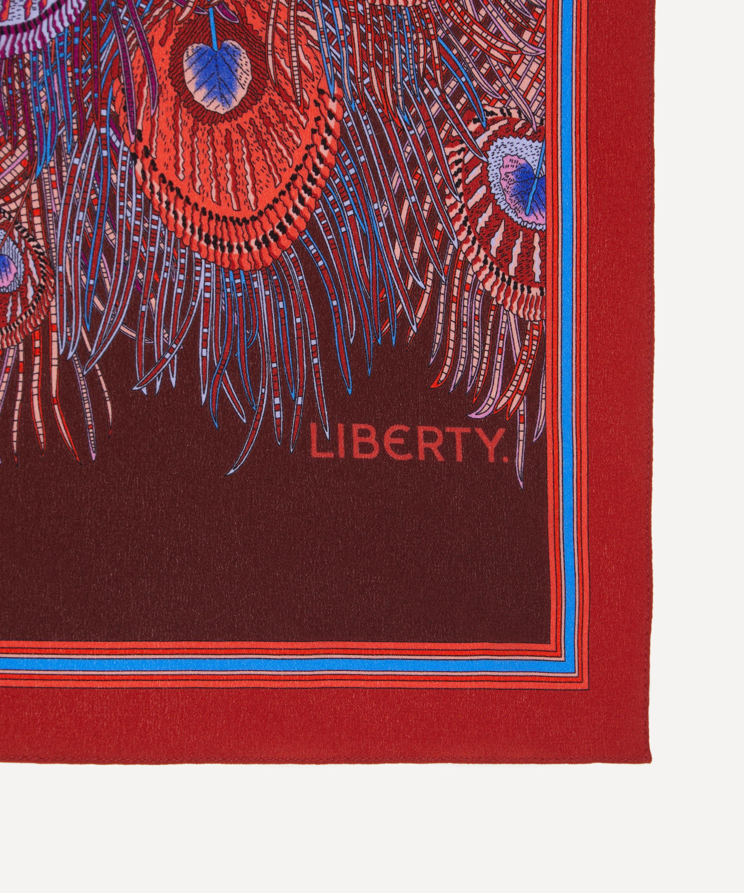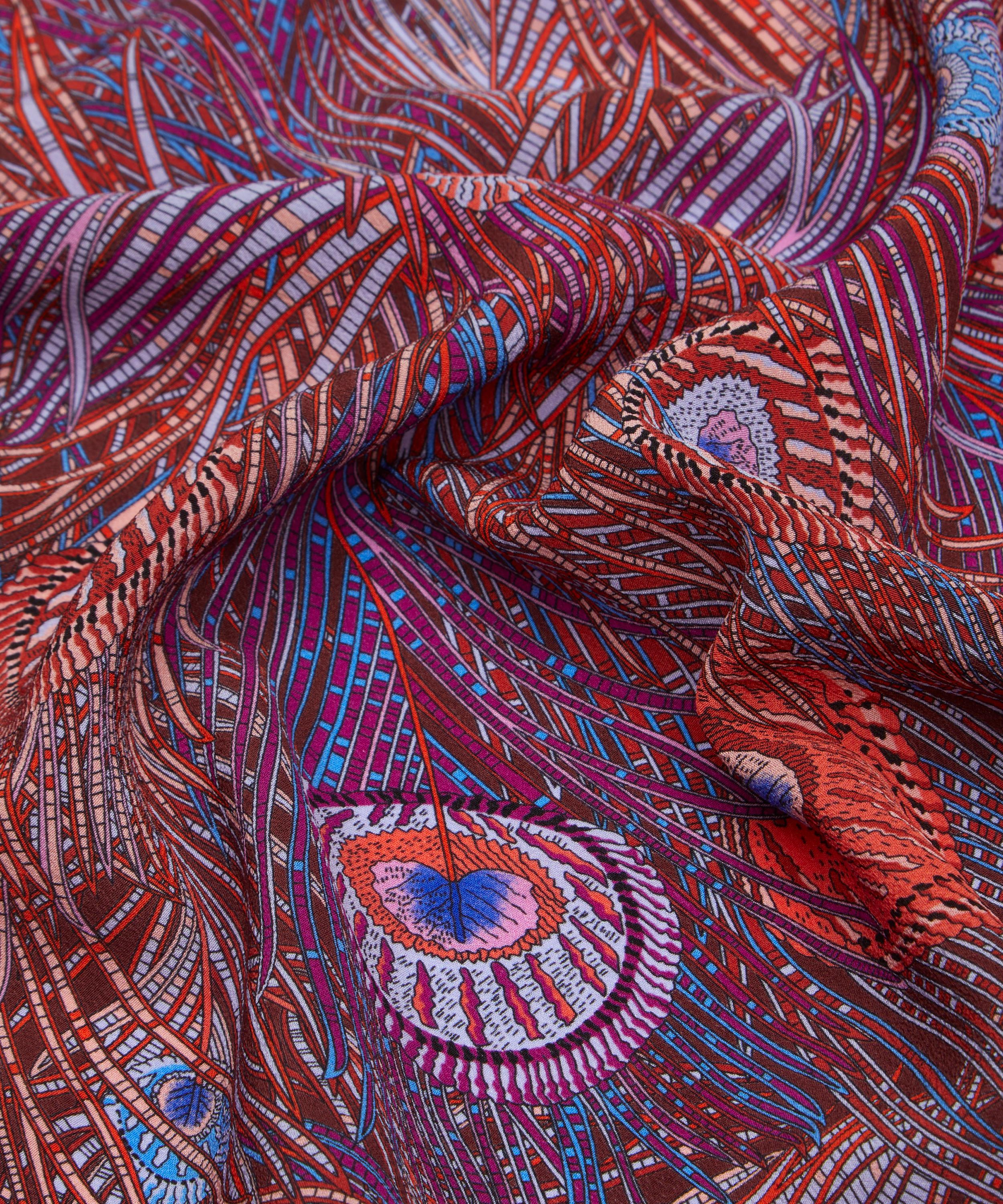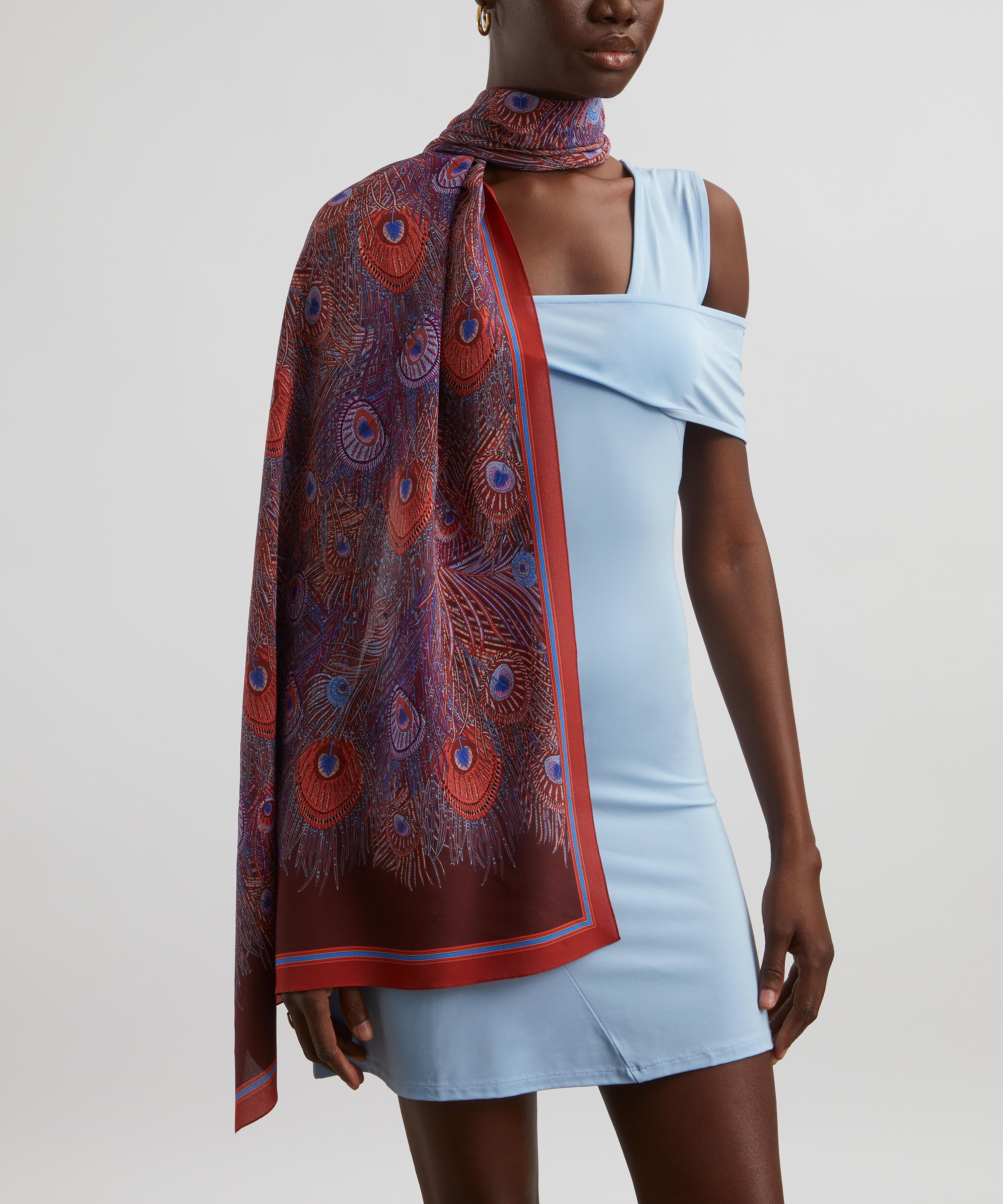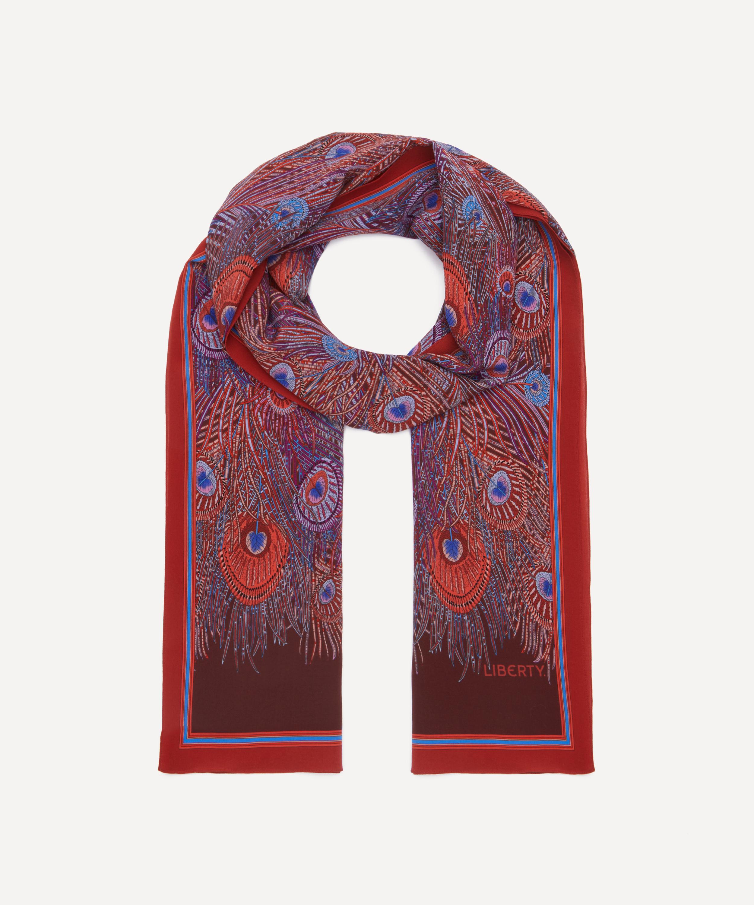 Embody classic elegance in this exquisite Liberty silk crepe de chine scarf. Credited to an 1887 design by Arthur Silver, founder of the Silver Studio, Hera has been a Liberty favourite since the mid 1890s when it was first printed onto Liberty furnishing fabrics. The peacock feather was a frequently used symbol during the Aesthetic Movement of the 1880s.