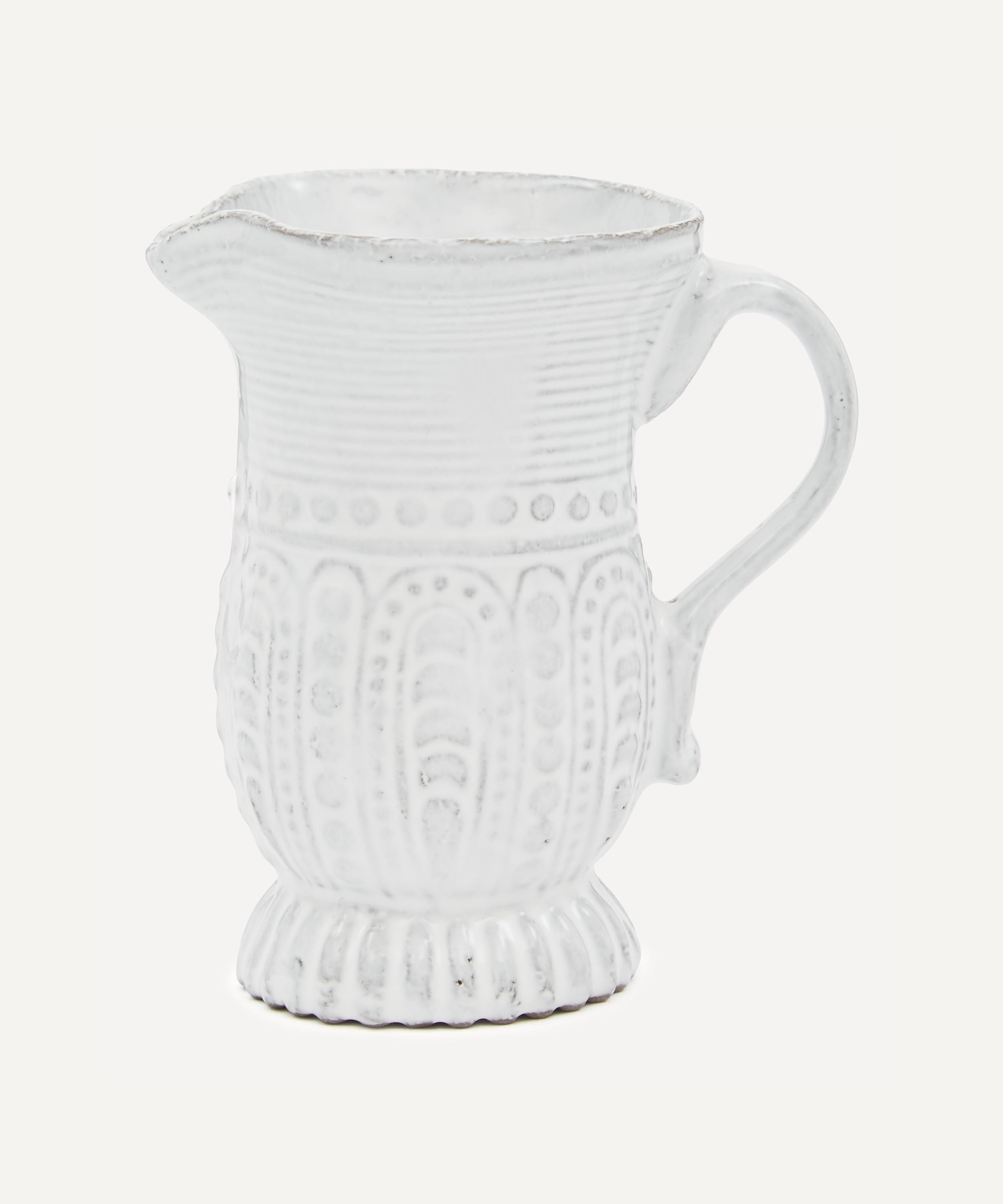 Votary of pre-industrial fabrication, Astier de Villatte is celebrated for being the one and only studio in Paris to hold and harbour the traditions of artisanal ceramic production. Restoring the ancestral systems of moulding and stamping, the Hercule pitcher is made using techniques from the Middle Ages which involve moulding a sheet of handmade clay, double firing the ‘biscuit’ piece and glazing the product in white enamel – a lengthy process that requires a drying time of up to one month. Characterised by its patterned exterior and idiosyncratic spout, the jug is engraved with the brand’s signature crest - depicting an interlacing A & V - alongside the initials of one of the 40 master artisans who created it. Each handmade piece tells a beautiful story, it romances and imparts a sense of nostalgia into its owner. Arrange with other serveware in the collection to breathe an air of authenticity into your dining collection.