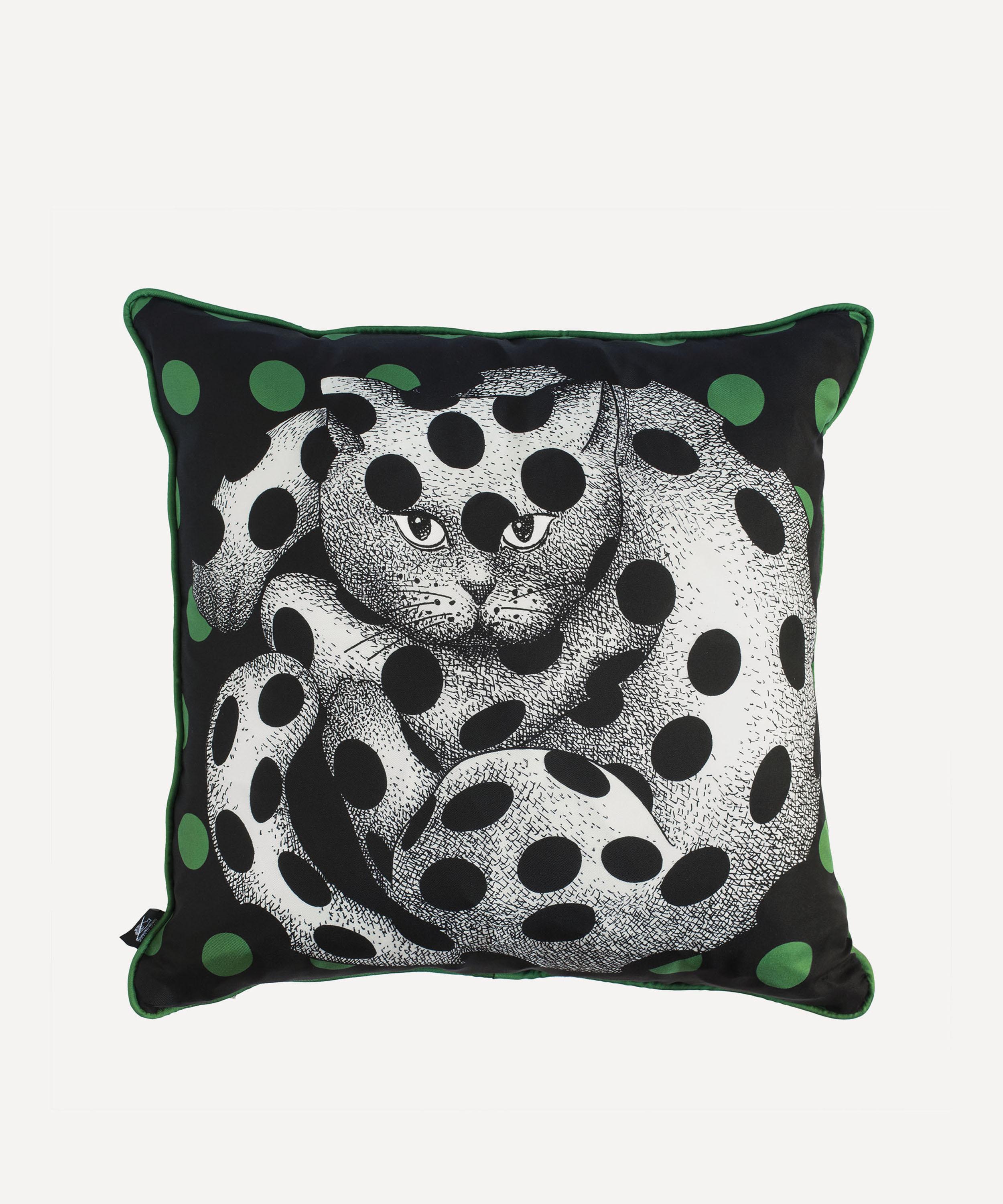 Breathe wit, imagination and ever-present eclectic style into your home with this cushion from Fornasetti - designed for the daringly creative. Featuring a cat and polka dot pattern, this cushion has been expertly handcrafted in Italy from a plush silk fabric, fusing the brand’s design-led surrealism with tasteful Italian beauty. Pair with other pieces from the range for a thematic feel, or standalone against a love-worn sofa or contemporary chaise for a grandiloquent interior pop.