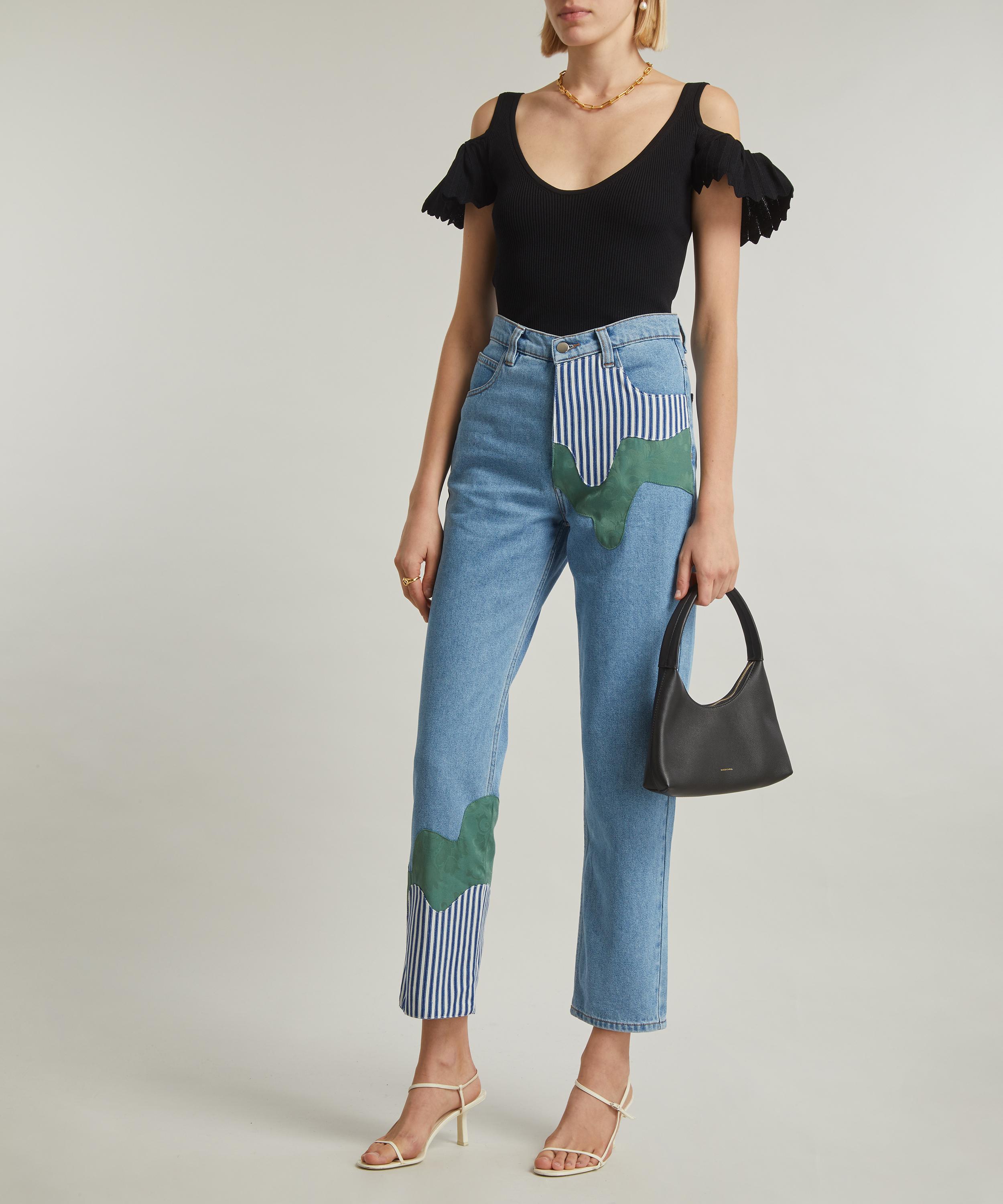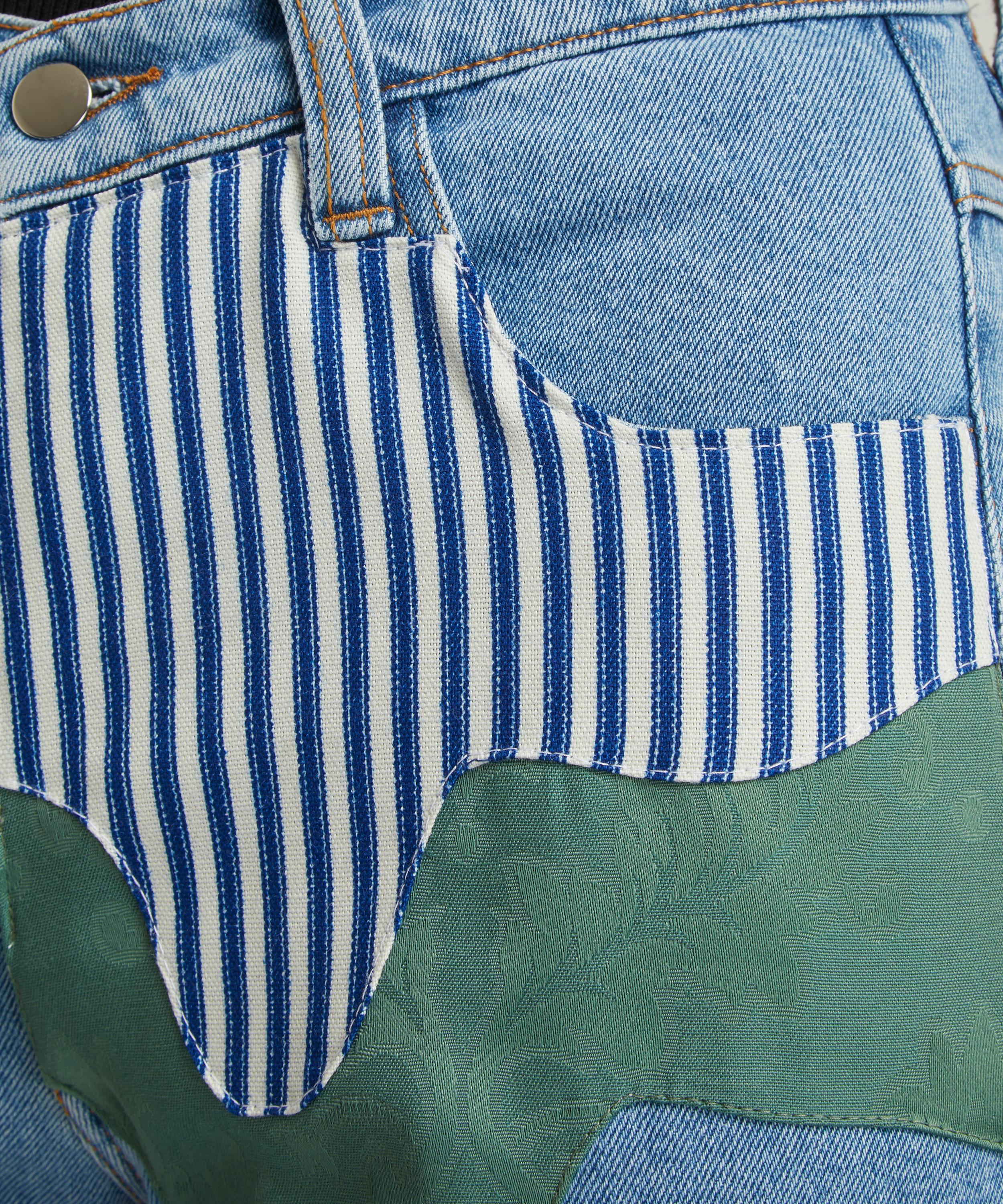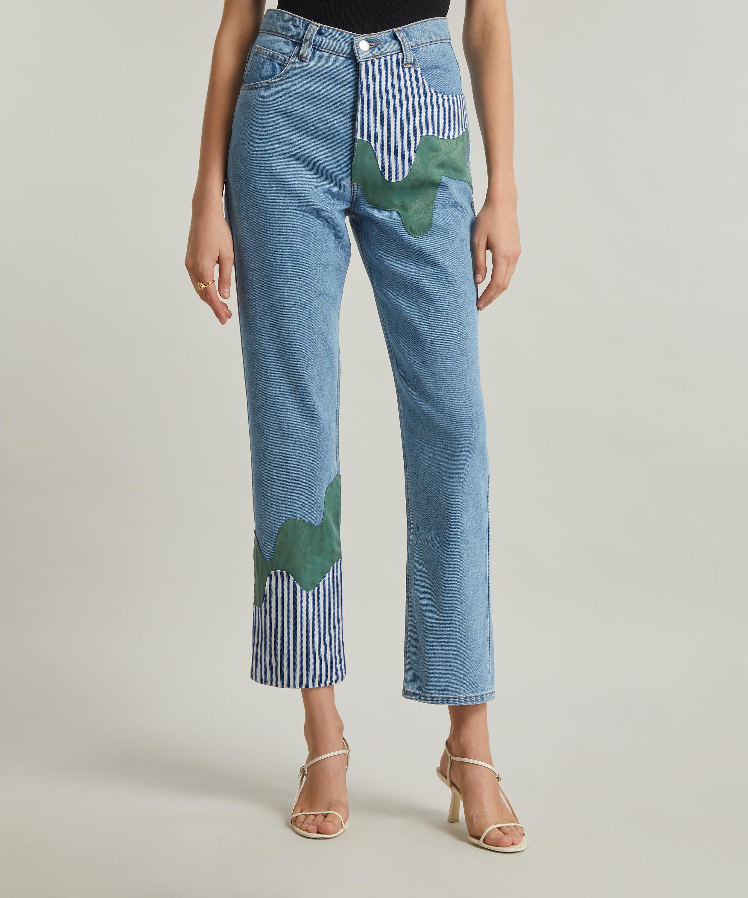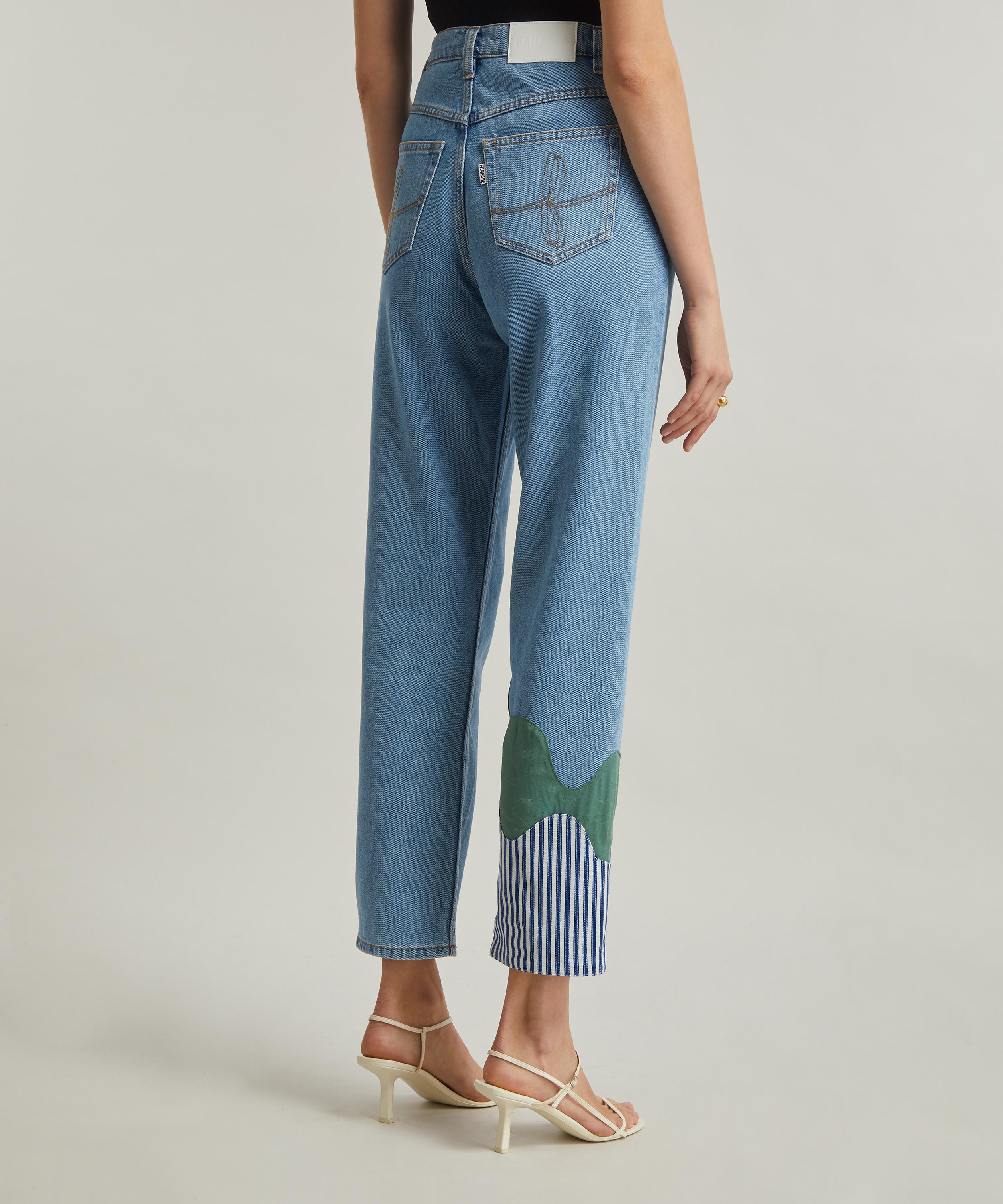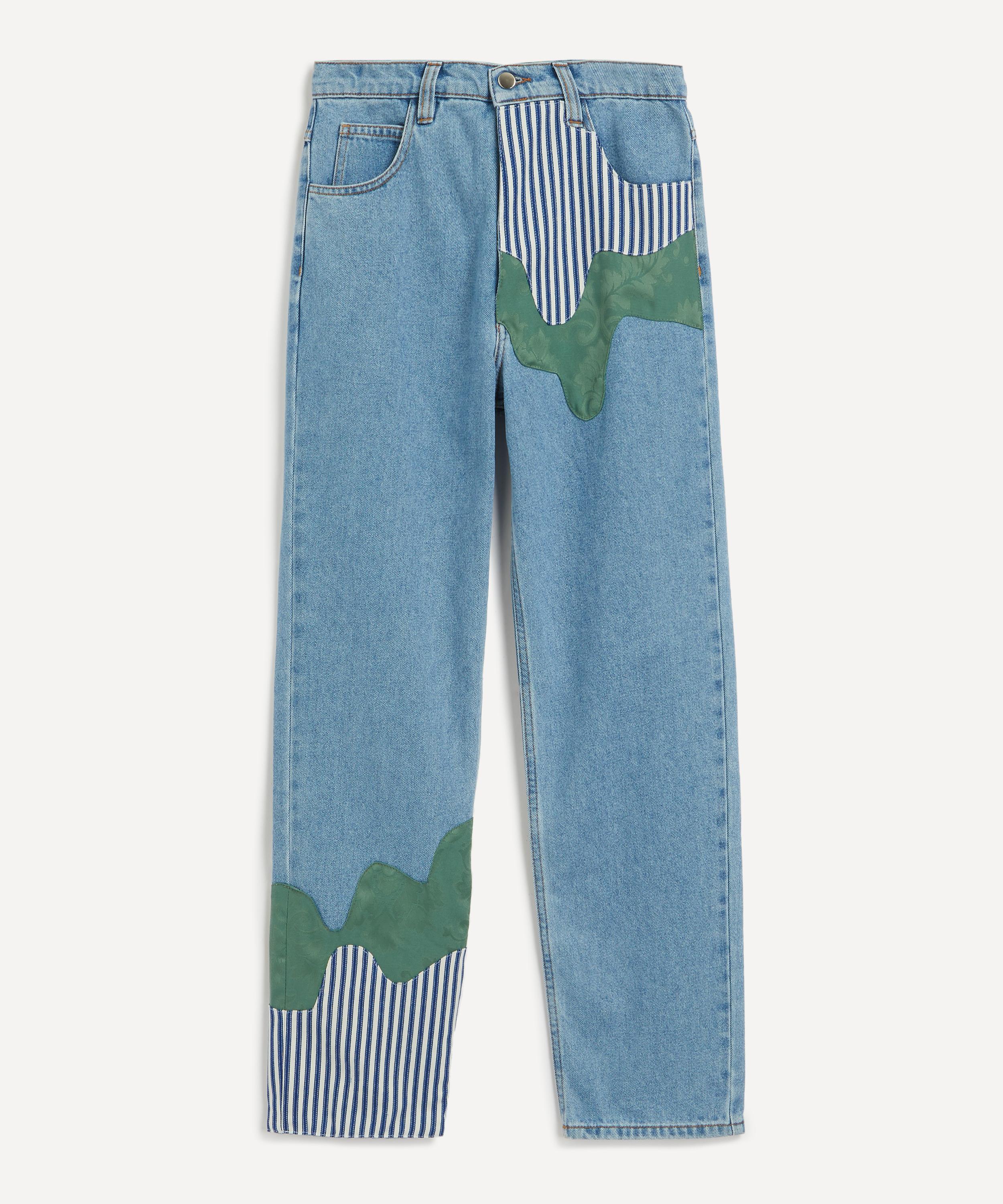 Cut from mid-wash blue denim, these high waisted ‘mom’ style jeans boast a relaxed fit with rolled hems and melt patch decoration made from deadstock fabric and old curtains.