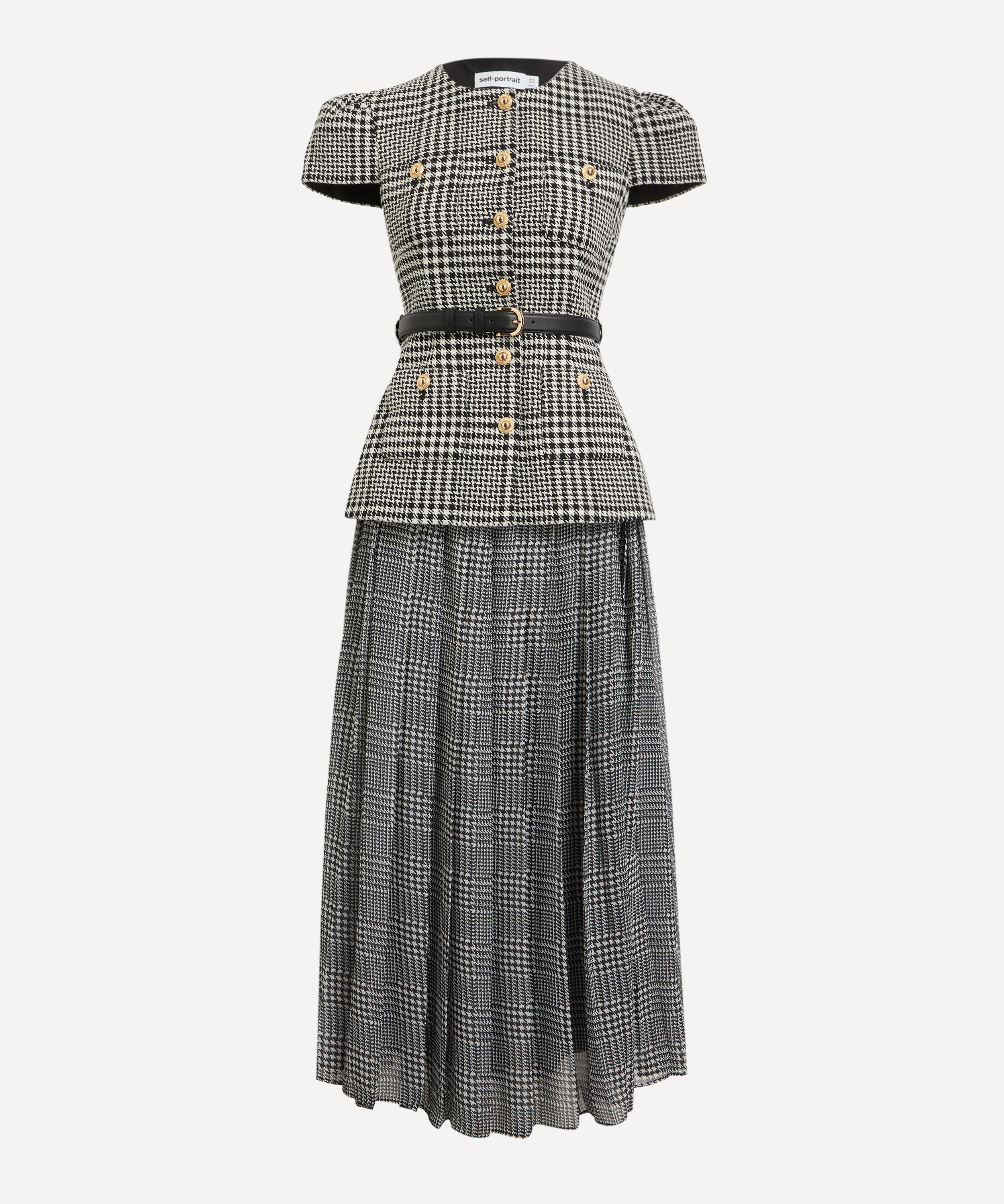 A vision of elegance, this signature tailored midi dress from Self-Portrait is reimagined in classic houndstooth wool check. Consisting of a structured bodice and a pleated chiffon skirt, it’s topped up with gold buttons and a belted waist for a refined, lady-like polish to the piece.