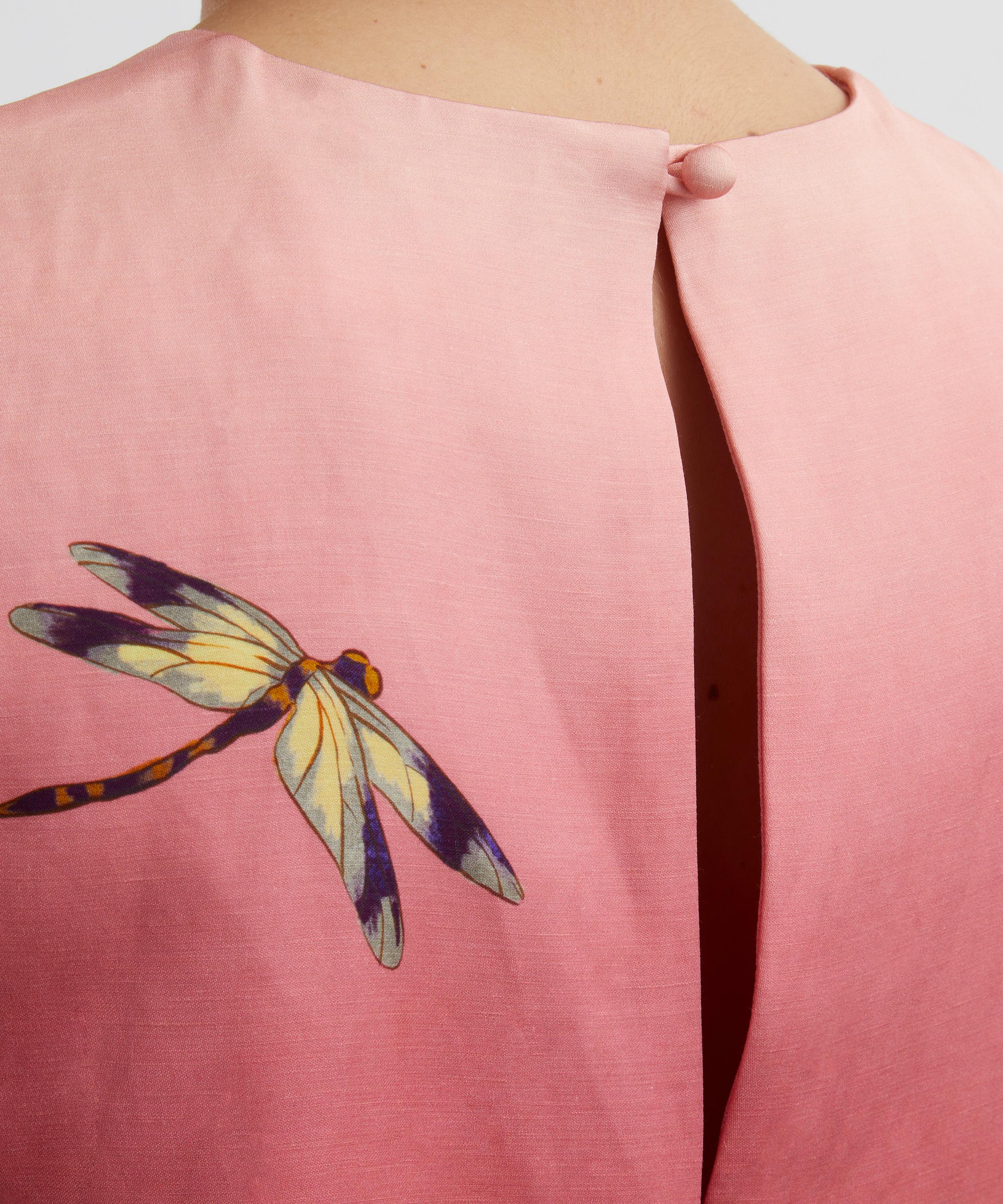 Crafted from a luxurious linen-viscose blend and adorned with a vibrant floral motif, this striking mini shift dress boasts a sleek, super-short silhouette. Designed with a classic round neckline, it offers a refined yet playful take on effortless summer style.