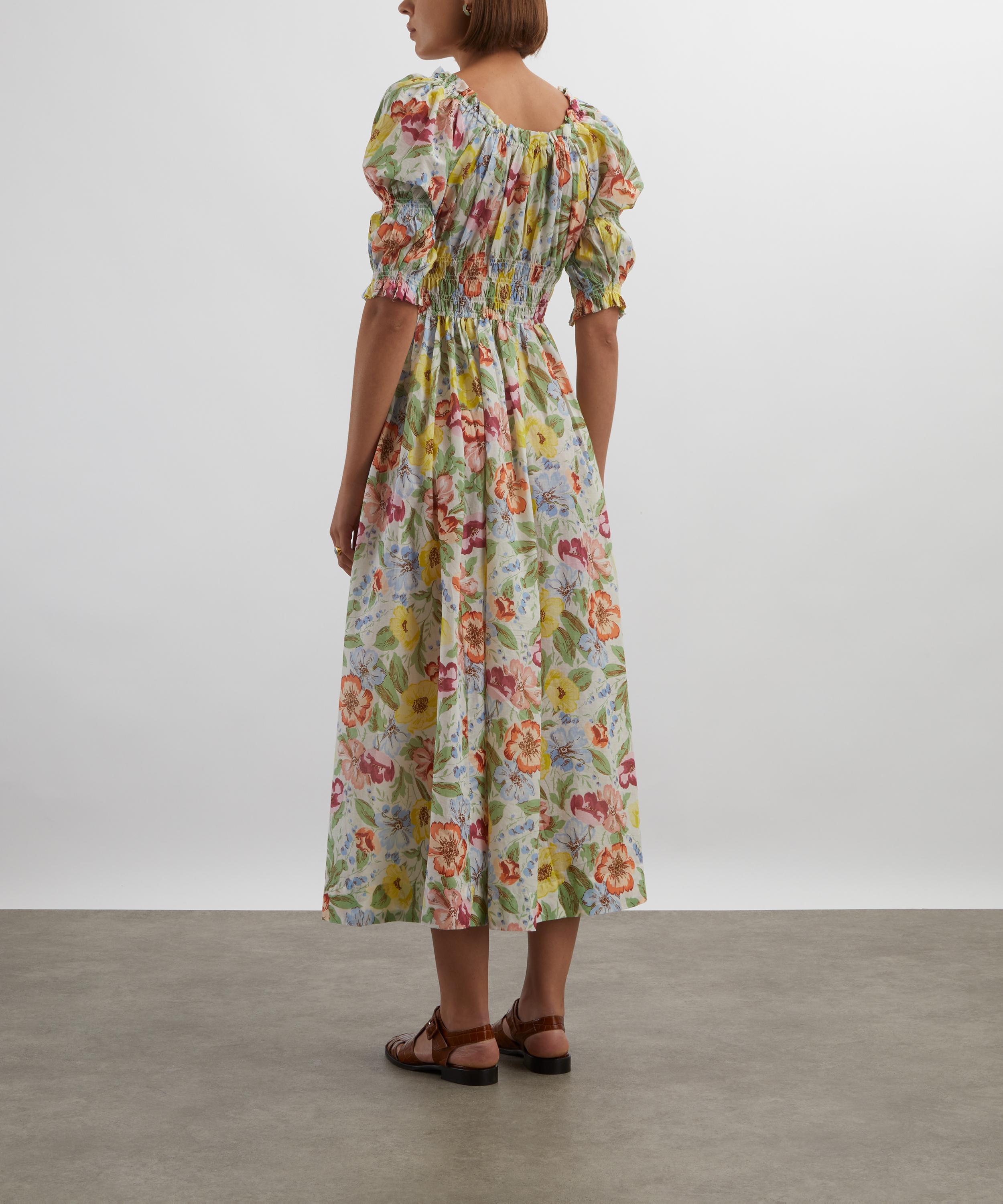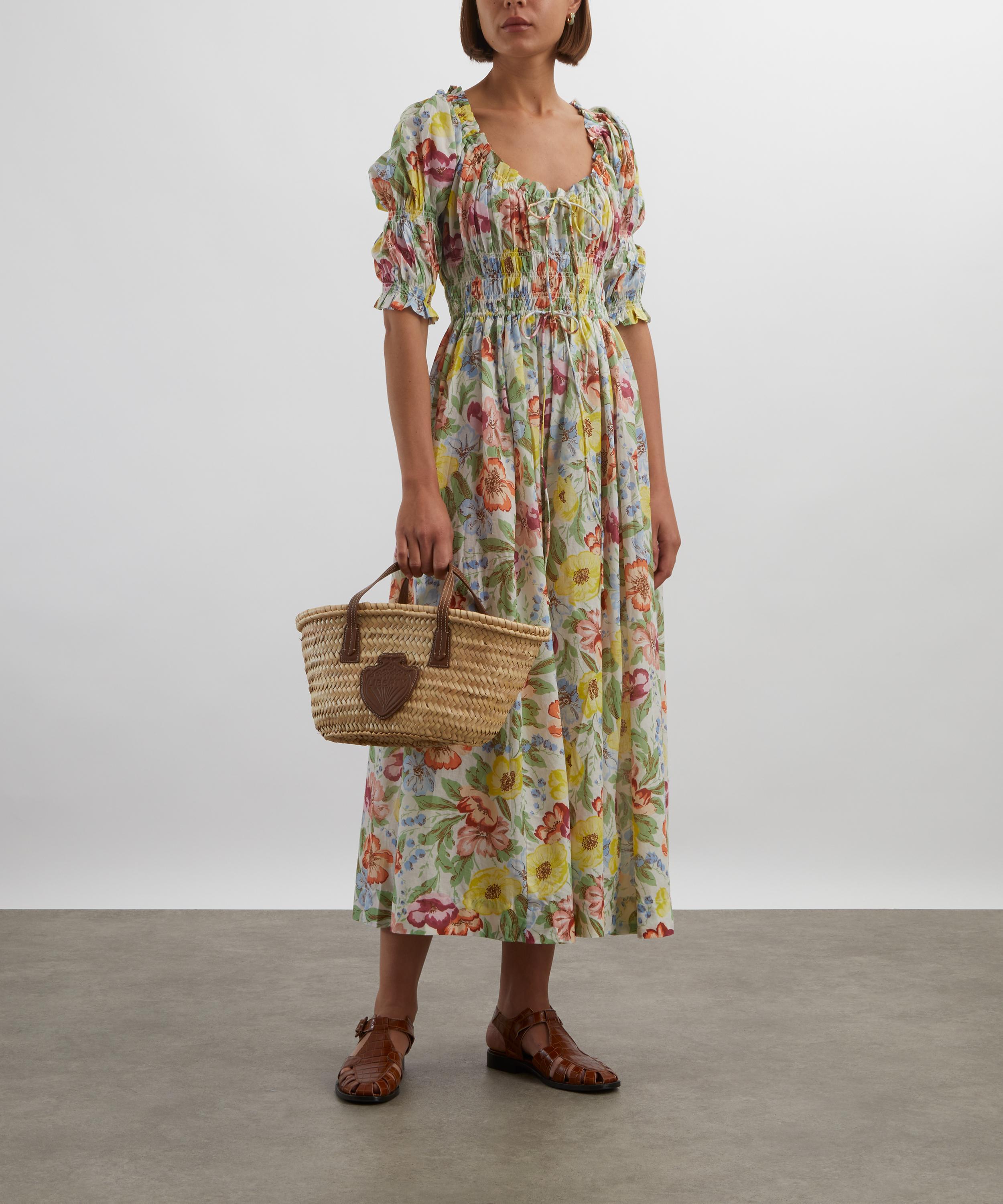 Crafted from soft, lightweight cotton voile adorned with a colourful floral print, the Ischia features a scoop neckline, double-puffed sleeves, and a smocked bodice that flows into a full, ankle-grazing skirt.