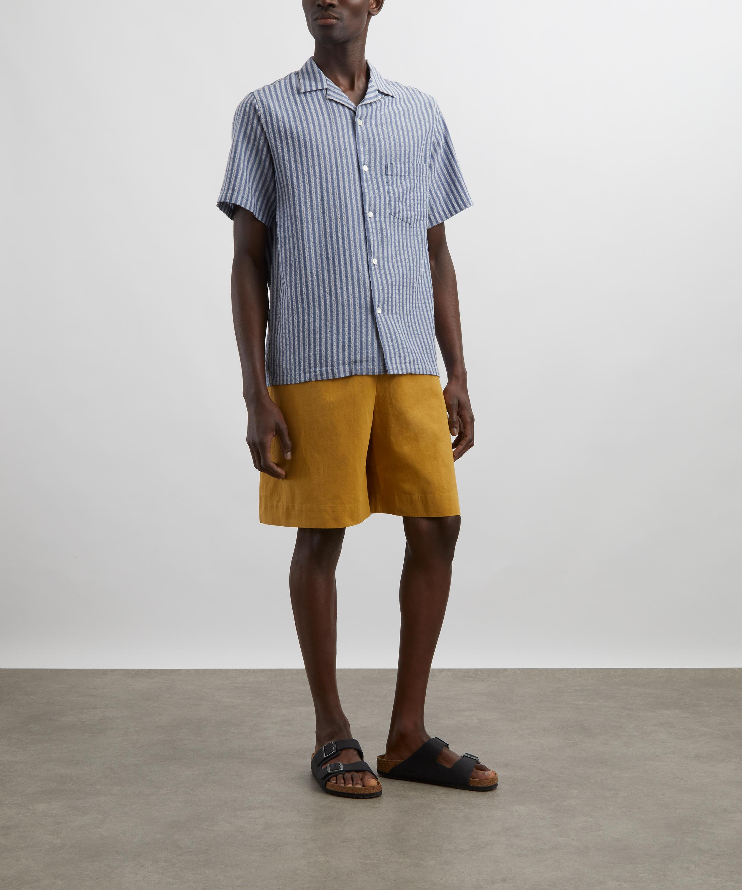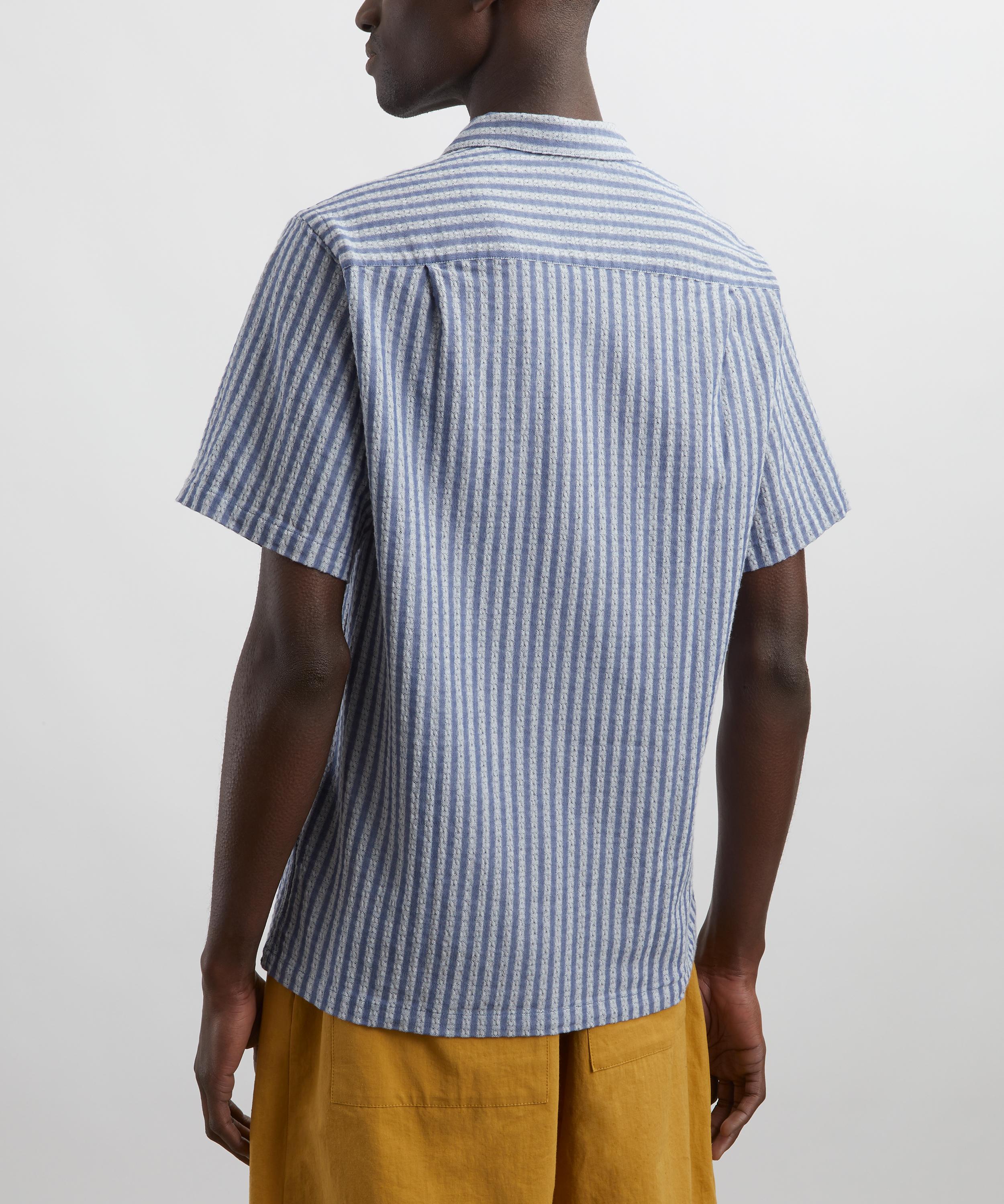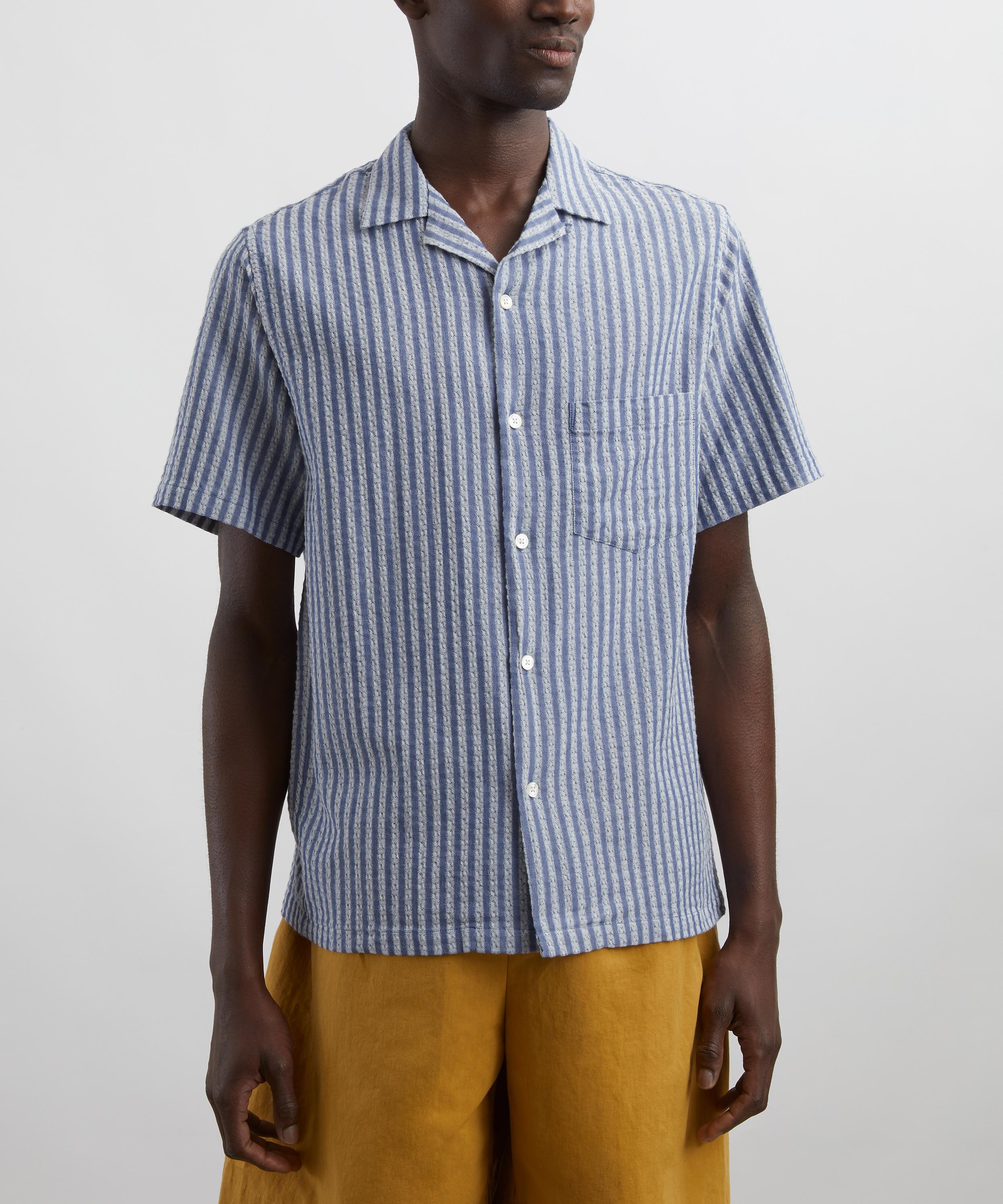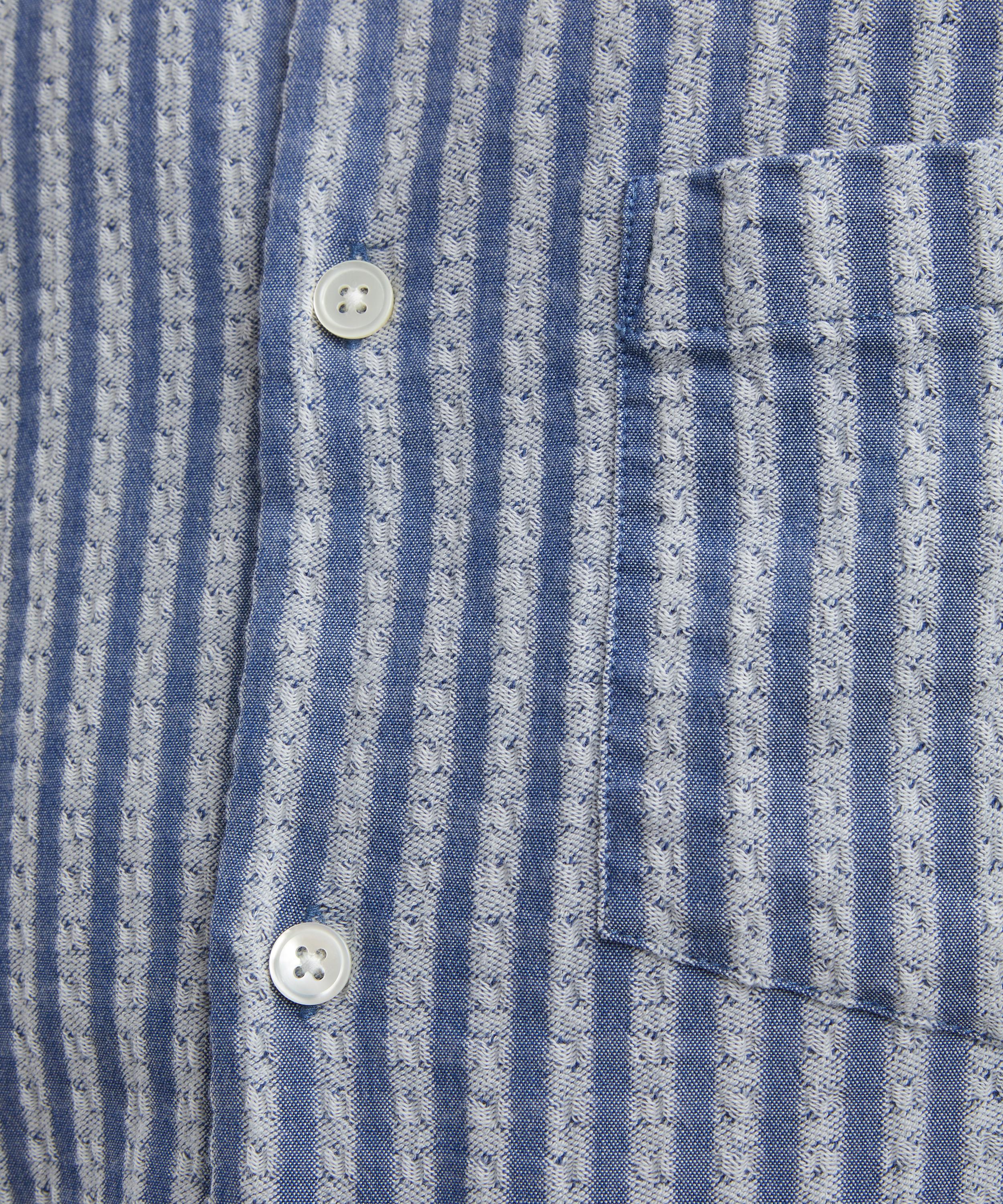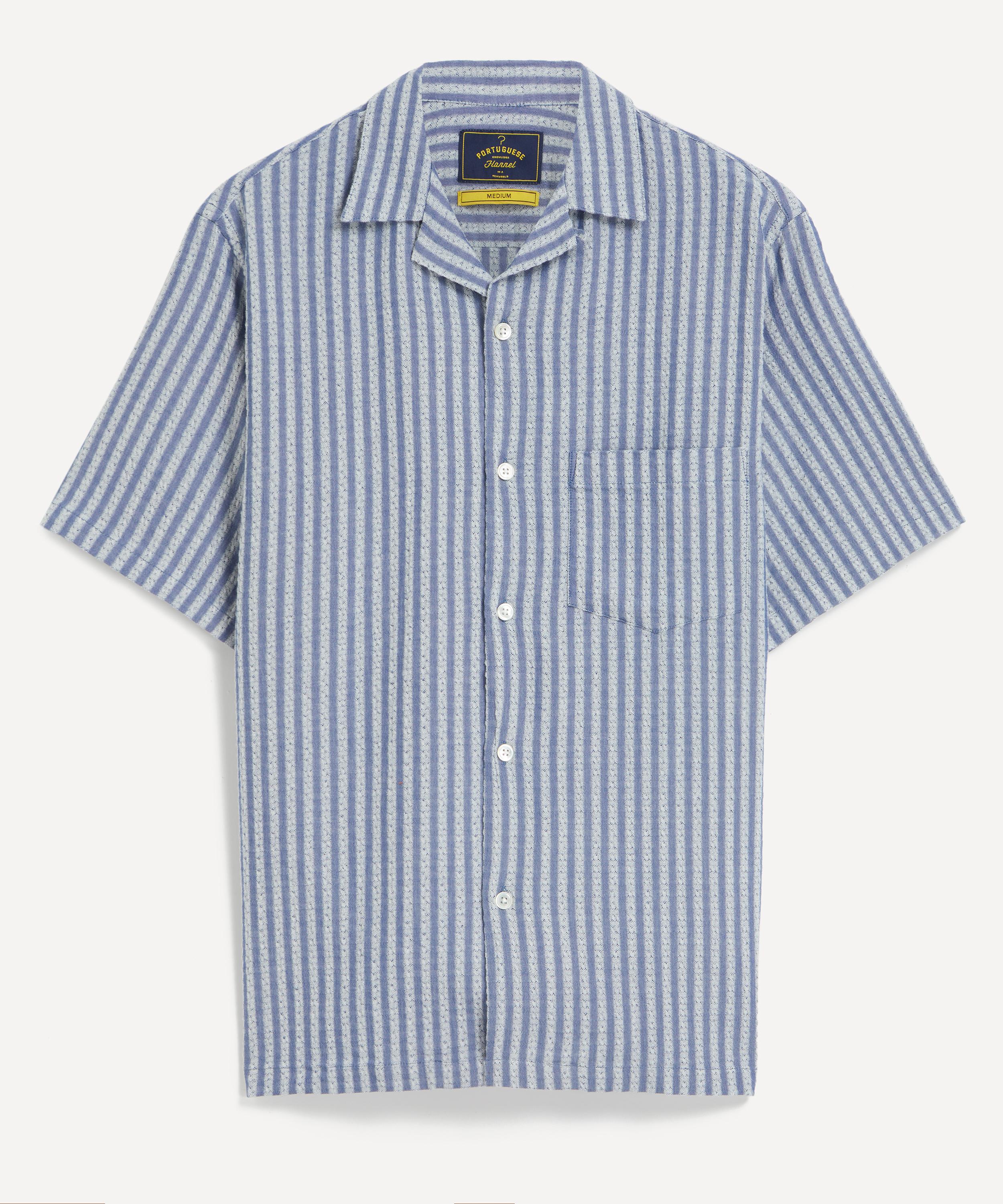 Crafted from premium Portuguese cotton blend using four generations of traditional techniques, this striped jacquard chambray shirt epitomises effortless summer style. Ideal for layering over a tank or top, it showcases a convertible collar, short sleeves, mother-of-pearl button closure, and a chest pocket, offering a relaxed yet versatile style.