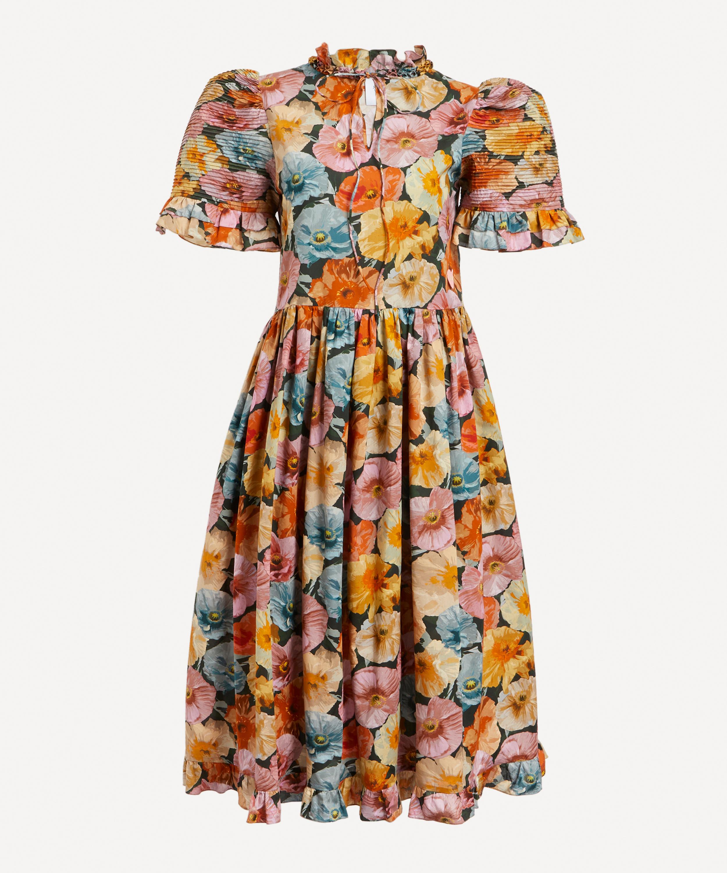 Fusing feminine frills with floral Liberty prints, Munich-based label Horror Vacui presents the Jade dress. Cut from Liberty’s classic Poppy Wonder Tana Lawn™ Cotton to a loose and lightweight A-line silhouette, this dainty dress has a ruffle-trimmed collar, cuffs and hem, and voluminous puffed short-sleeves, complete with hand-smocked Froschgoscherl detailing.