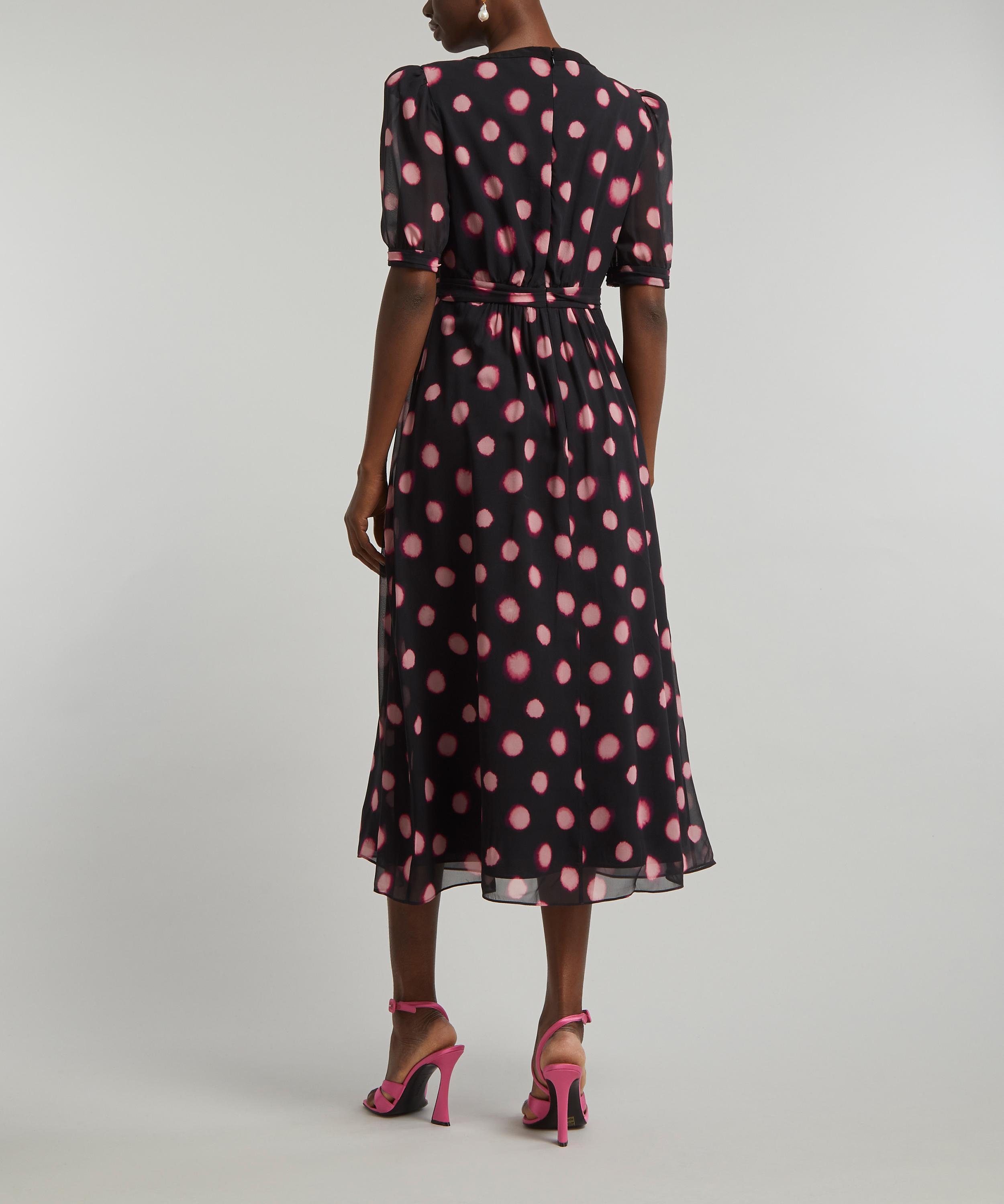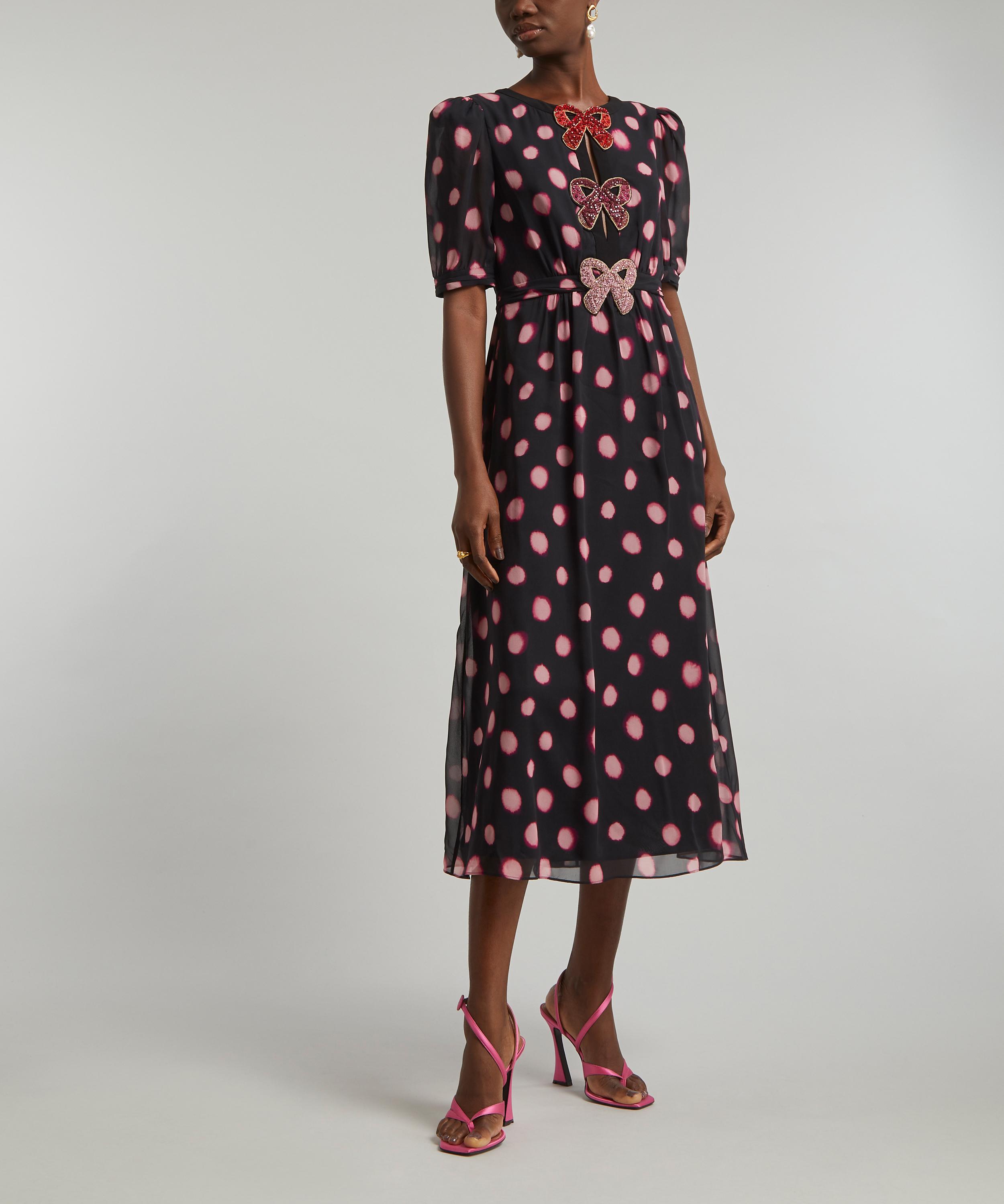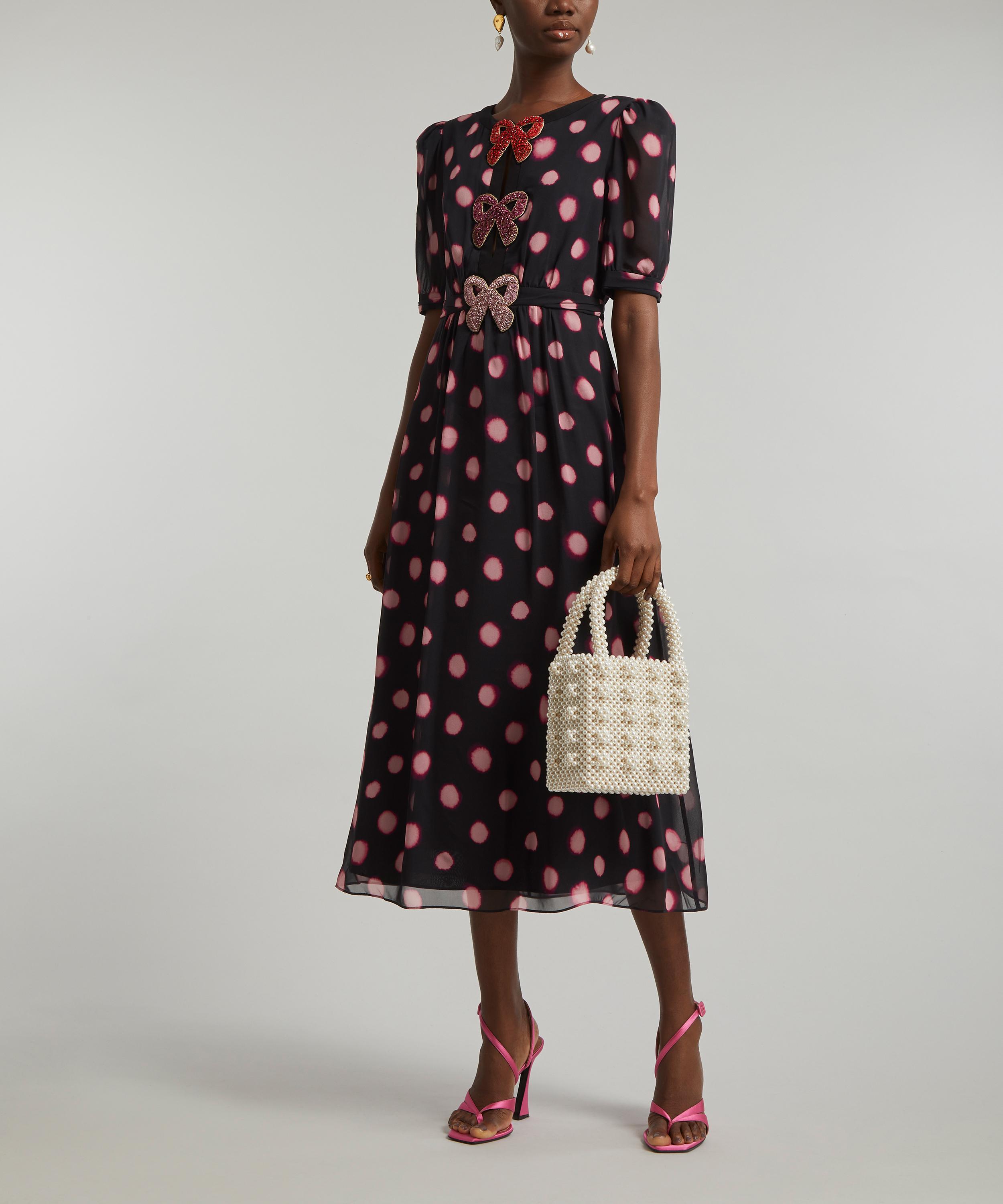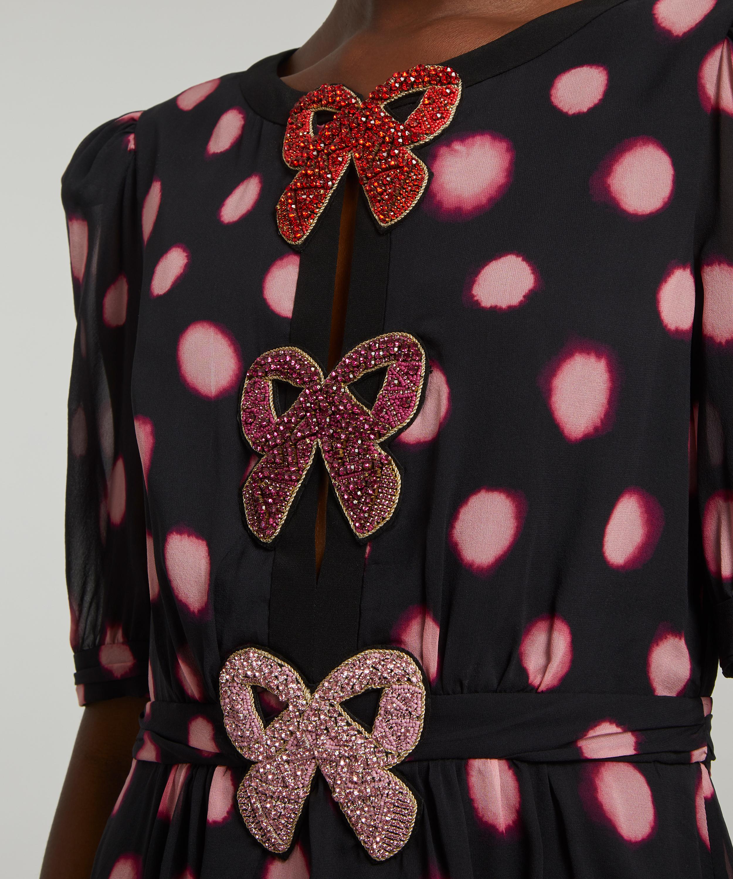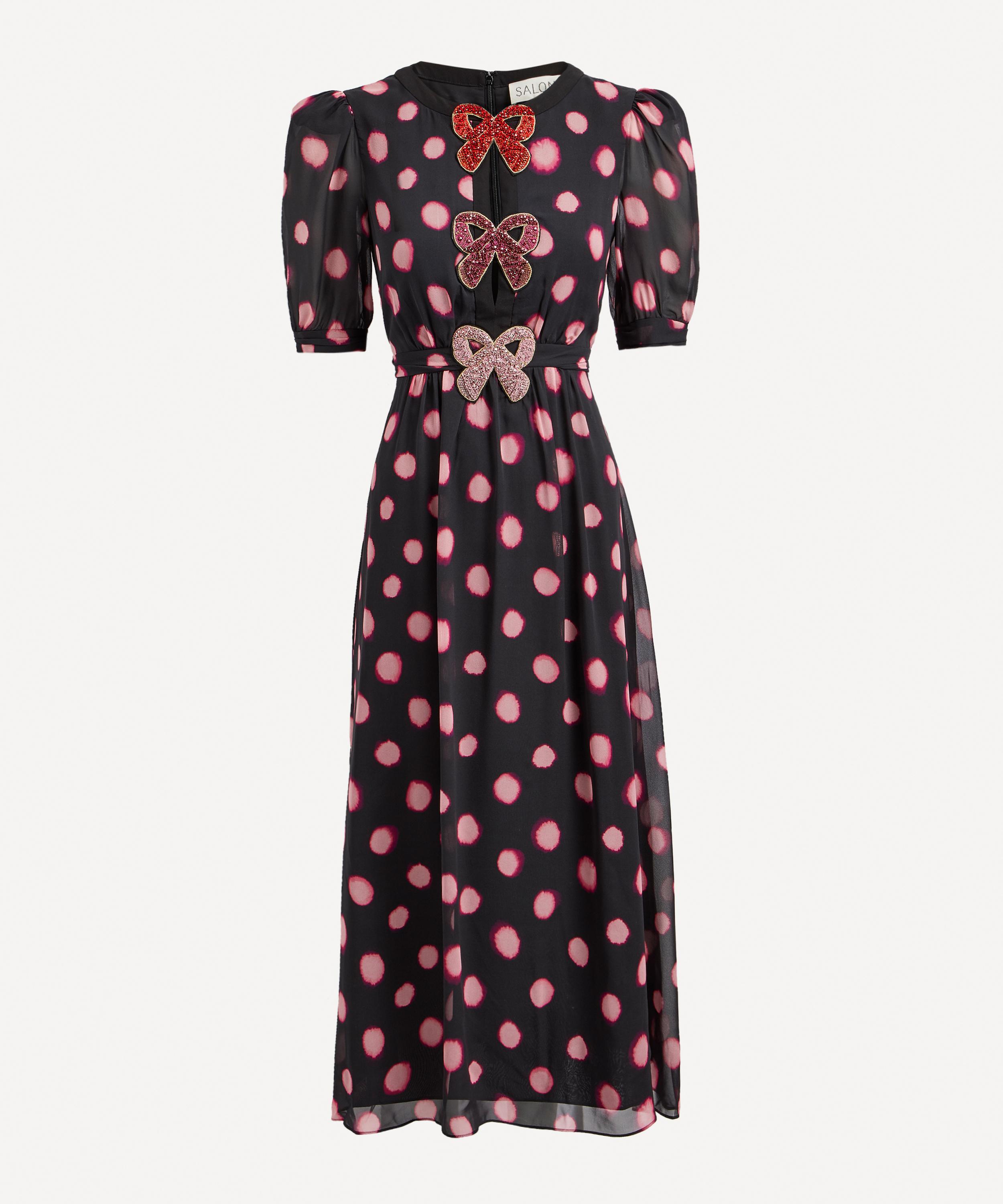 Effortlessly romantic, Saloni’s Jamie dress exudes elegance with its painterly-pink polka-dot pattern. Luxuriously crafted from pure silk and cut to a vintage-inspired, A-line silhouette complete with delicately puffed sleeves, it’s elevated by an alluring split neckline secured with three red to pink pearl and crystal-embellished bows for a dazzling, ombré-effect finish.