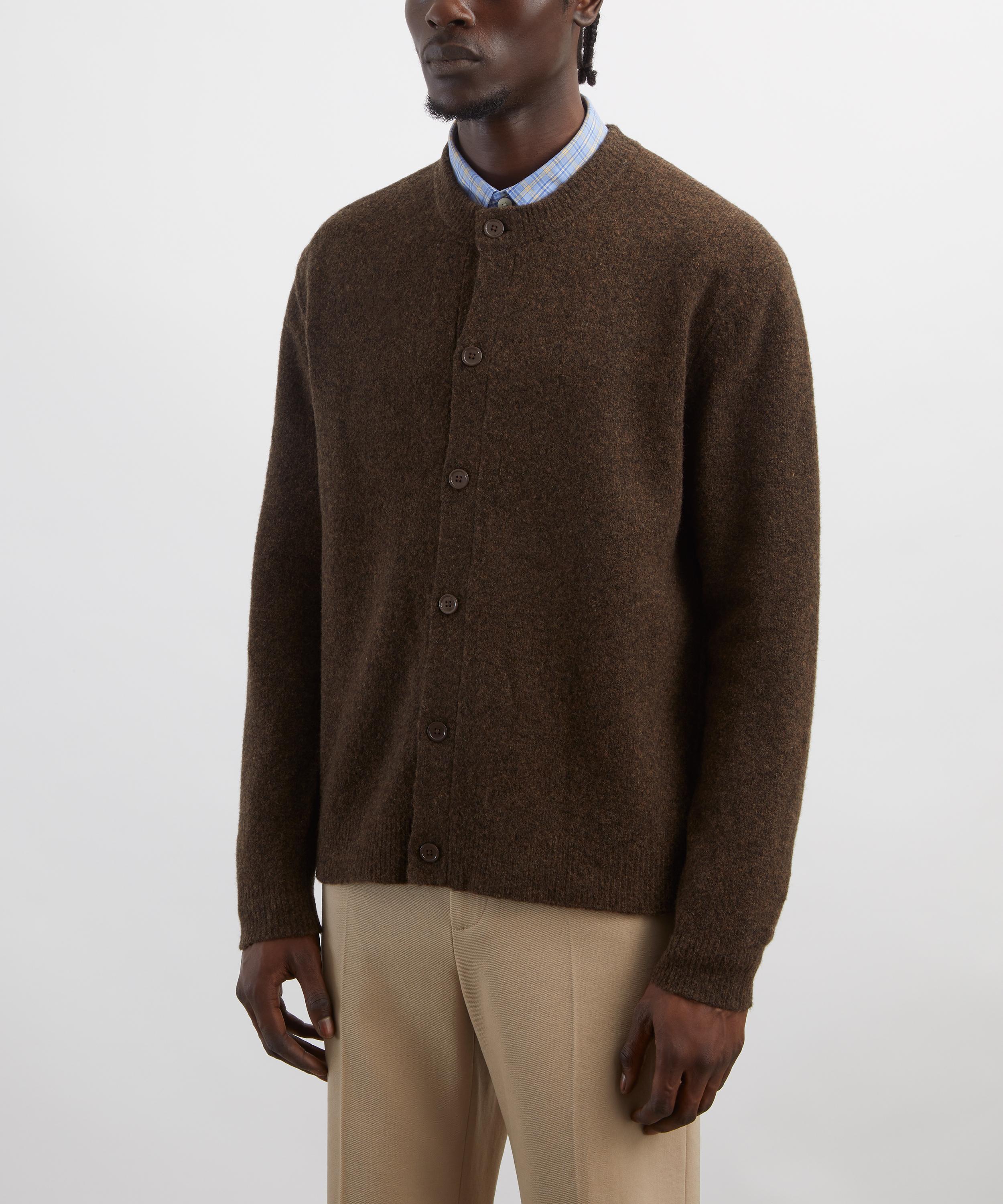 Crafted from a soft, fluffy wool-blend with a tactile bouclé finish, this cardigan is shaped with a crew neckline, river shell-button placket, and ribbed trims. Rendered in rich brown, it’s set to become a winter staple.