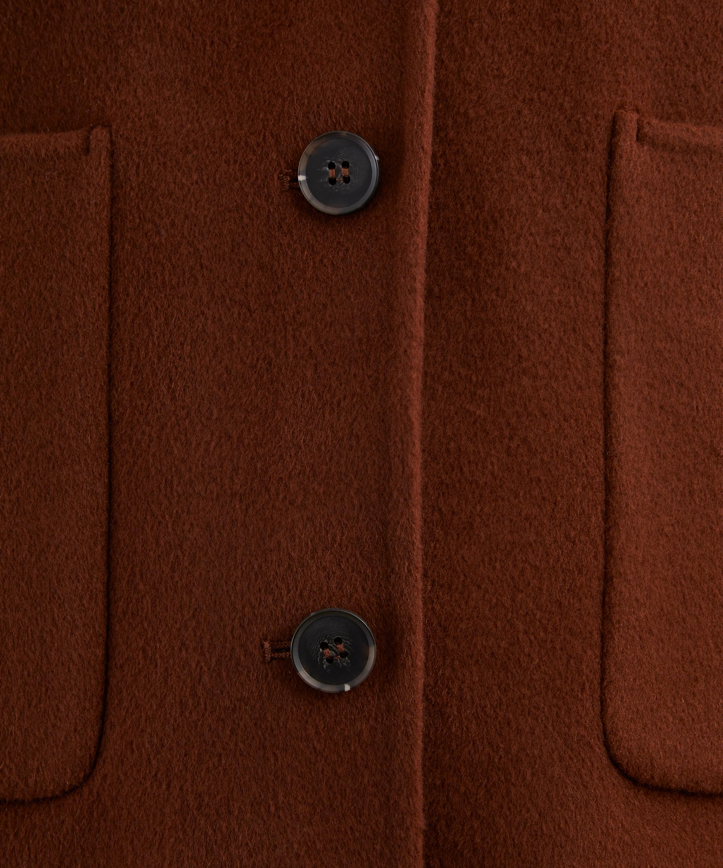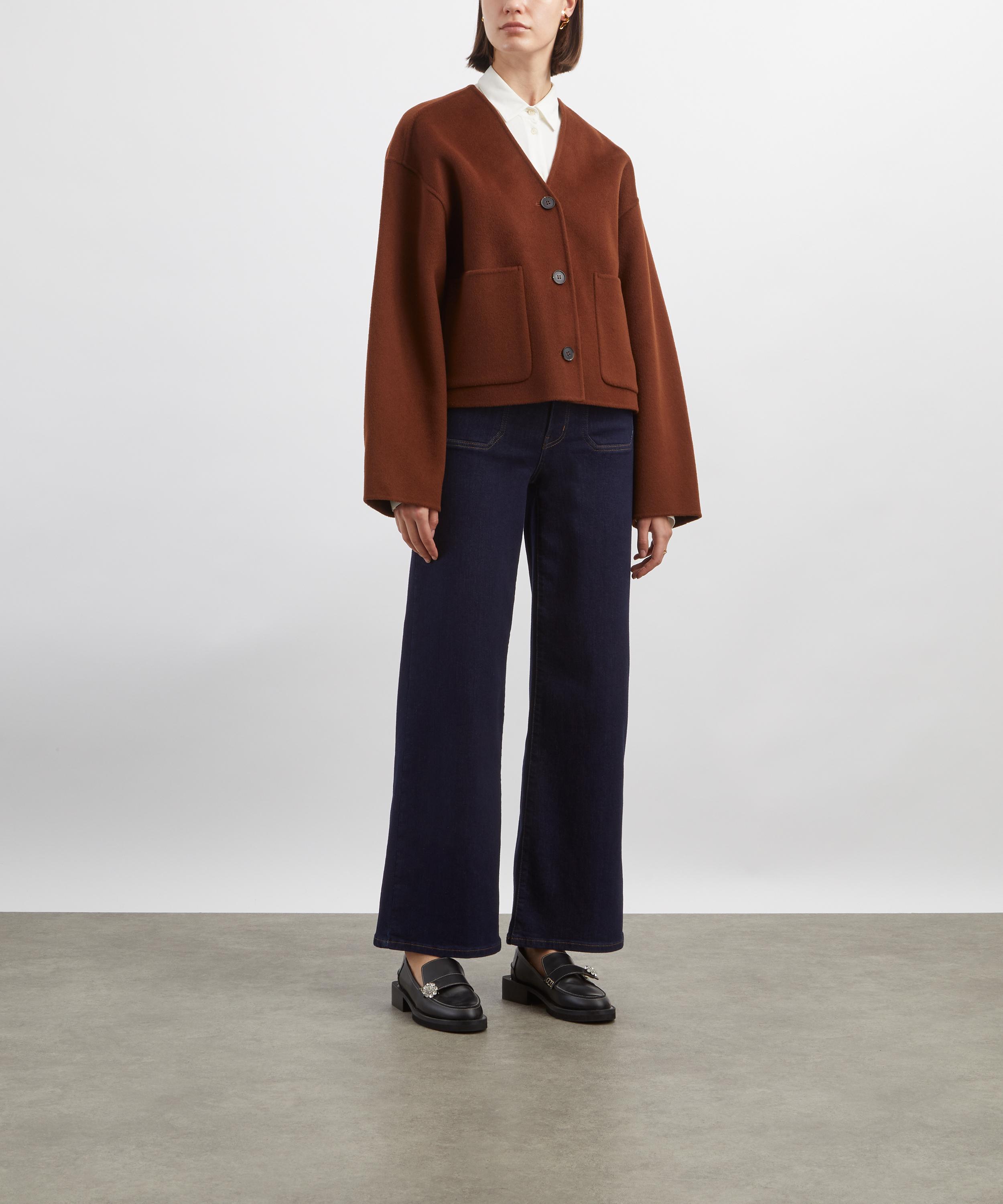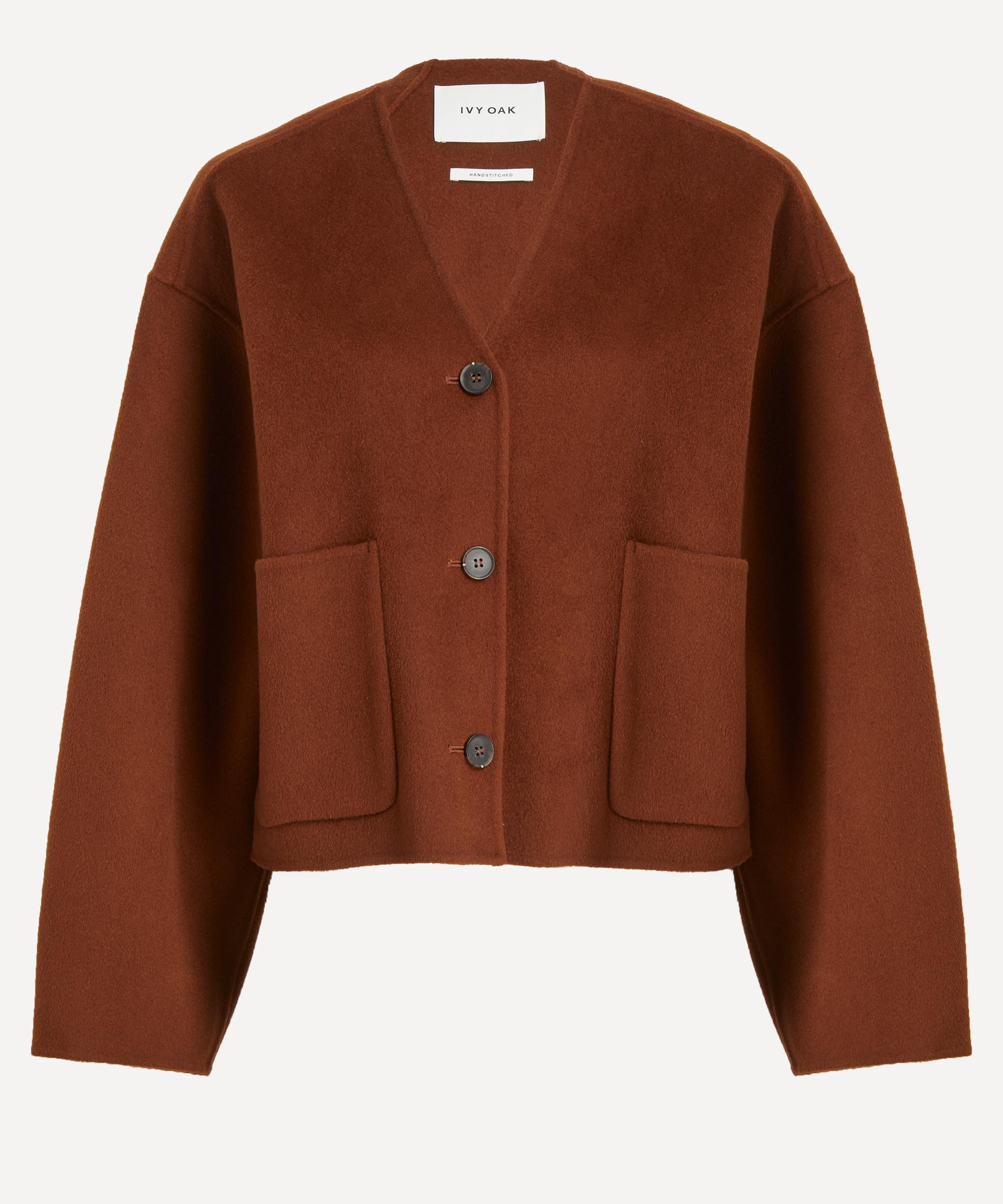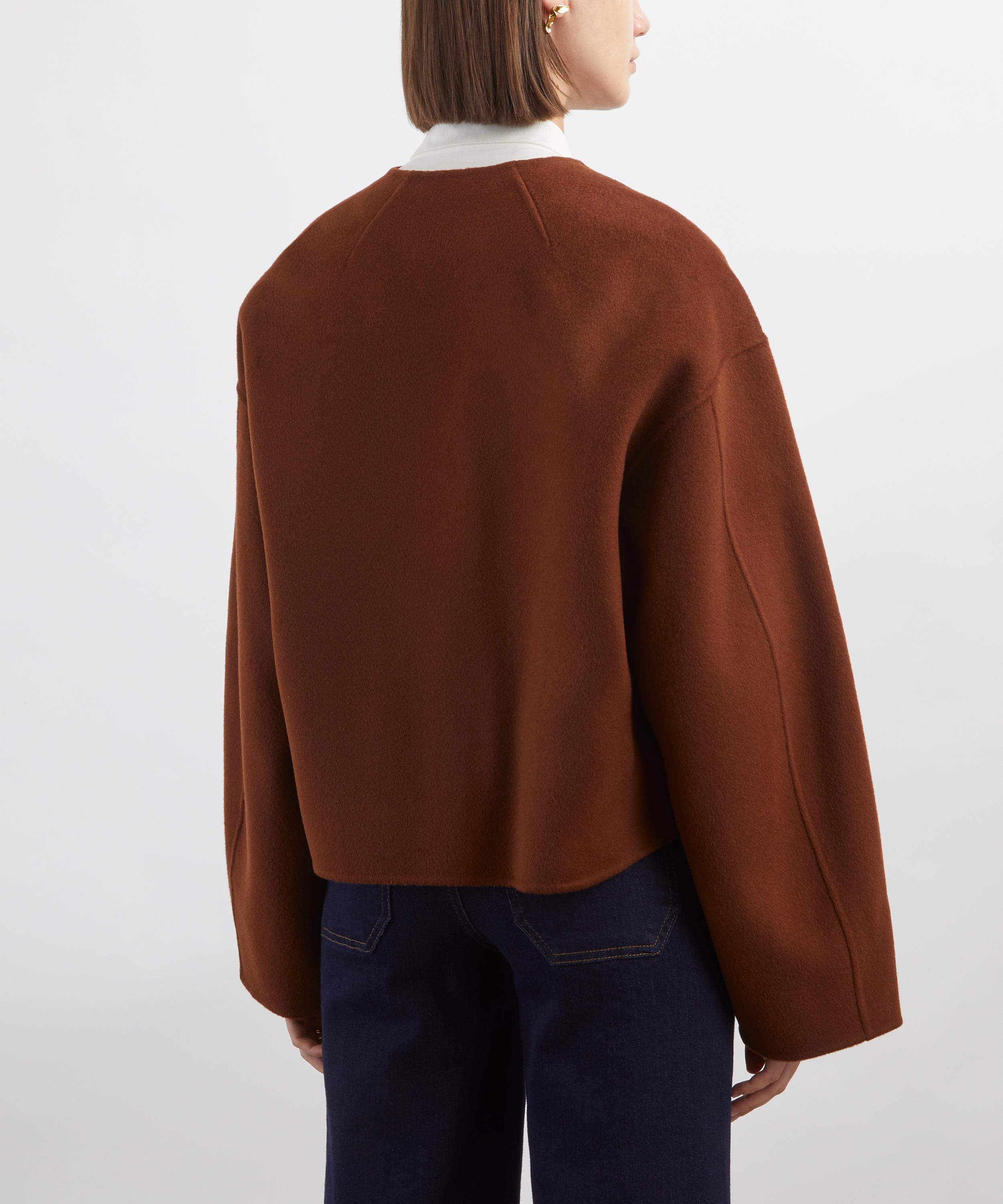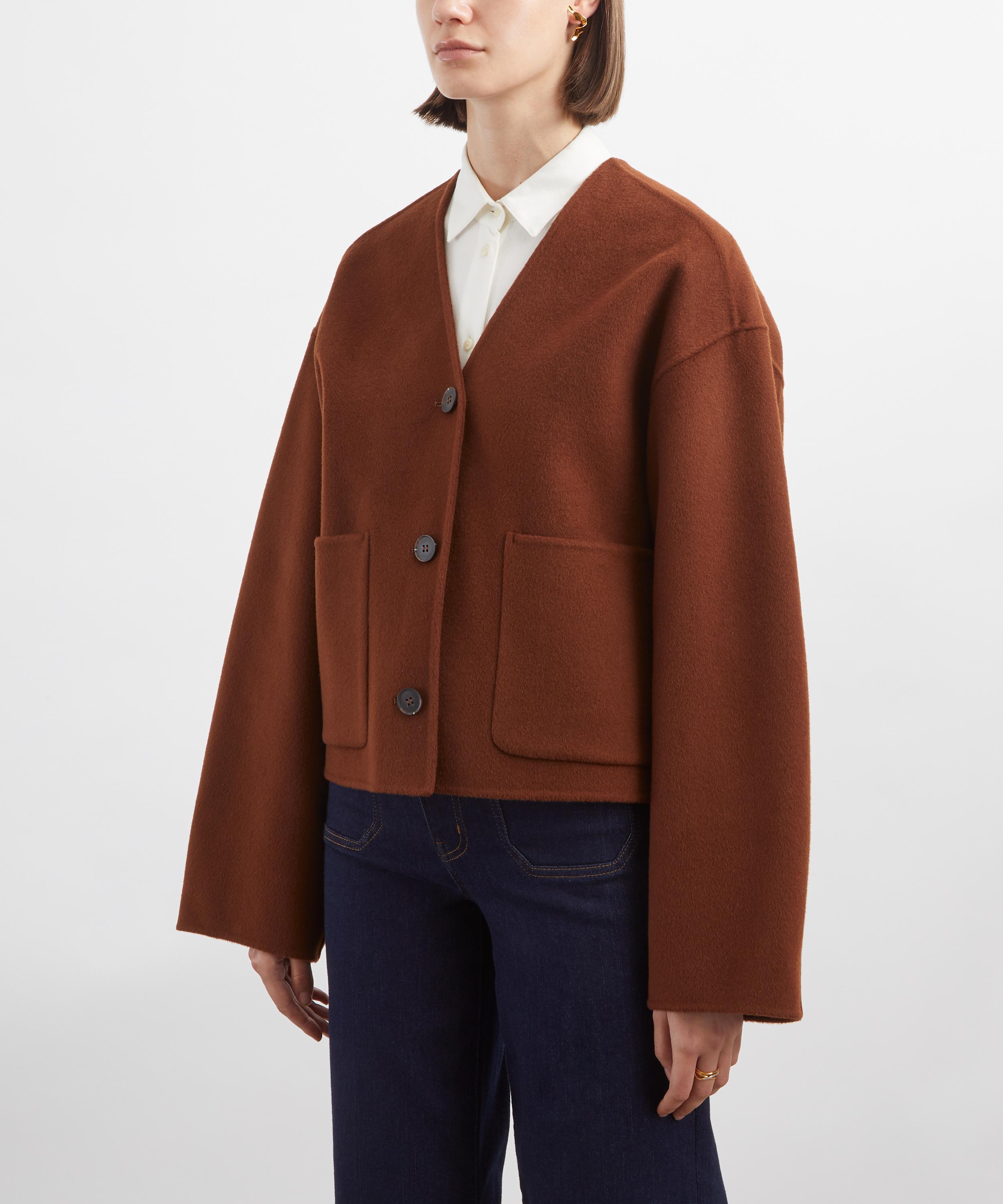Crafted from double-faced wool, this button-up jacket features a boxy fit with a deep neckline, dropped shoulders, wide sleeves, and two large patch pockets for a functional finish.