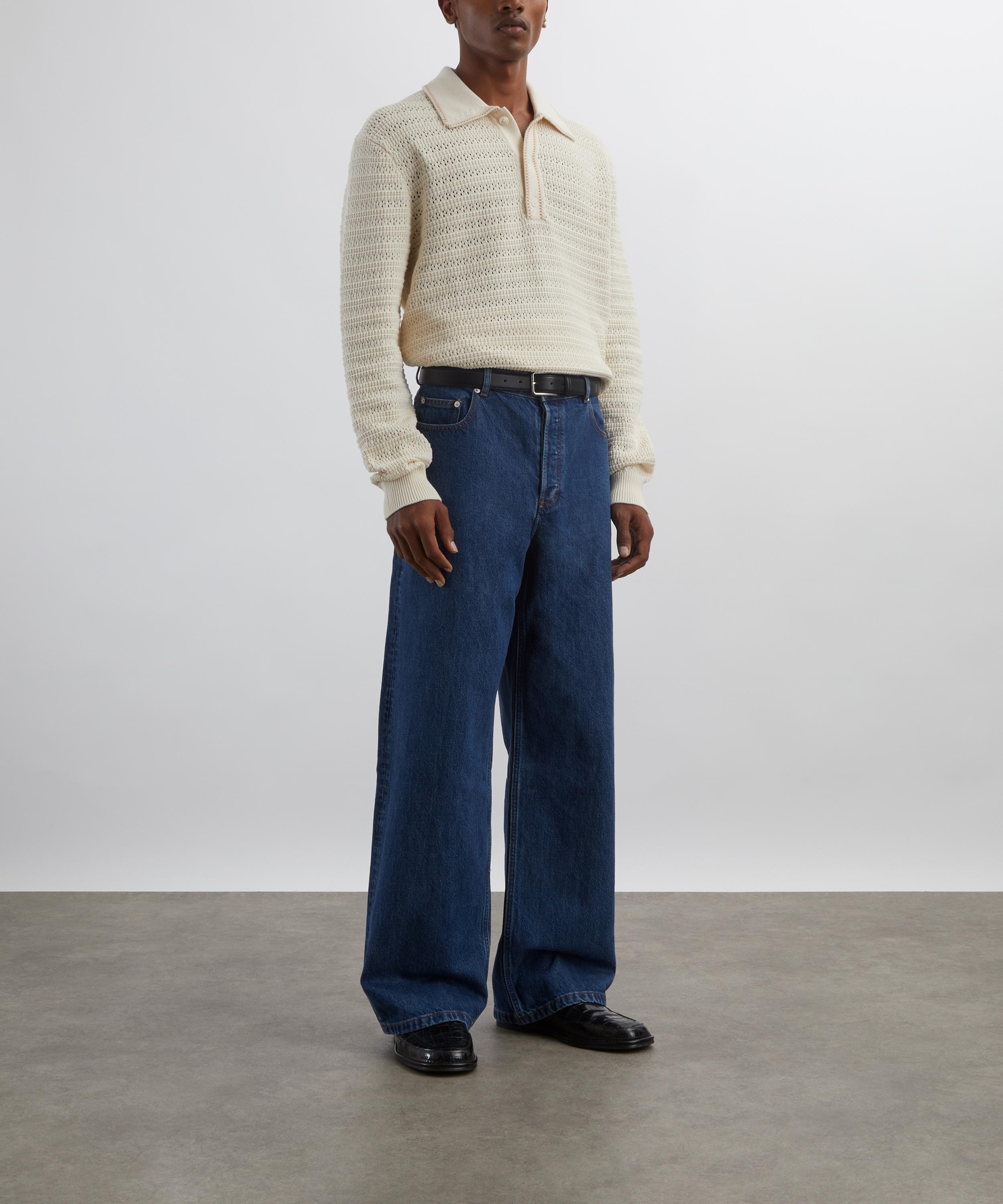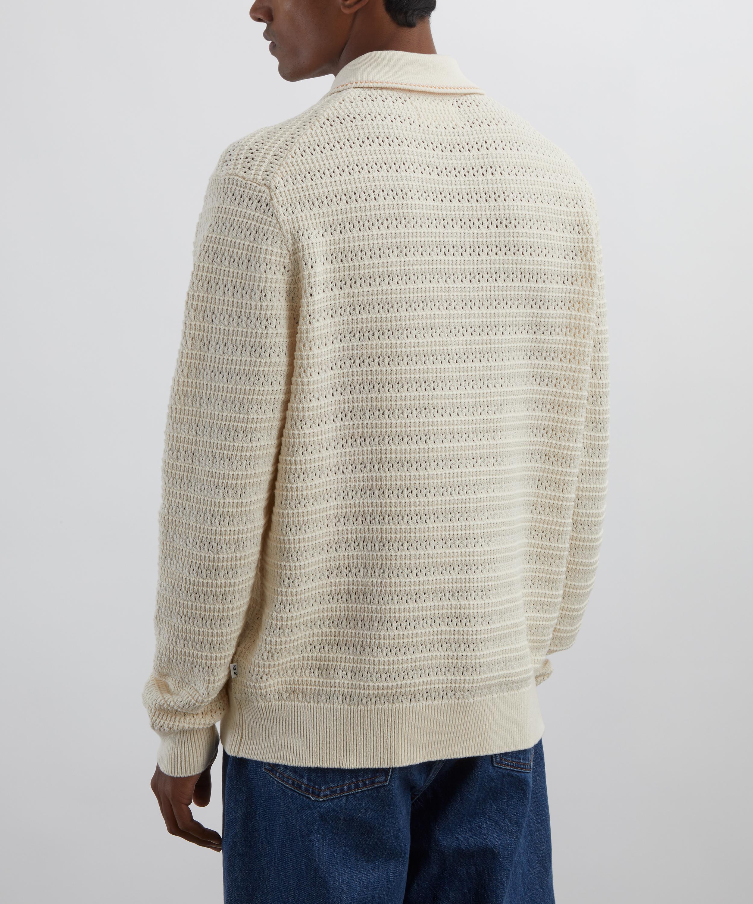 Finely knitted from cotton yarn with textured stitching, this long-sleeve polo shirt features a spread collar and partial placket, finished with mother-of-pearl buttons for a subtle touch of refinement.