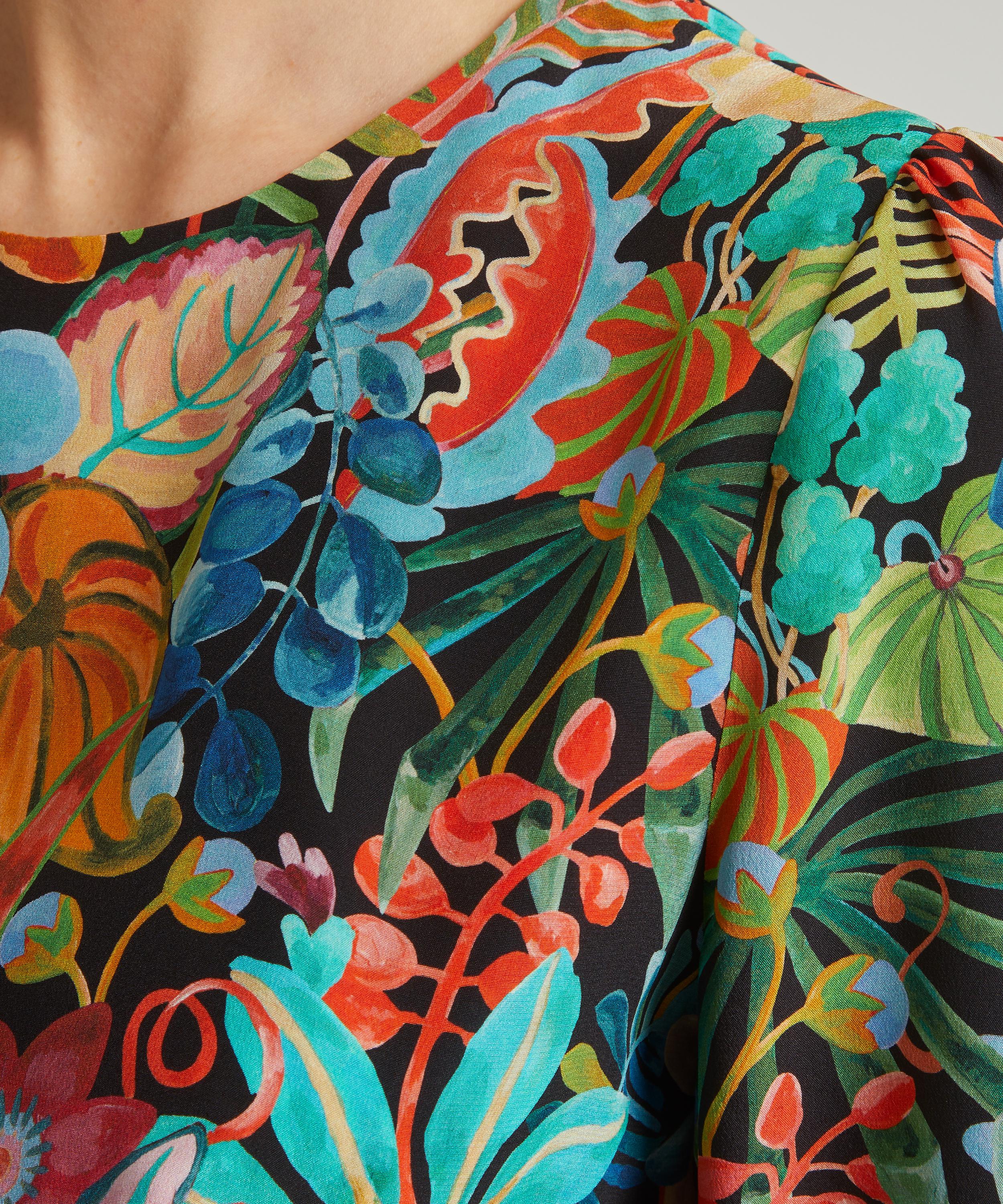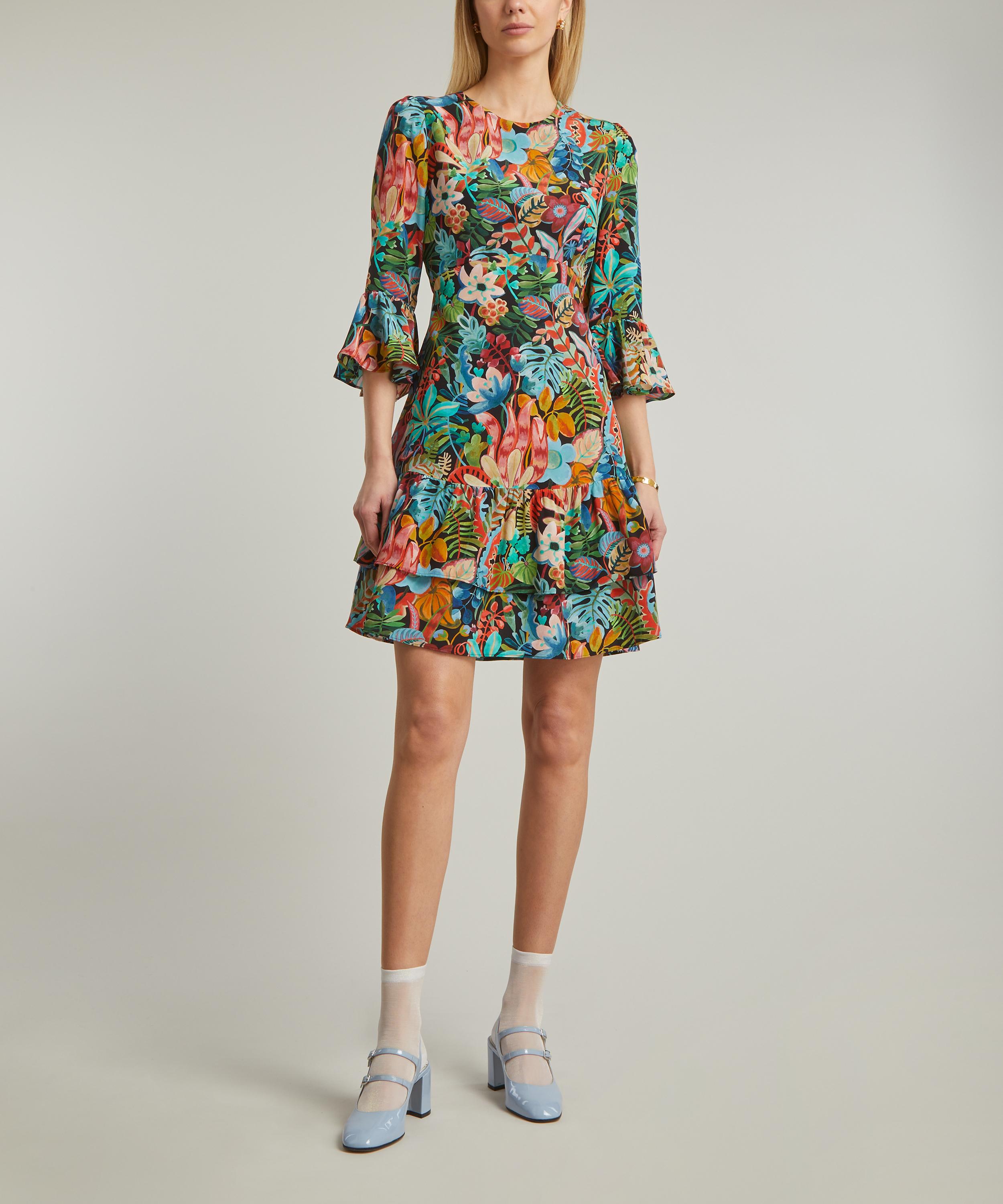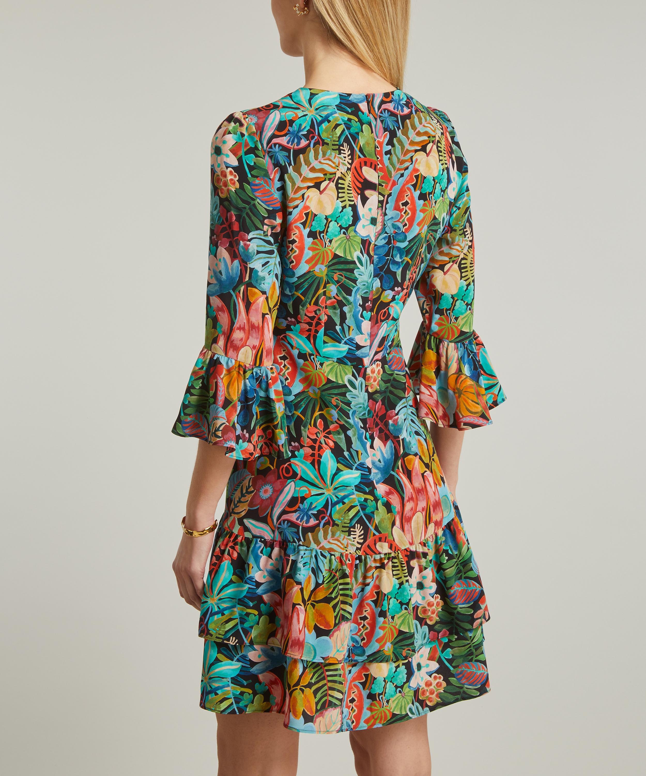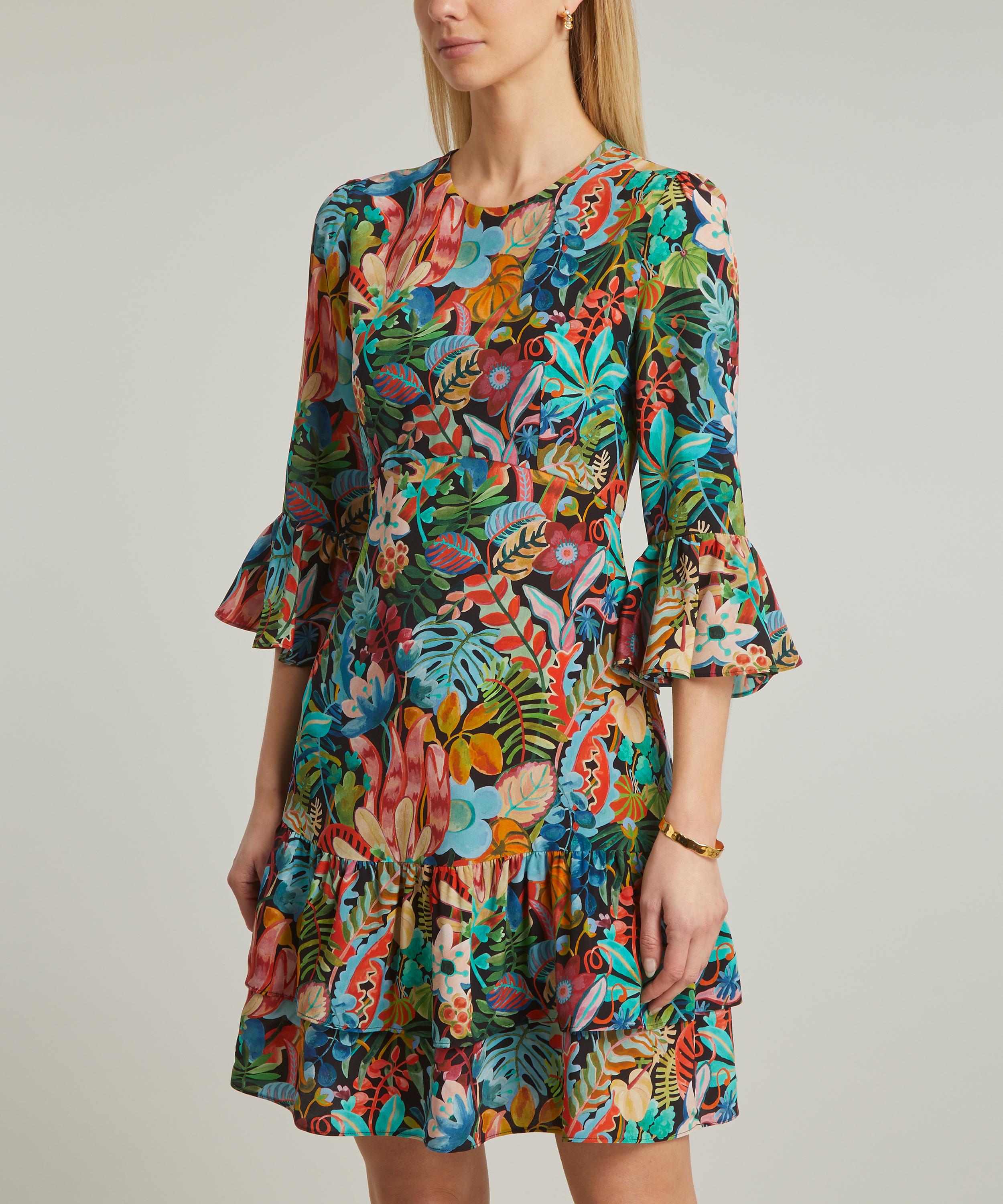 Crafted from lustrous Kensington Silk Crepe de Chine, our new Aperitif dress is designed to fit and flatter the feminine figure with its elegant V-neckline, fluted sleeves and frilled hem. Secured with a belted waist that wraps around the body to enhance the silhouette, it showcases our delightfully charming Jungle Trip print: Playfully stylised elements depicted in a riot of colours and expressive paint marks create this layered jungle print of foliage and flowers.