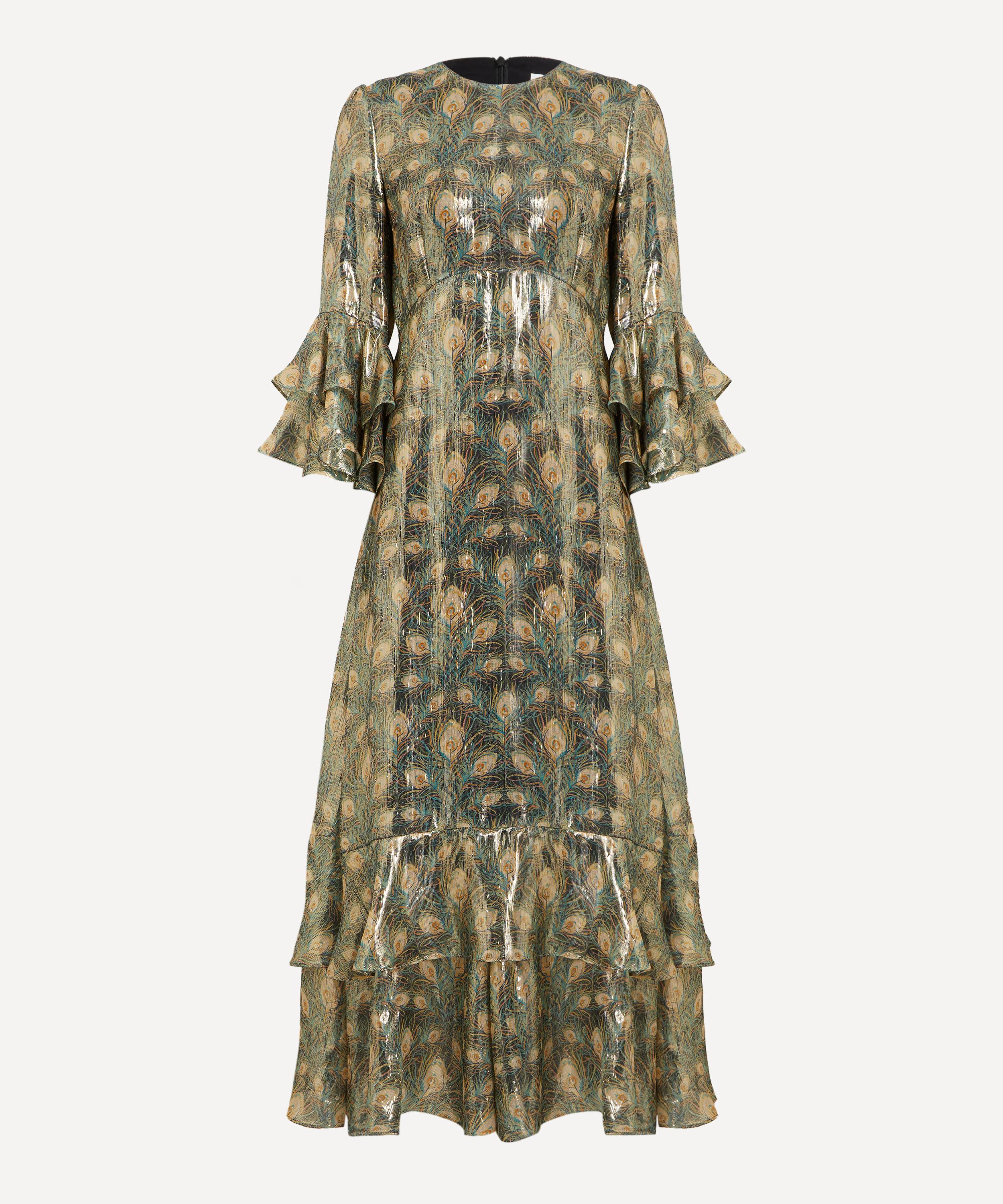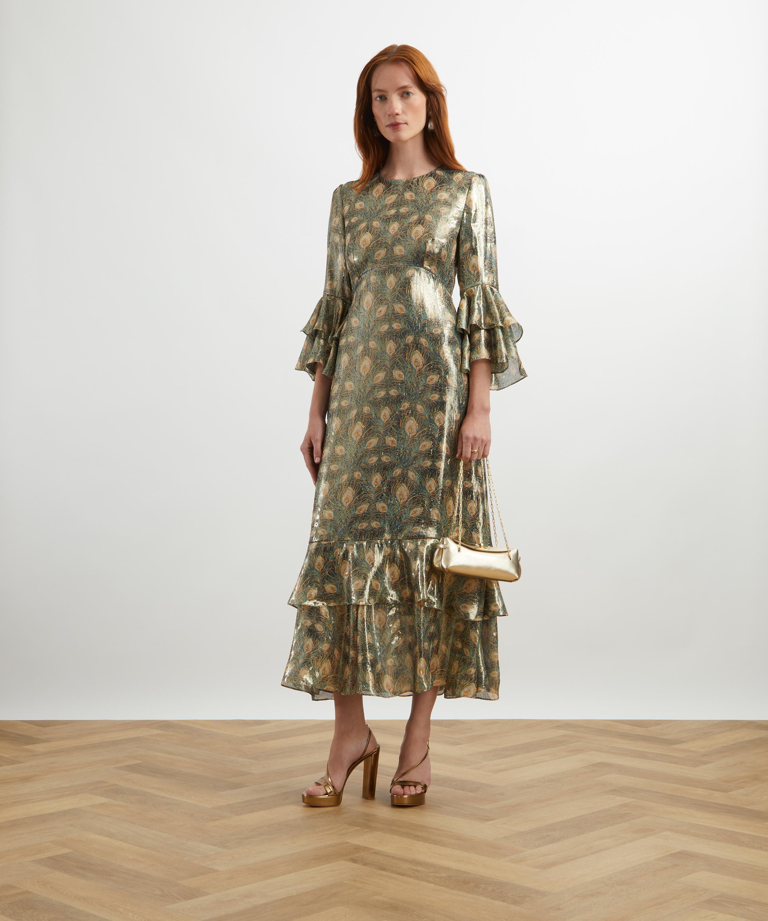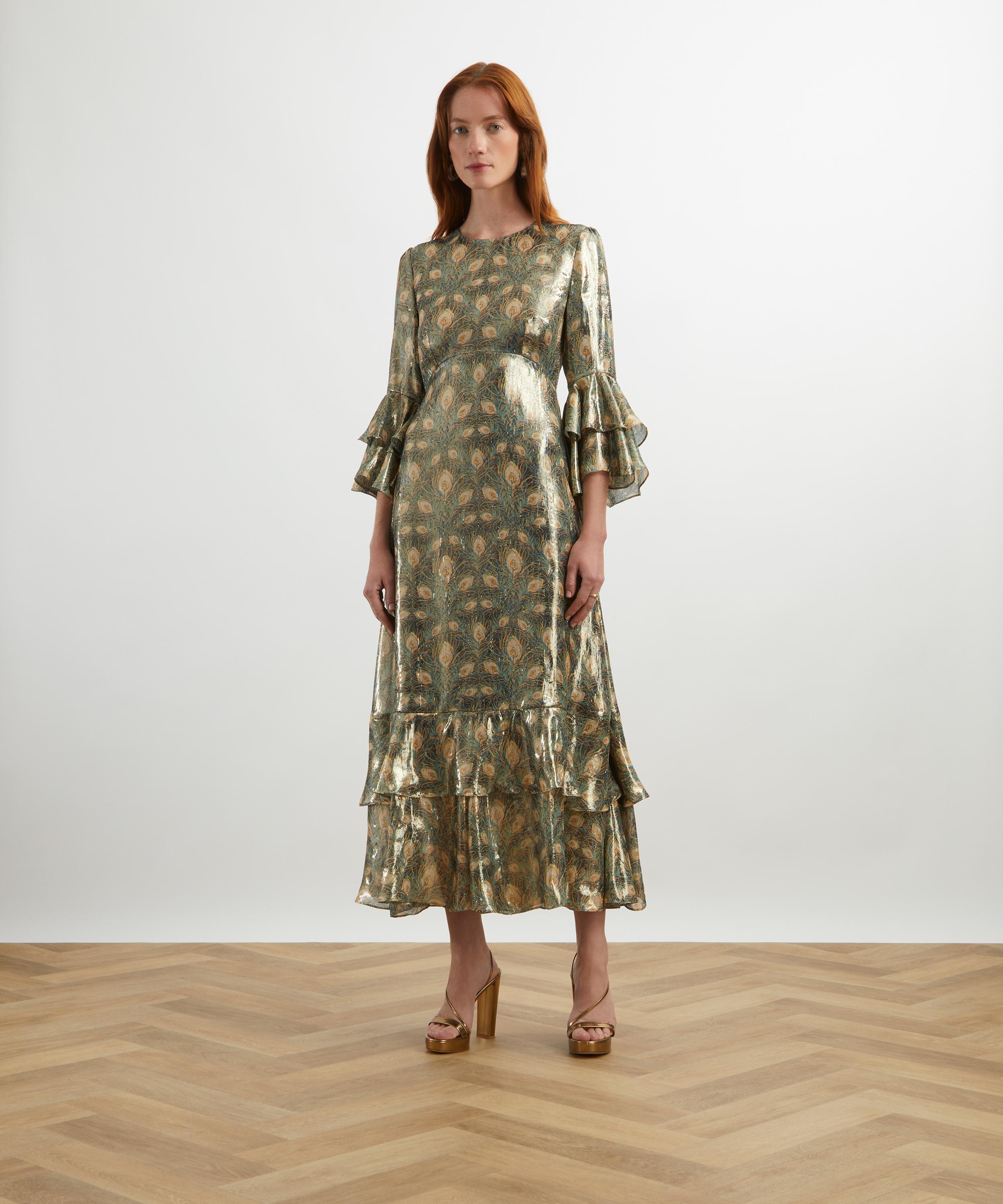 Cut from lustrous silk metallic lamé mousseline, it’s designed to flatter with its elegant empire waist and sweeping A-line silhouette. A true statement piece, it’s defined by flouncy pagoda sleeves and a softly tiered hem – blending timeless femininity with a playful edge.