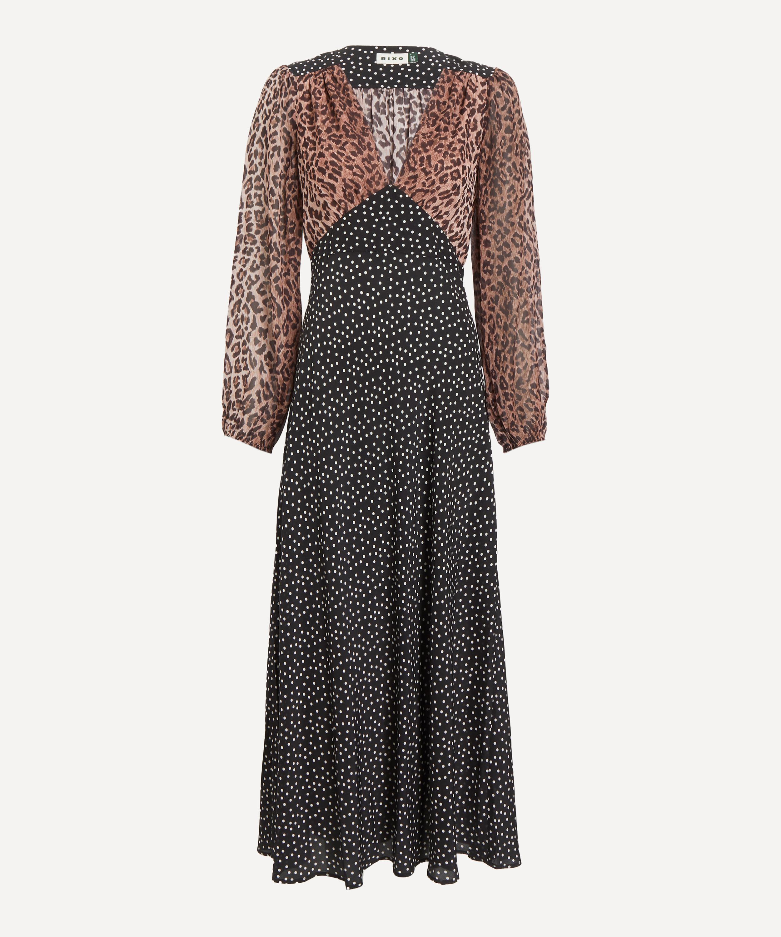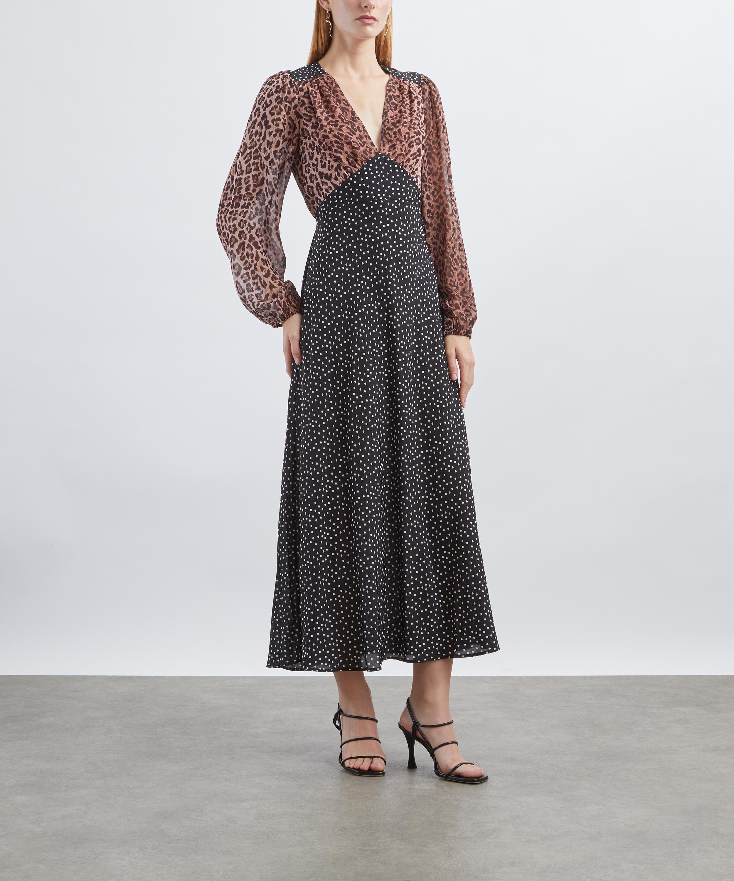 Inspired by vintage '70s silhouettes, the Kaila dress is crafted from lightweight crêpe de chine in a striking mix of leopard and polka-dot prints. Effortlessly flattering, it features a classic V-neckline, empire waist, and long blouson sleeves, with tie fastenings at the back for a softly defined silhouette.