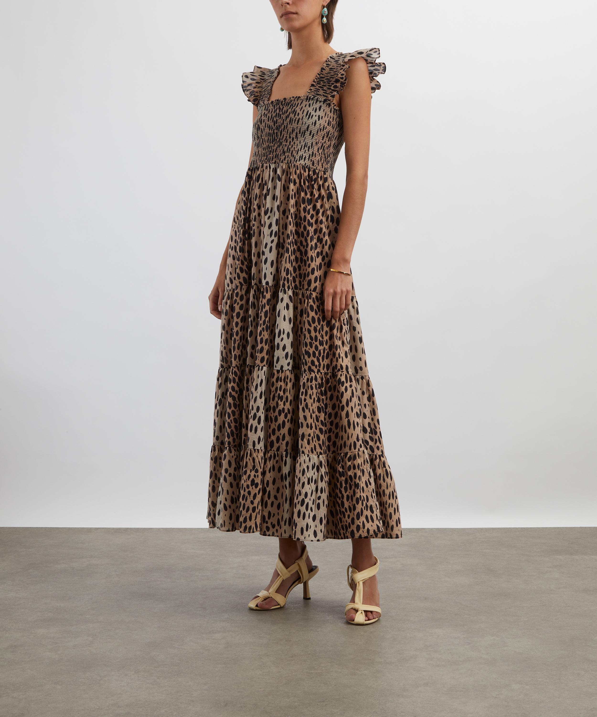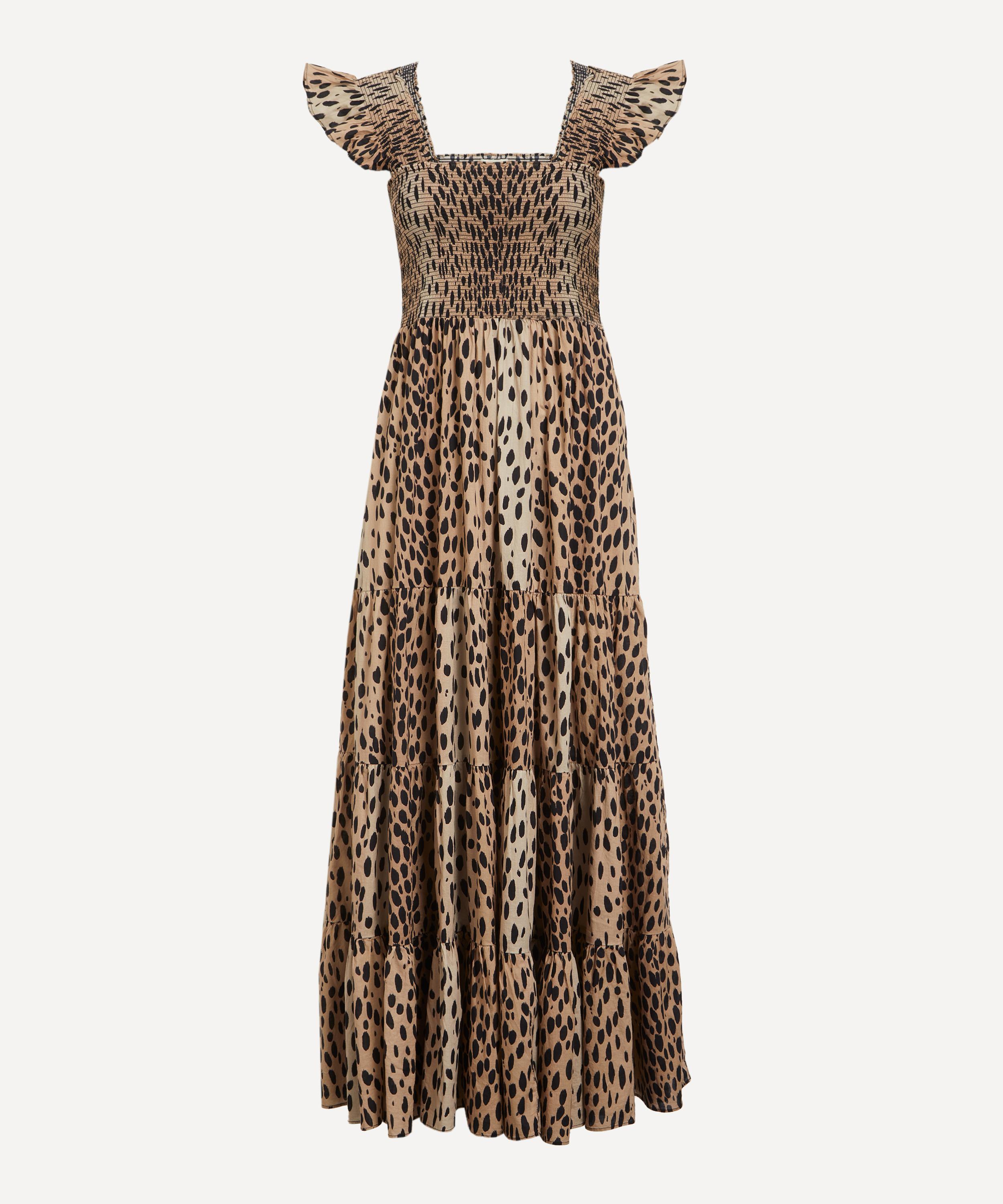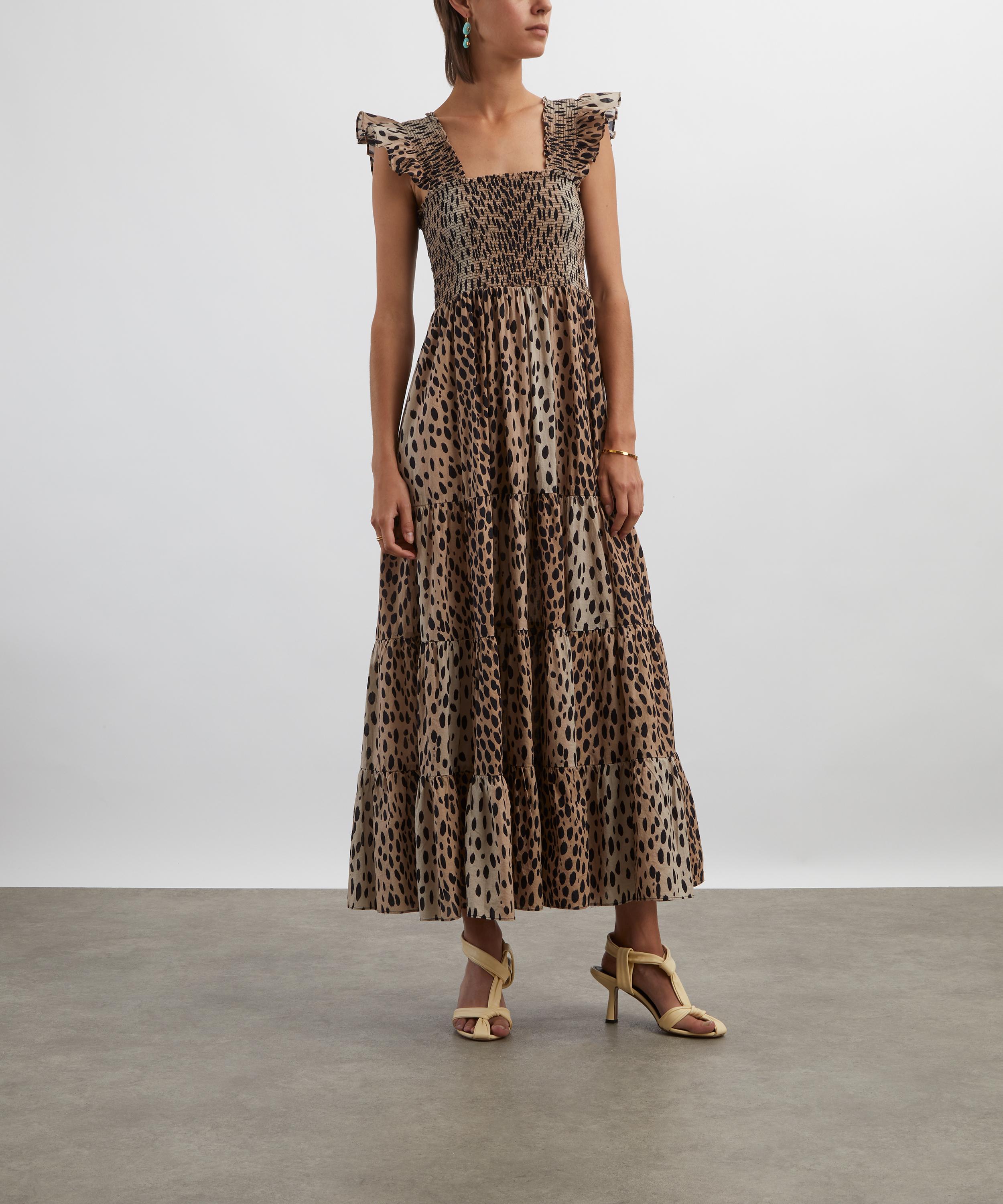 Crafted from lightweight cotton and adorned with a classic leopard print, this midi dress embodies effortless elegance. Delicately detailed with ruffles, it features a square neckline, a smocked bodice, and a tiered full skirt that falls to a floaty ankle-grazing length.