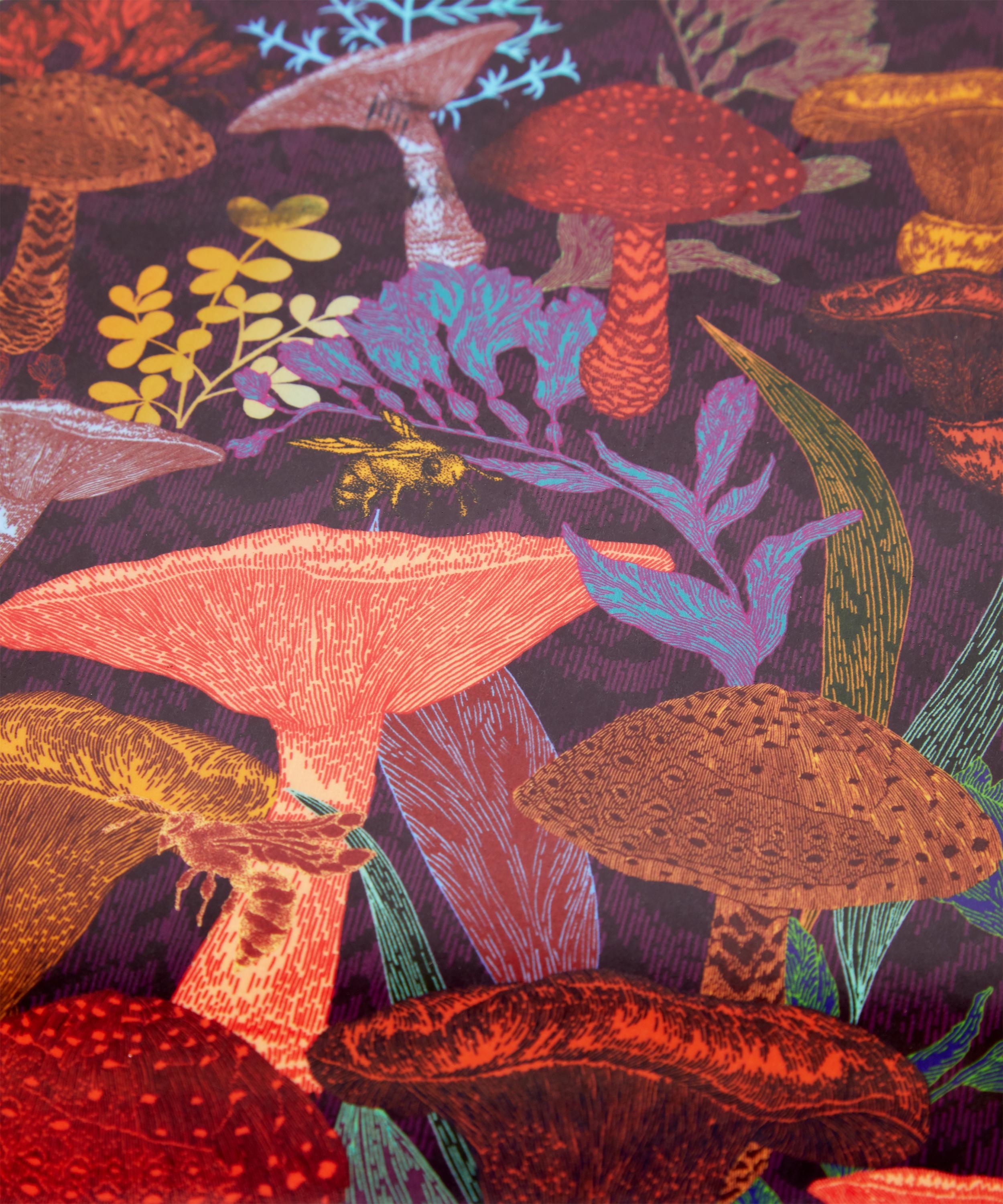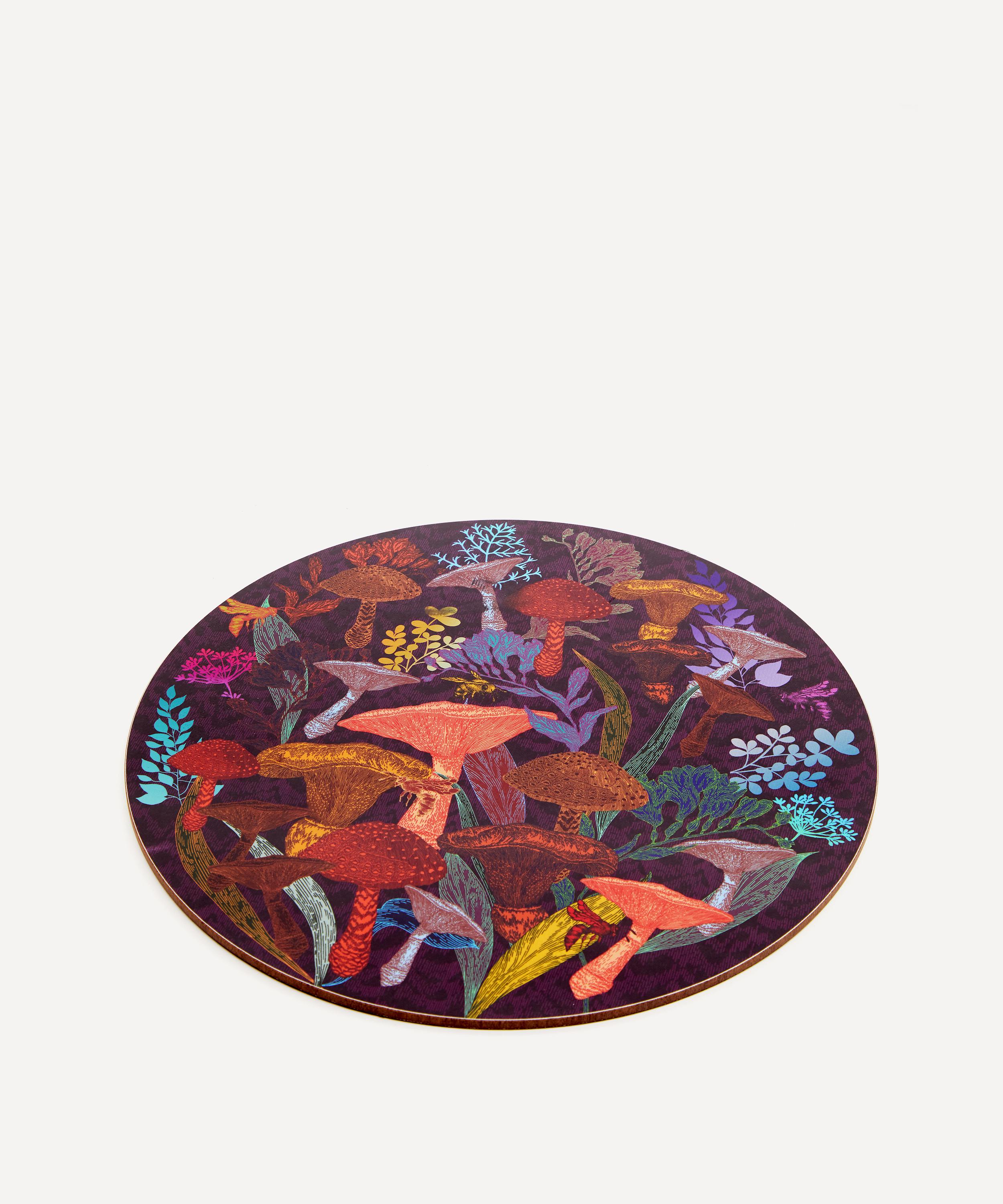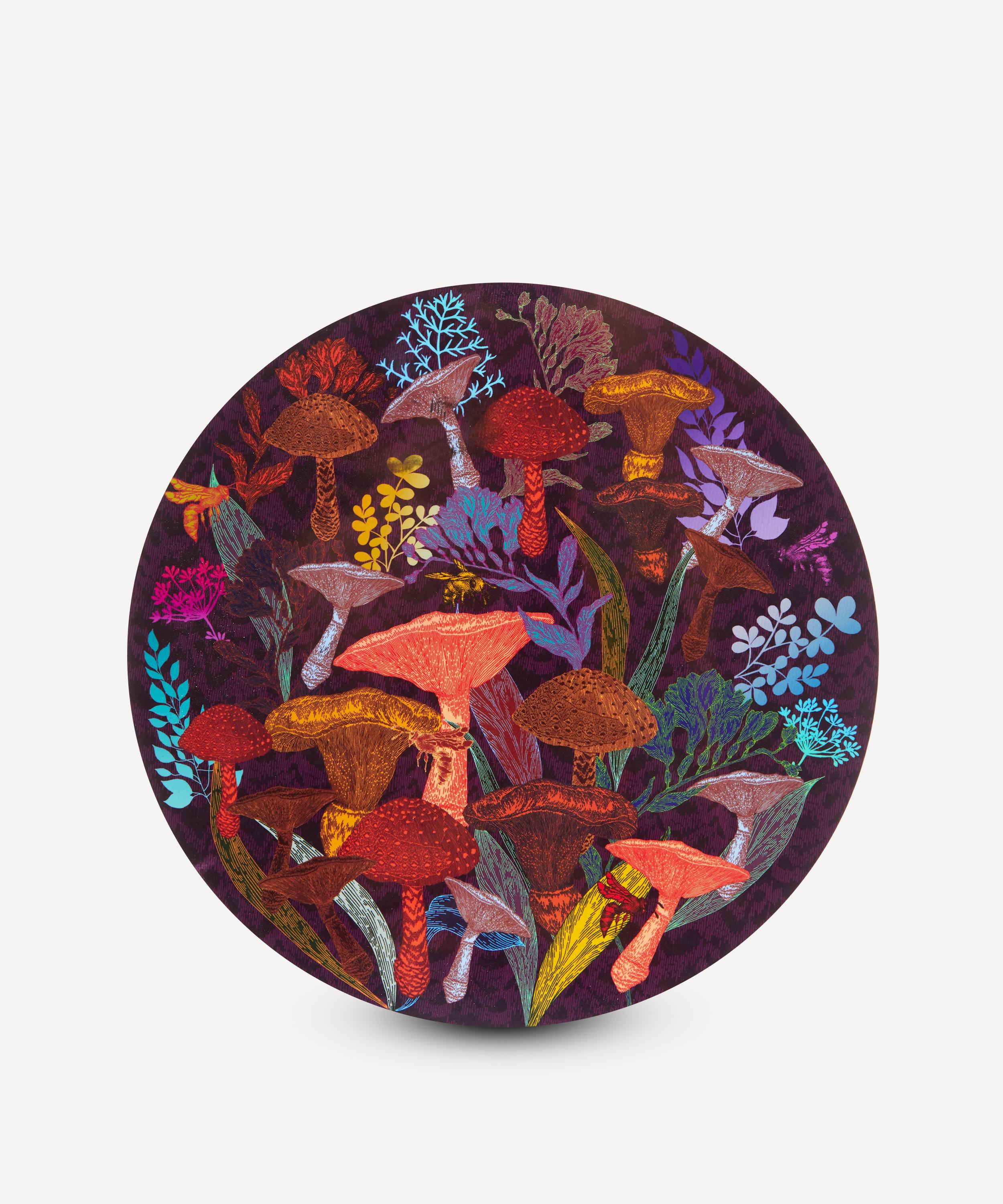 The perfect balance between tradition and contemporary, this round table mat is inspired by the simplicity and elegance of the Orient lifestyle. A truly individual piece, the calming earthy hues of the sculptural ferns and toadstools glow like magic against the deep purple background, creating an enchanting forest scene. Buy multiples to complete the menagerie, or mix and match for a characterful dining curation.