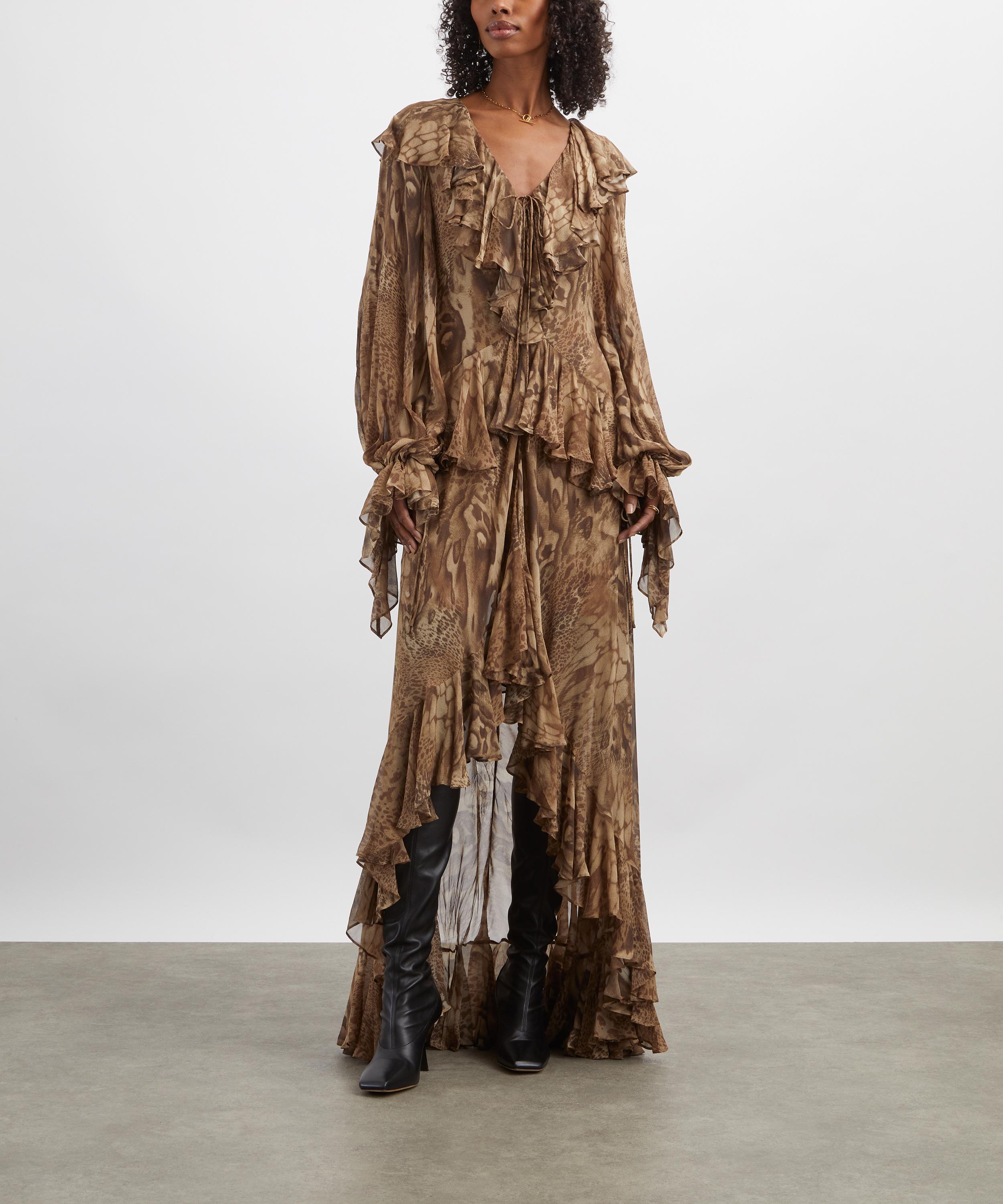Cascading effortlessly, the dress is cut from a lightweight fabric that moves beautifully with the body, featuring a plunging V-neckline, billowing sleeves, and all-over ruffle detailing. Channel the island spirit with strappy sandals and layered jewellery for an effortlessly glamorous finish.