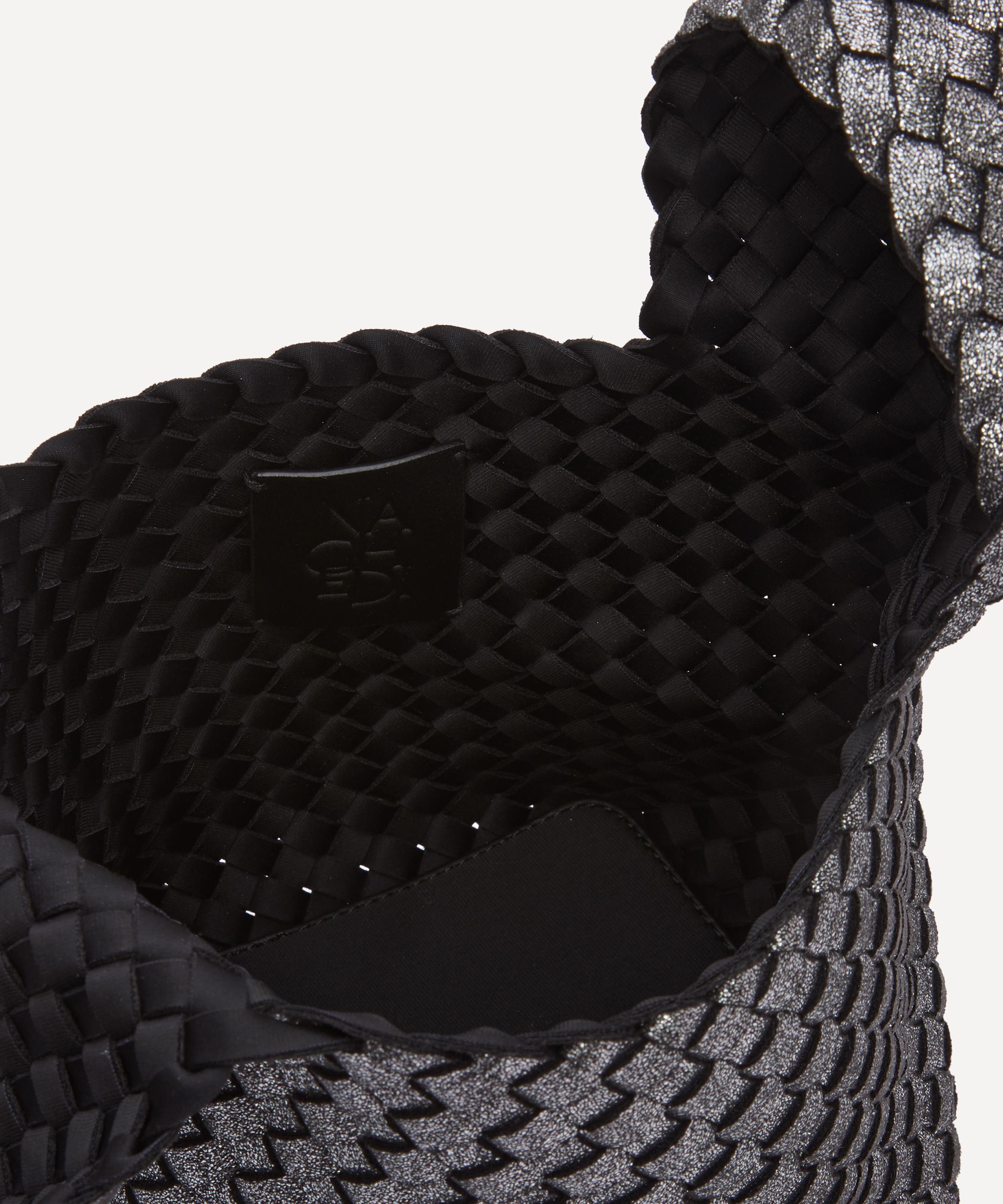 Crafted from neoprene fused with metallic shine, this stylish bag features an open top, secured with a slide-through loop closure, and is complete with a single top handle – a chic, compact design, it is perfect for day-to-night styling or as a daily companion for busy city life.