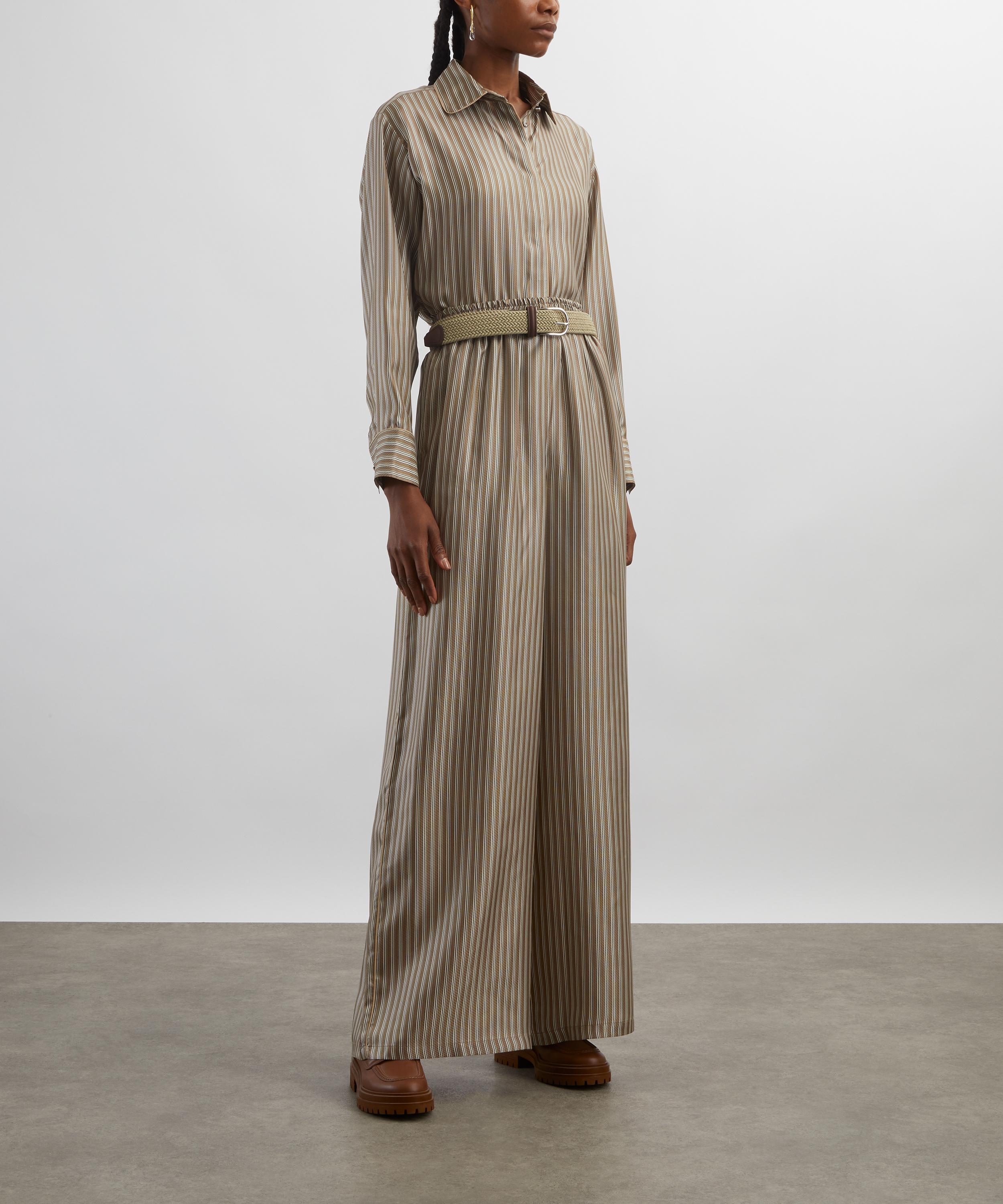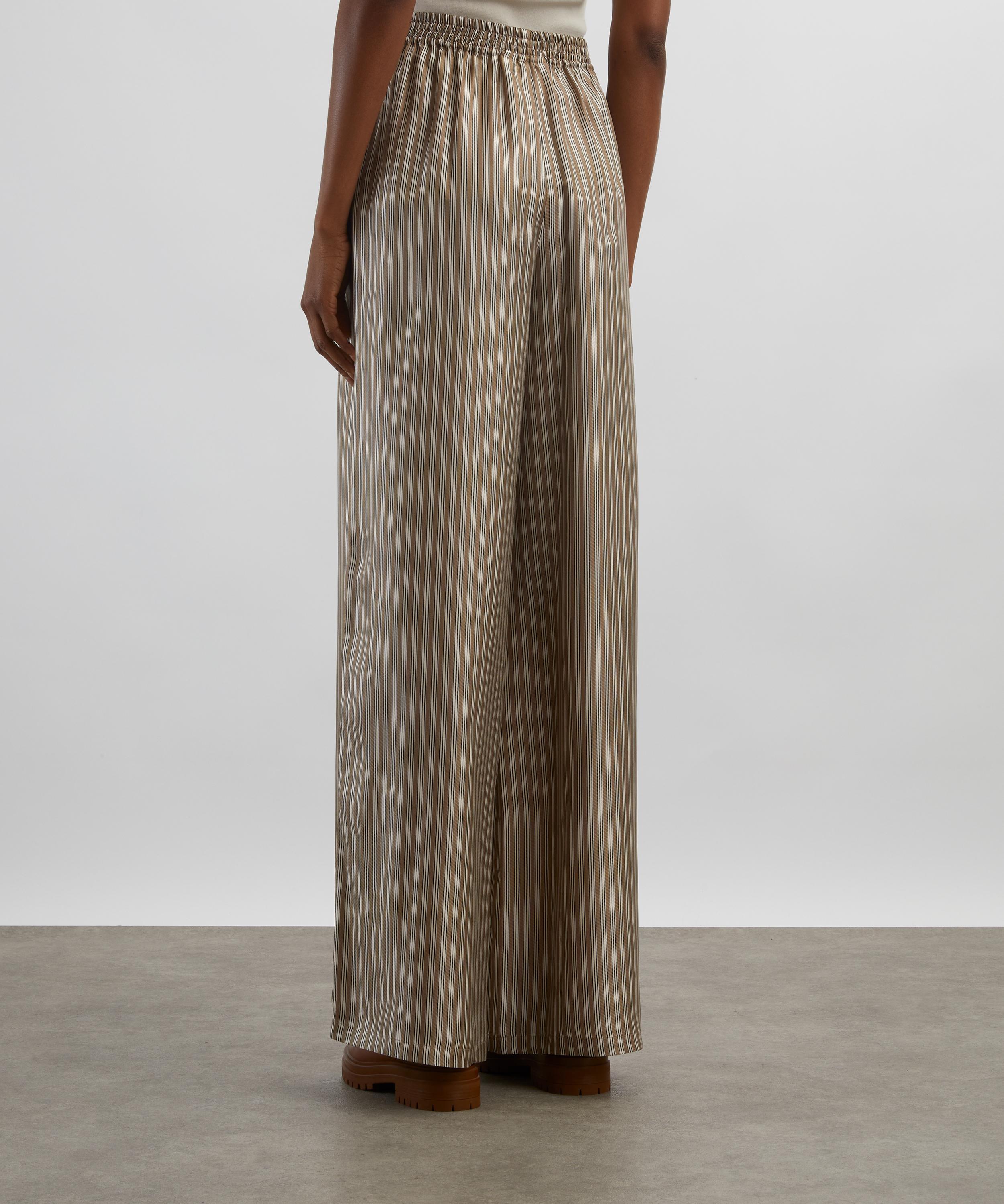 Crafted from pure silk twill in hazelnut-hued stripes, these pyjama-style trousers feature a relaxed wide-leg silhouette and an elasticated waist, merging luxurious comfort with laid-back elegance.