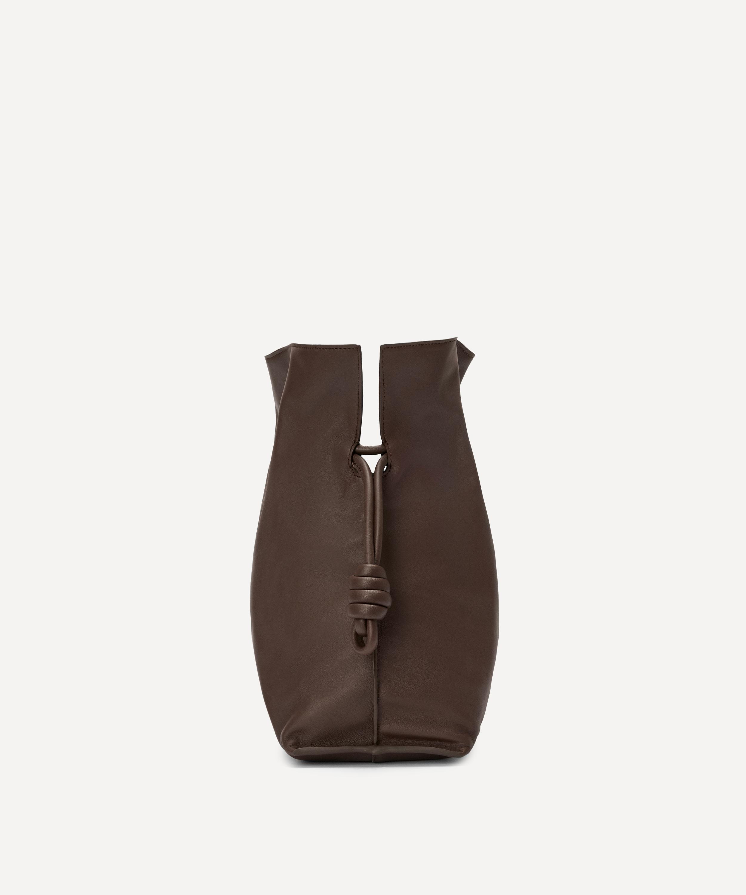 Cut from mellow nappa calfskin with a herringbone cotton canvas lining, this oversized clutch bag showcases a slouchy, ruched silhouette that cinches closed at the top with the style’s signature knot drawstring pulls. The design is finished with a concealed magnetic closure and interior pocket for valuables. Style it over the shoulder, across the torso or carry it as a clutch to add an ultra-feminine finish to off-duty looks.