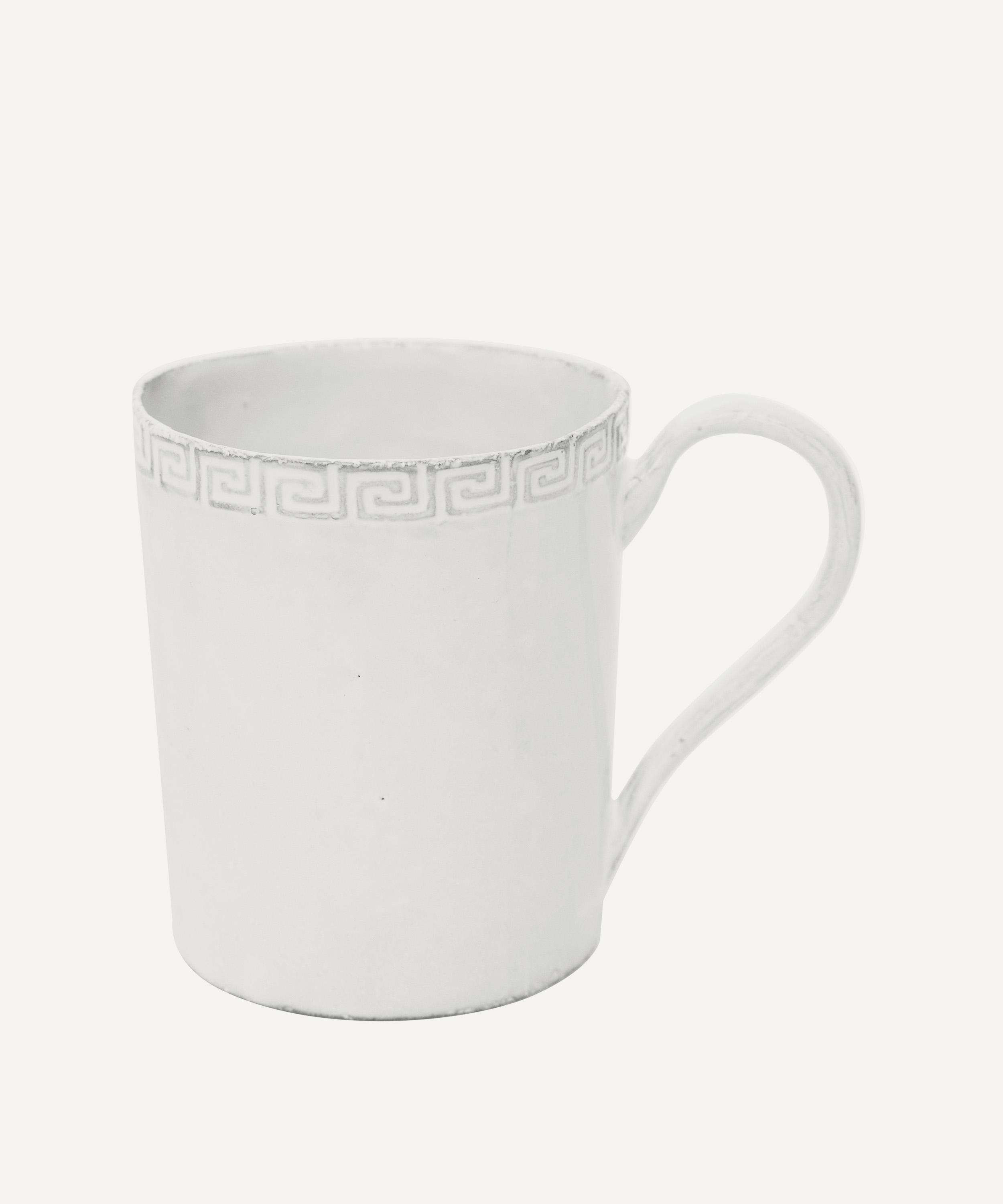 Votary of pre-industrial fabrication, Astier de Villatte is celebrated for being the one and only studio in Paris to hold and harbour the traditions of artisanal ceramic production. Restoring the ancestral systems of moulding and stamping, the large Greque cup is made using techniques from the Middle Ages which involve moulding a sheet of handmade clay, double firing the ‘biscuit’ piece and glazing the product in white enamel – a lengthy process that requires a drying time of up to one month. Characterised by exposed clay and a Greek border pattern around the rim, the cup is engraved with the brand’s signature crest - depicting an interlacing A & V - alongside the initials of one of the 40 master artisans who created it. Each handmade piece tells a beautiful story, it romances and imparts a sense of nostalgia into its owner. Arrange with other espresso cups and mugs in the collection to breathe an air of authenticity into your breakfast setting.