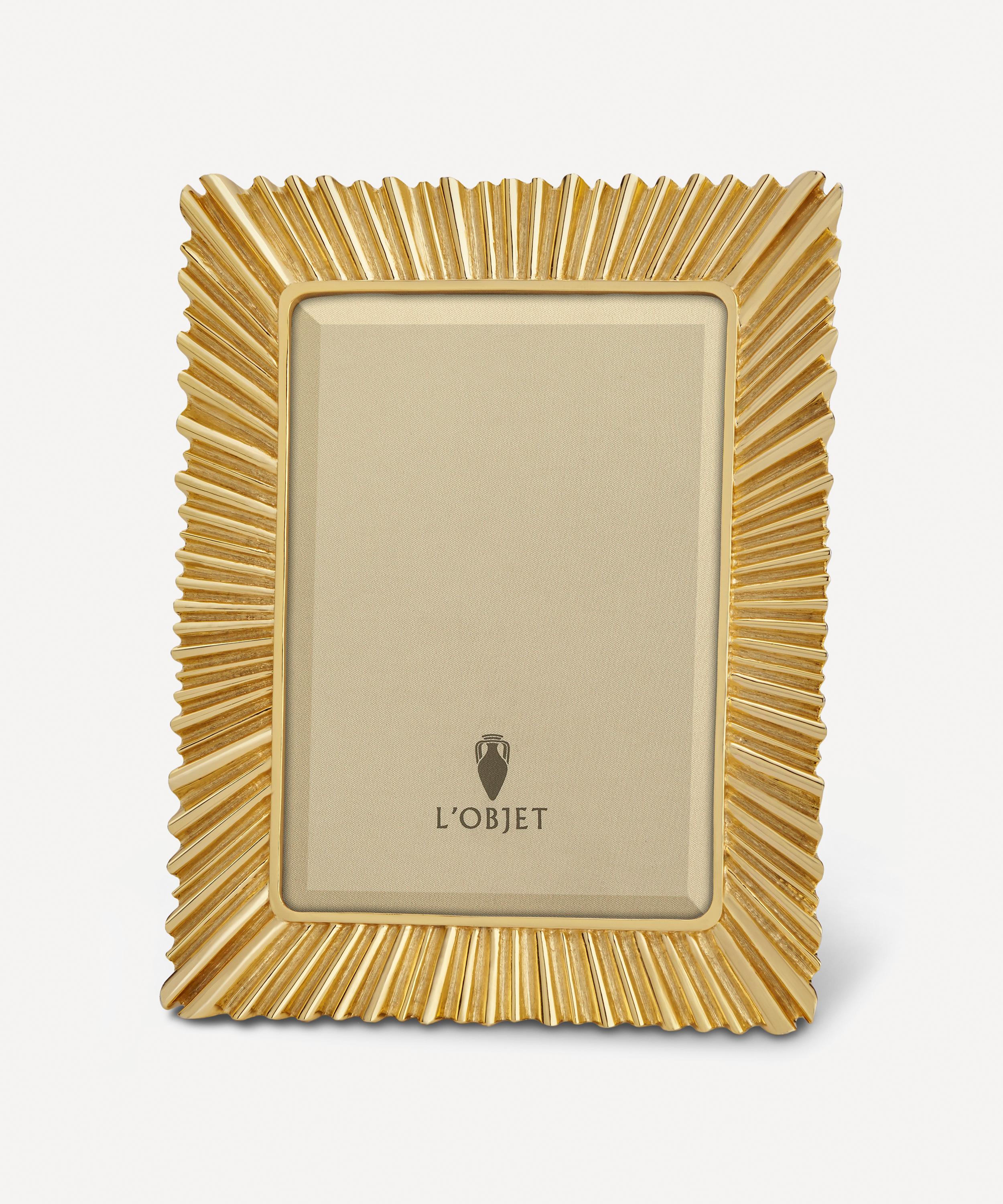 This radiant photo frame from L’Objet is surrounded by a textured sunburst motif with 24ct gold-plating.