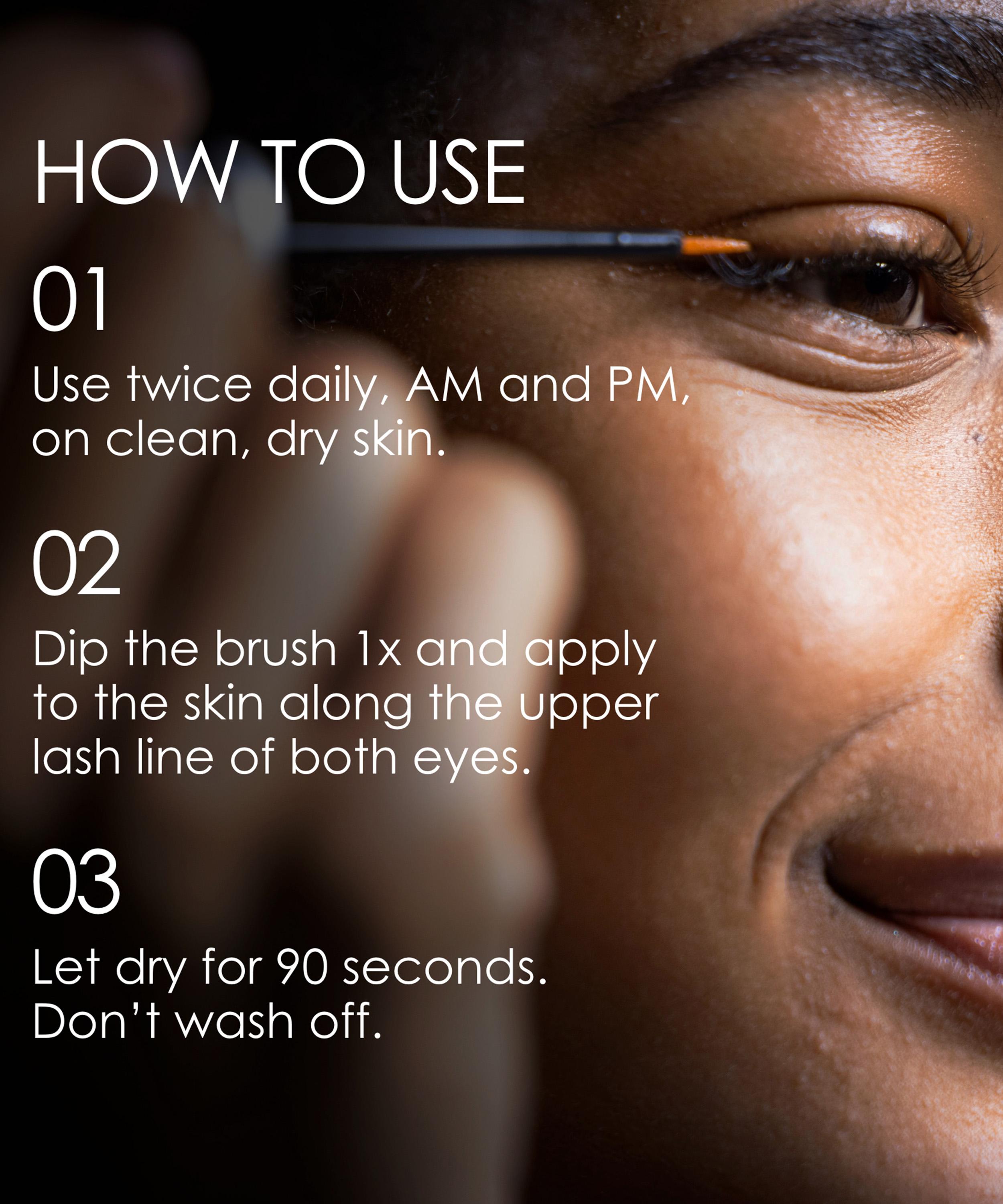 Use twice daily, AM and PM, on clean, dry skin. Dip the brush once and apply to the skin along the upper lash line on both eyes. Do not wash off. Allow to dry for at least 90 seconds before applying other eye products.