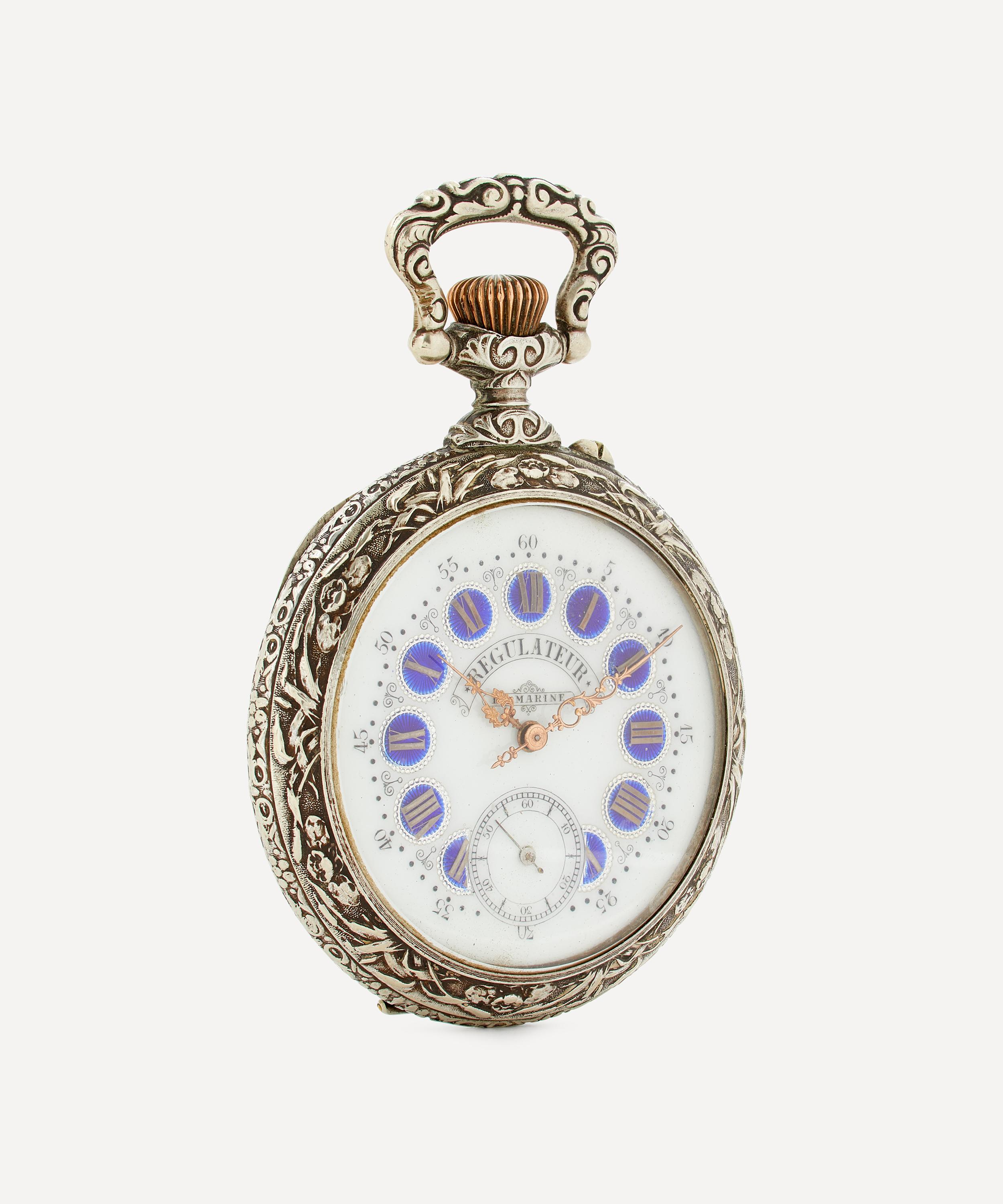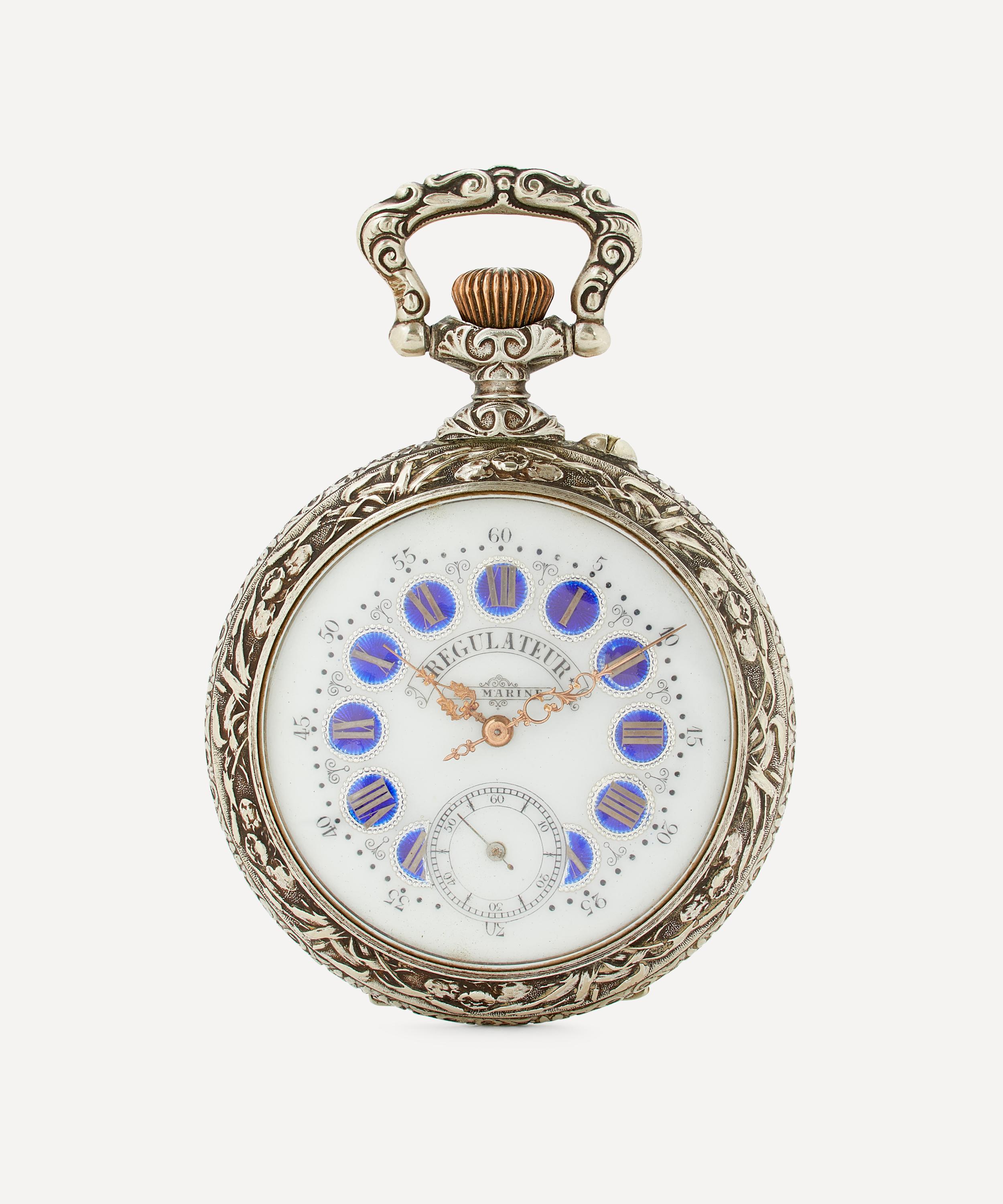 Crafted from silver, this vintage goliath pocket watch dates back to the later Victorian period. Set in a cushioned circular case bearing an embossed floral and foliage design, it features a white dial with rose-gilt Louis XIV hands and silver Roman numerals, each encased in a dark-blue enamel circle. Complete with the Regulateur de Marine authenticity script and registration number, this collectable pocket watch is guaranteed to become a much-admired heirloom that can be passed from generation to generation for many years to come.