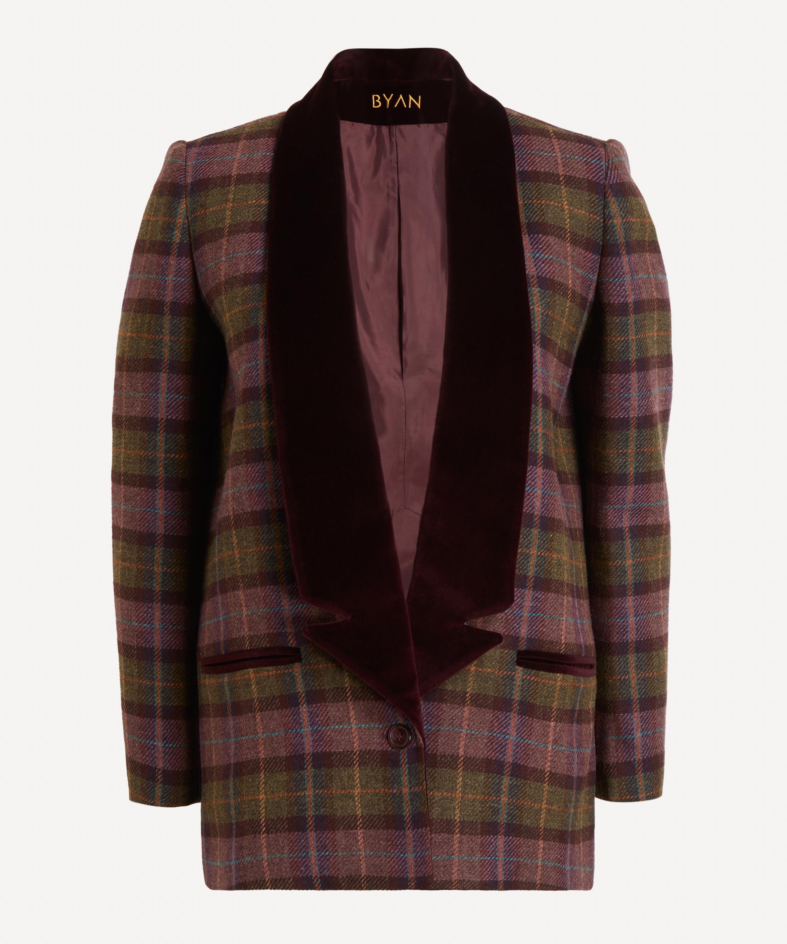 A true sartorial statement, it’s tailored from vintage-inspired plaid in a slim, long-line silhouette. Finished with wine-hued velvet smoking lapels and matching pocket accents, pair it with the coordinating pieces for a look that exudes timeless sophistication.
