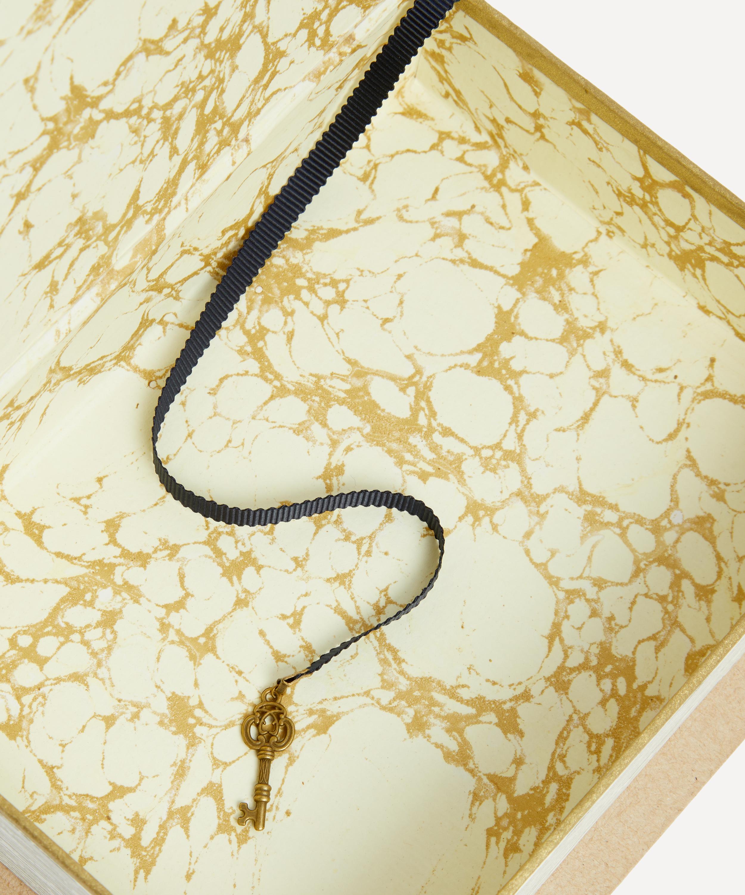 Taking inspiration from 18th century French tradition, this book is meticulously designed to subtly squirrel away your trinkets and treasures, crafted to beautifully blend into a mantle or shelfscape. The interior is elegantly lined with marbled binding paper that has been hand-printed in France, with a ribbon and a metal trinket in the shape of a key at the end to complete the piece.