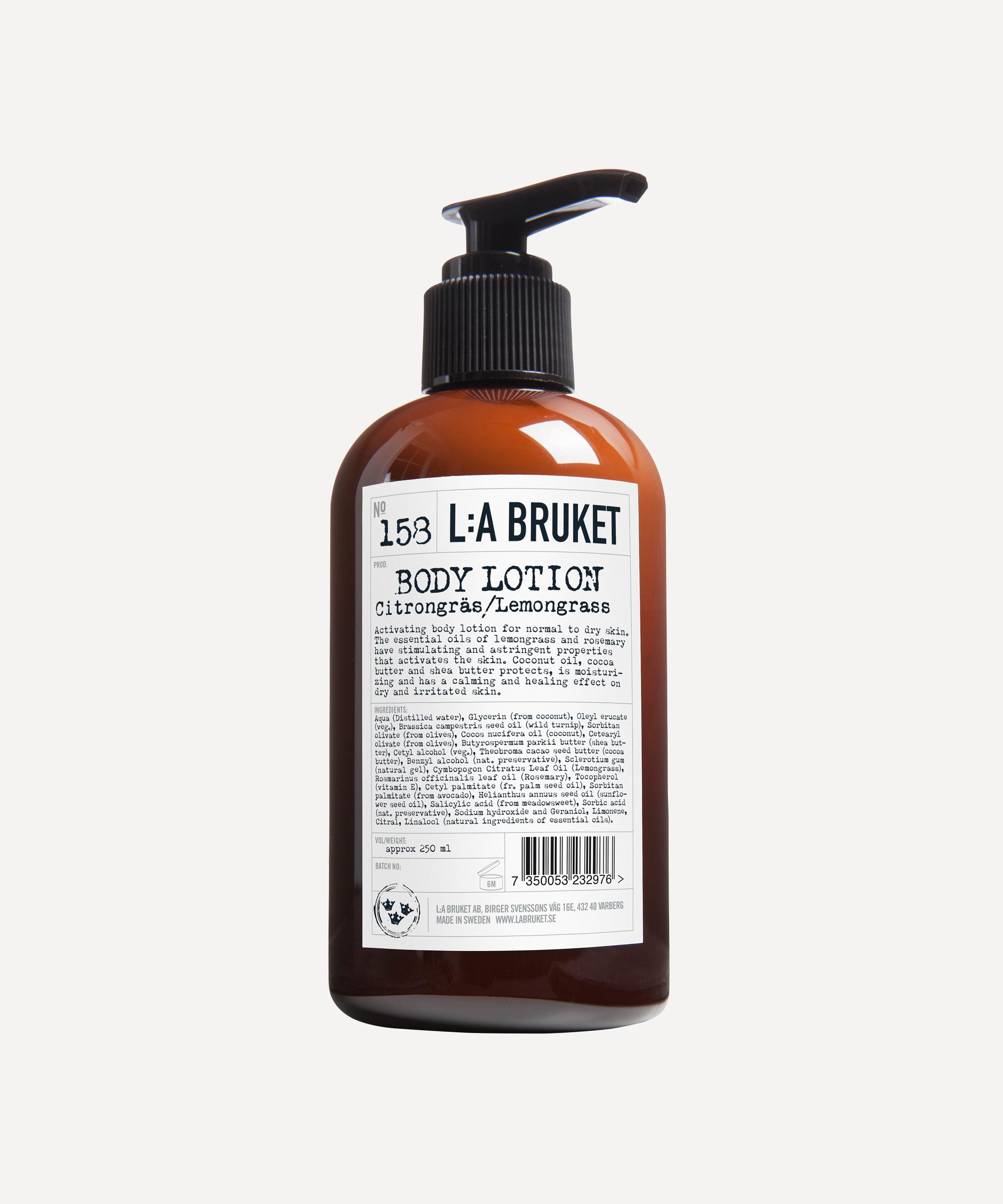 This activating L:A Bruket body lotion has essential oils of lemongrass and rosemary which both have stimulating and astringent properties that activate the skin, whilst coconut oil, cocoa butter and shea butter work together to protect skin against harsh weather.
