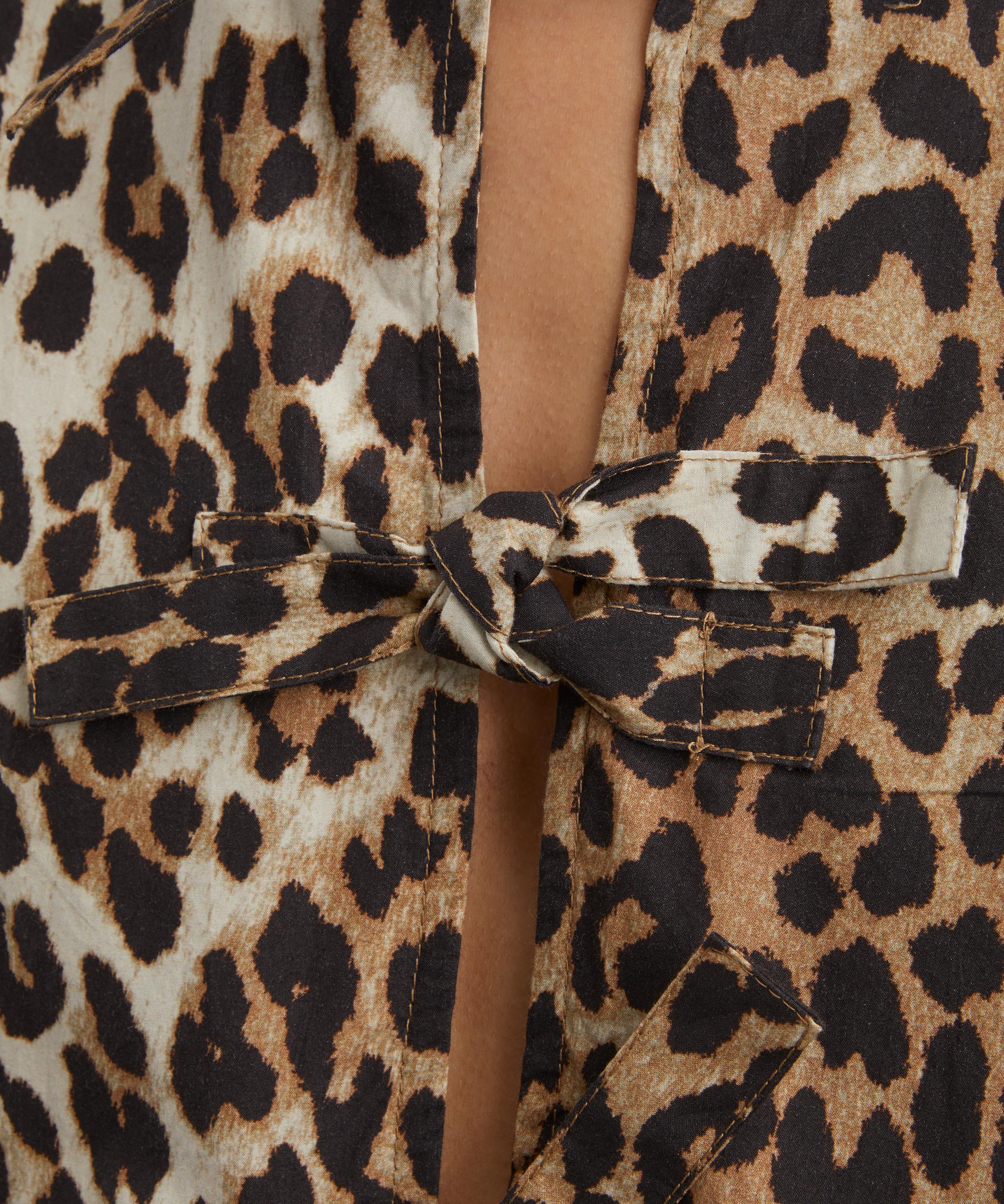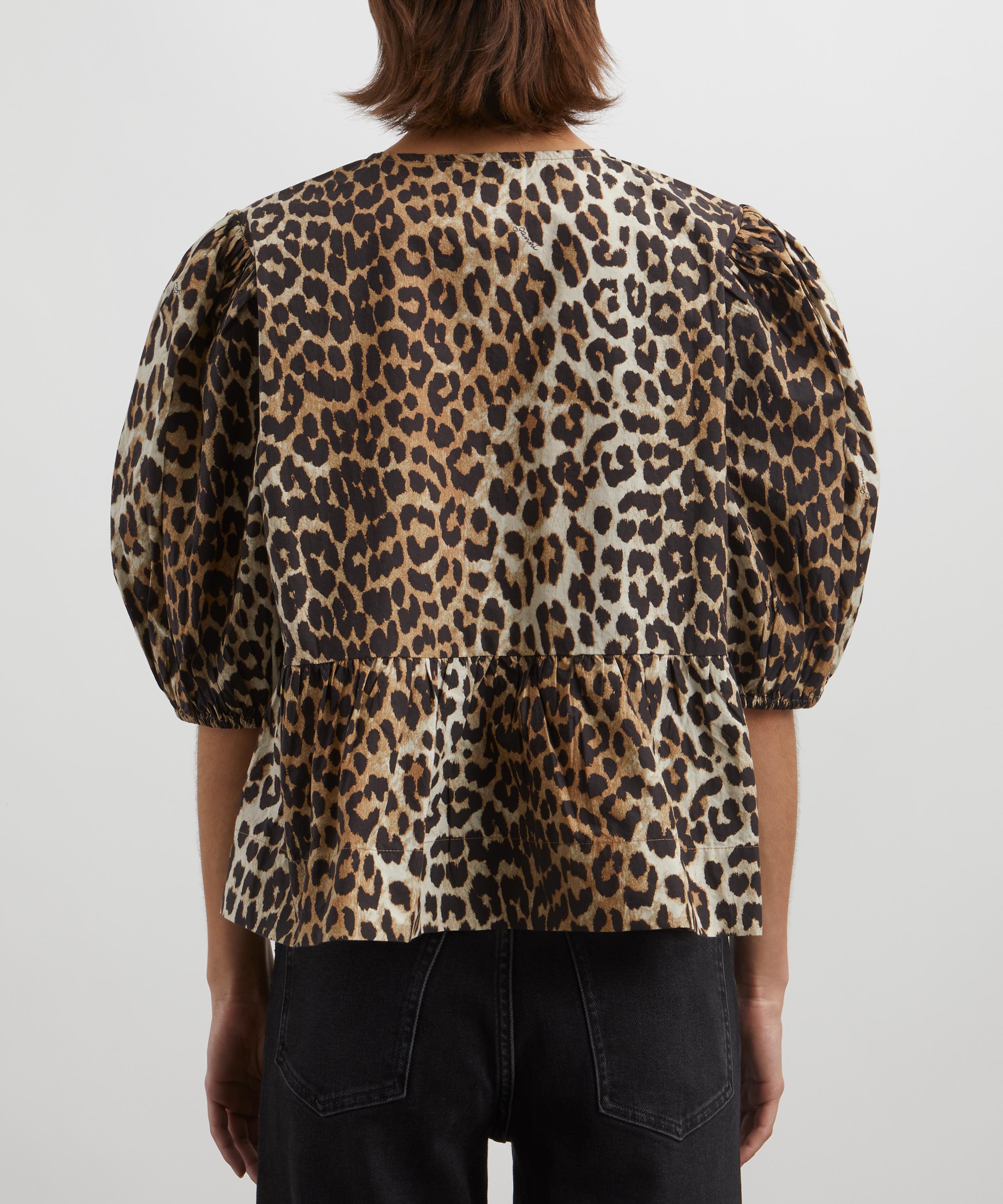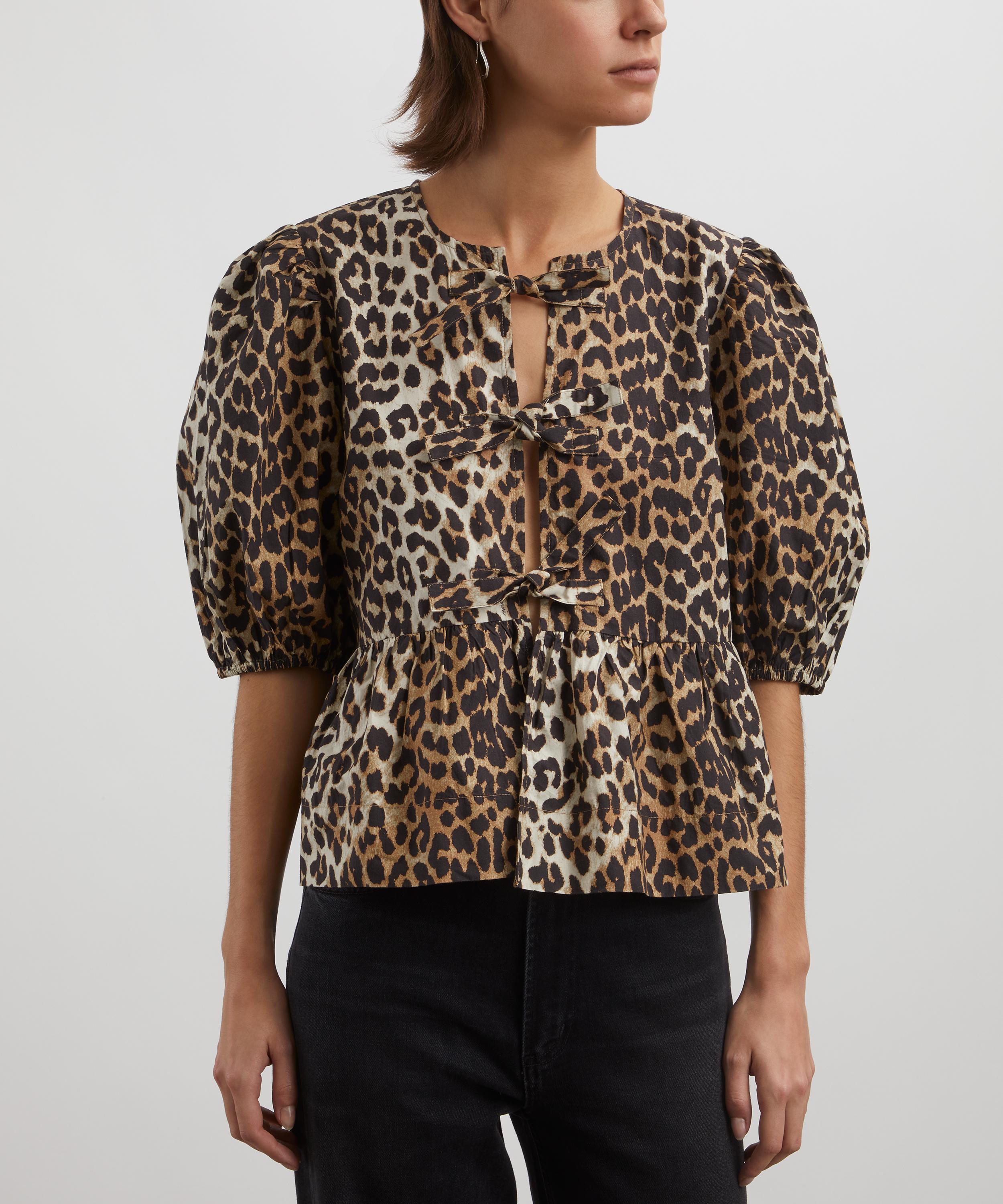 Adorned in GANNI’s iconic leopard print, this cotton blouse radiates contemporary elegance. Featuring three delicate tie bands at the front, it boasts voluminous puff sleeves and a flattering peplum hem, adding a playful yet whimsy touch.