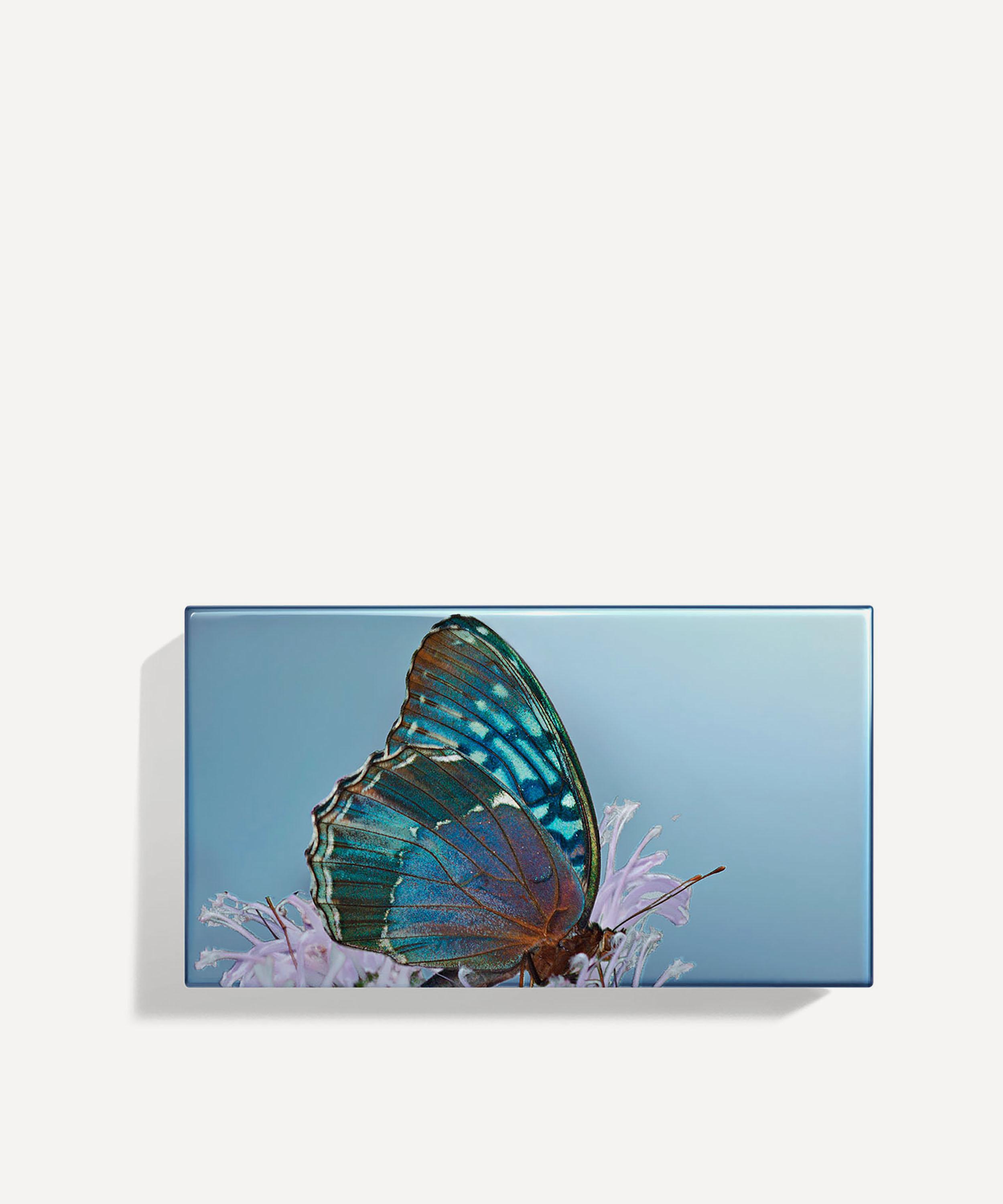 Les Papillons Diana Eye Trio from Chantecaille showcases three luxuriously smooth pressed powder eyeshadows in cool tones, housed in a charming blue compact.