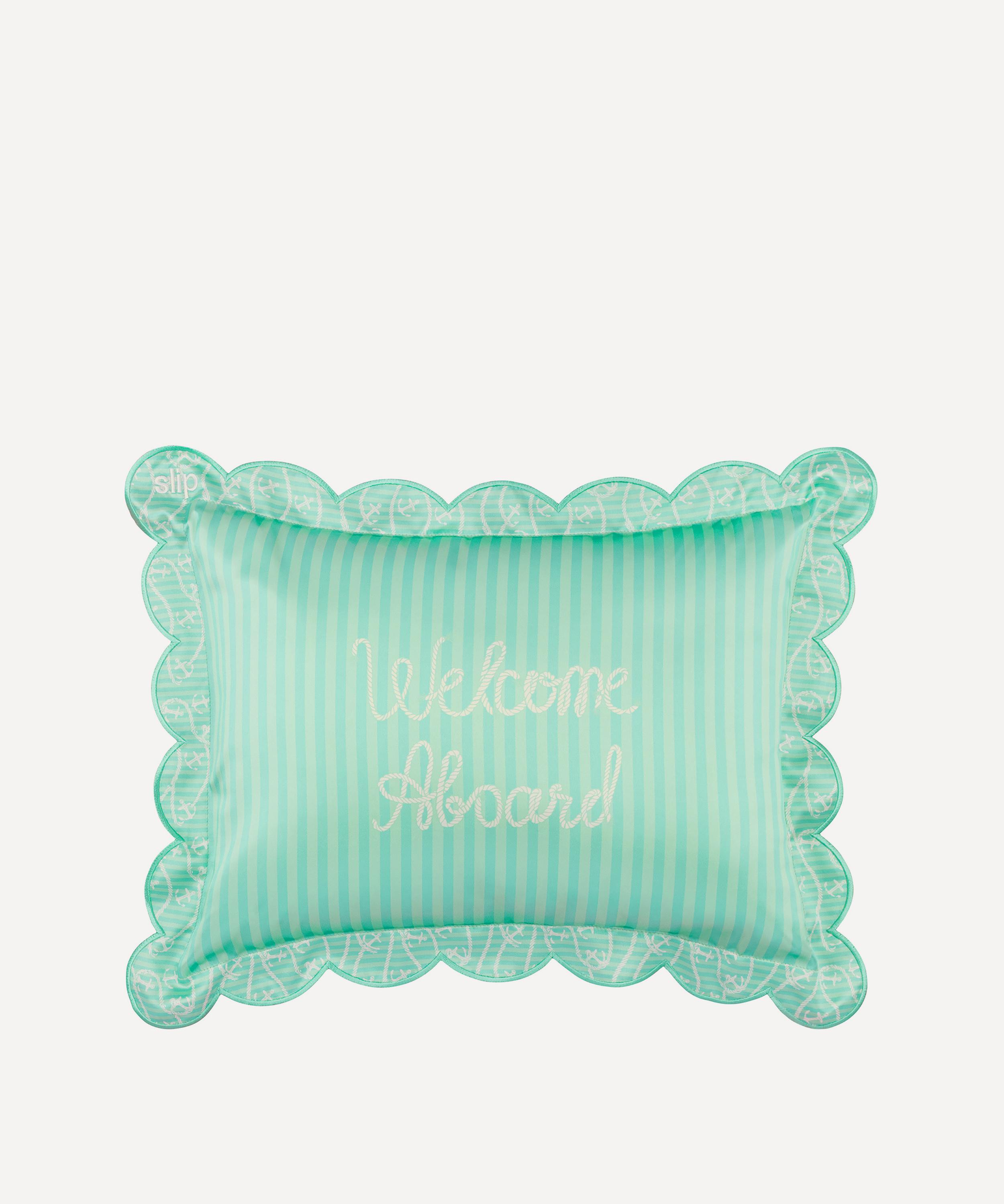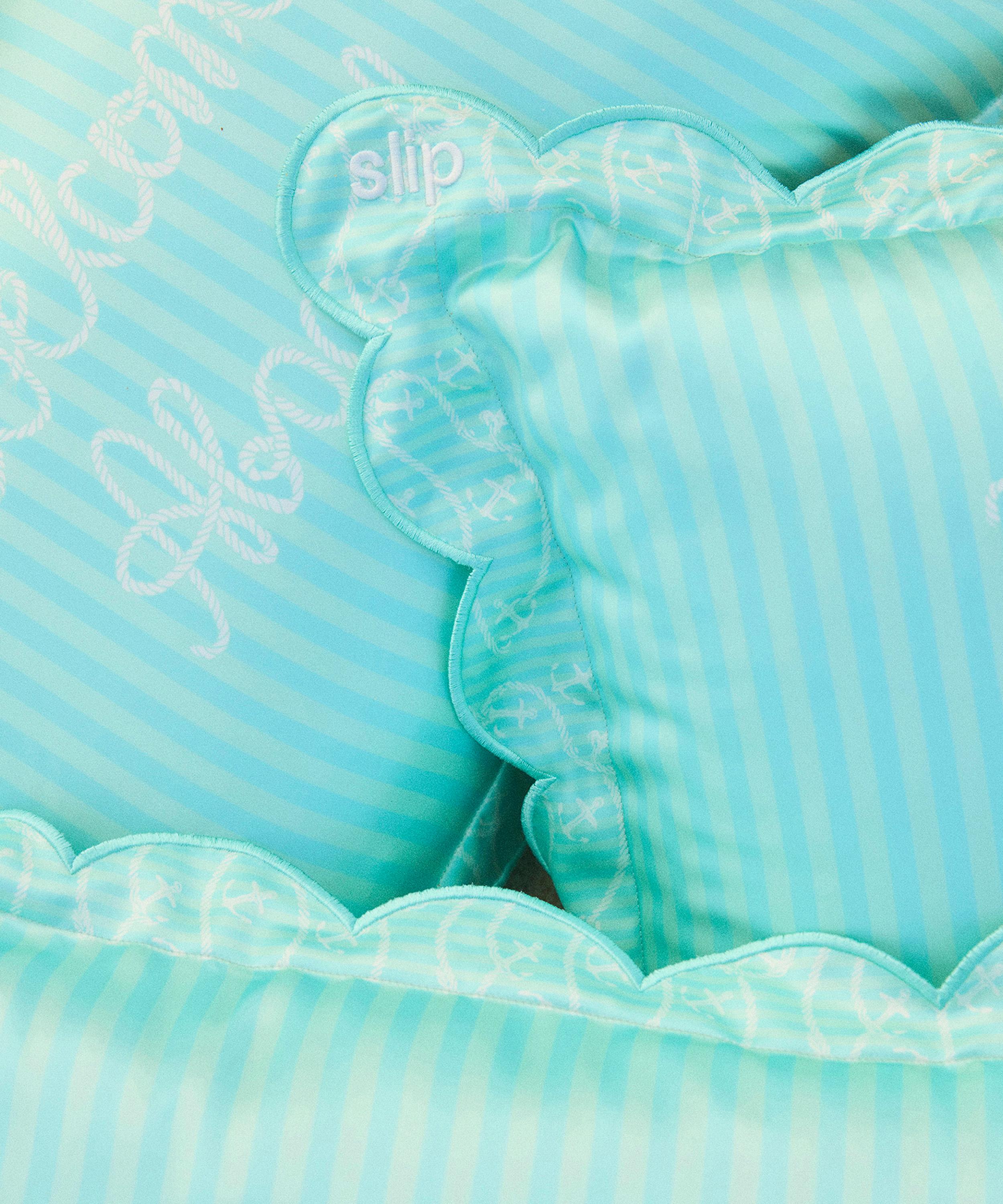 Elegantly enveloped in the brand's innovative slipsilk, made from the highest grade 22 momme long fibre mulberry silk and decorated in a playful stripe pattern with contrasting print scalloped trims, the travel pillow is helps preserve the condition of skin and hair. Significantly less absorbent than cotton and other bedding materials, the sumptuously soft silk helps keep beauty products and moisture where it's needed most, on your skin.
