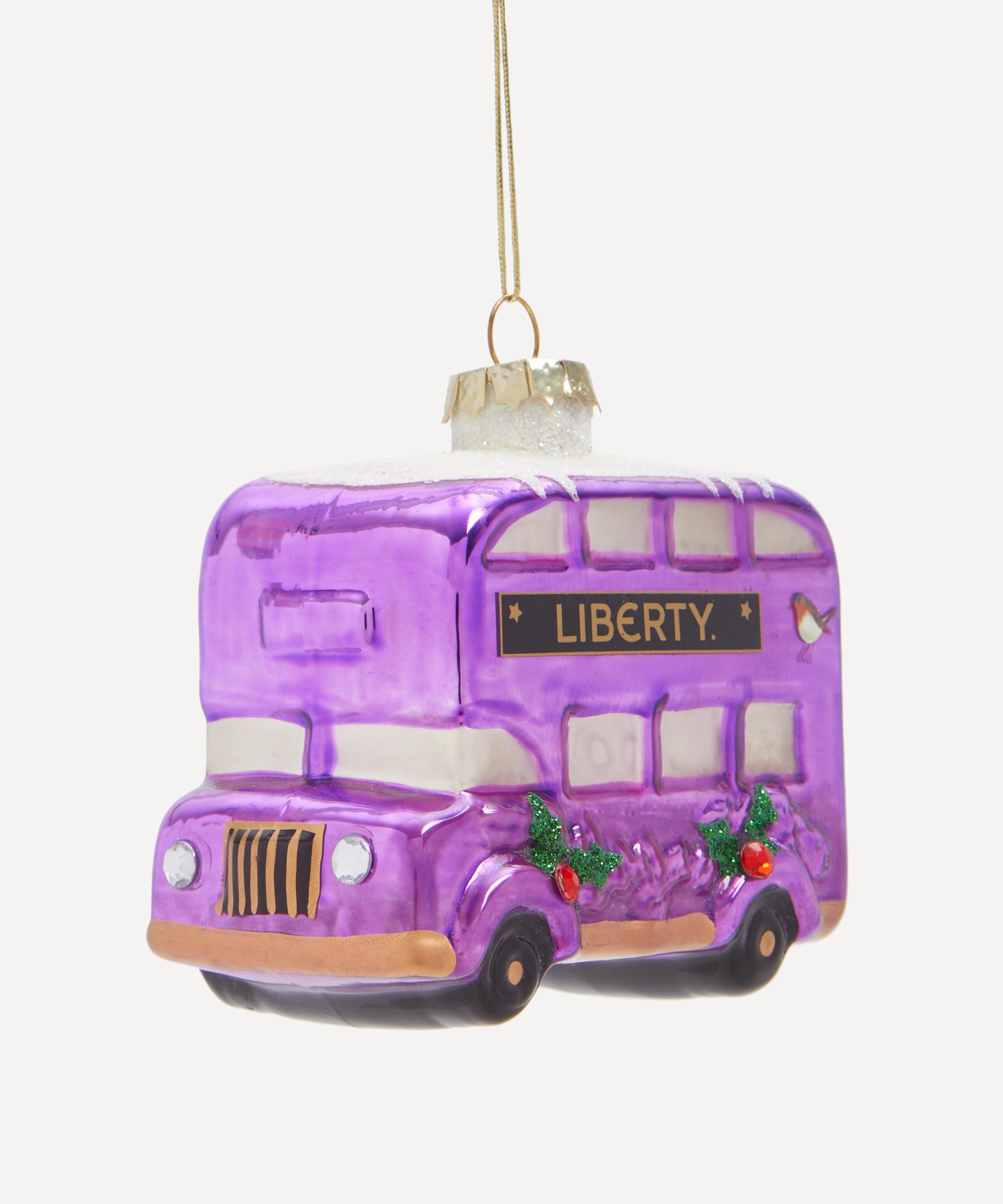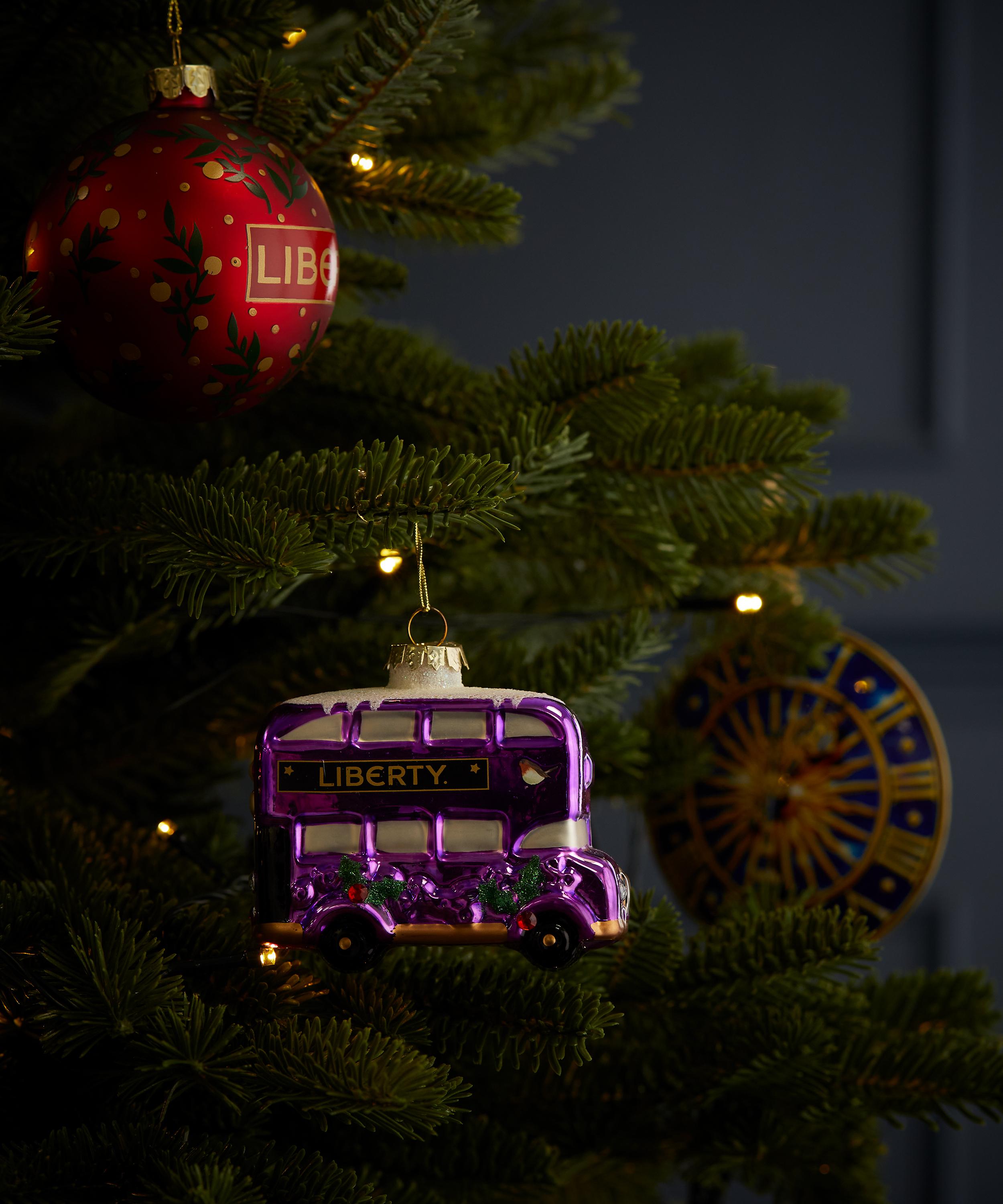 Designed in or signature purple tone, this charming London bus ornament features a smattering of festive holly detailing, including a Liberty logo to the centre. Complete with a practical hanging loop, this tree ornament will bring a dash of our iconic heritage to your festive fir or pine.