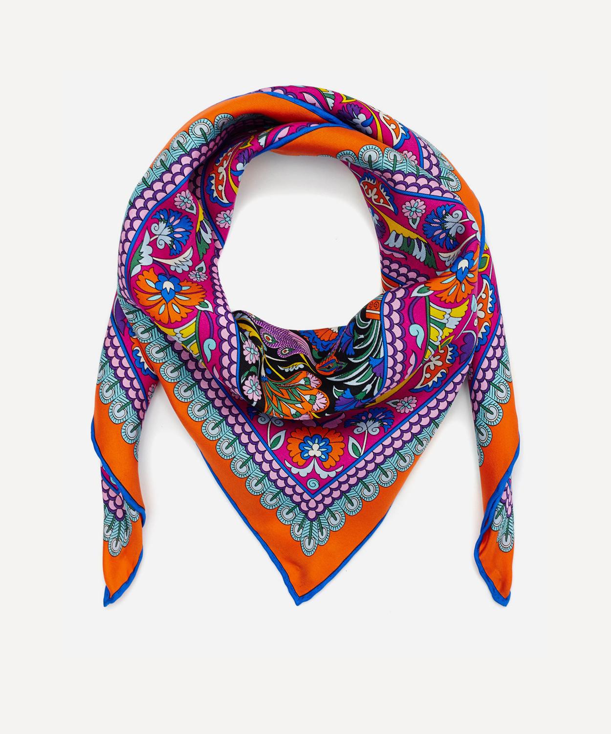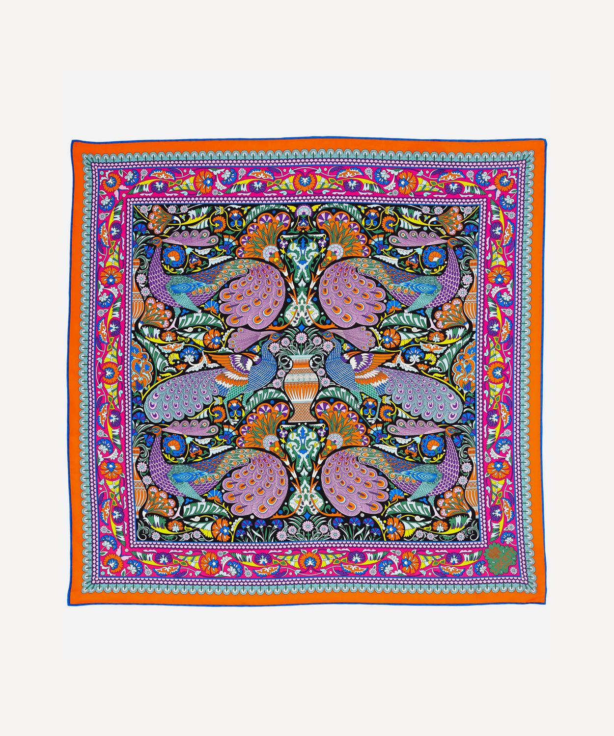 This small silk square scarf is beautifully decorated in Peacock Garden Liberty print. Reworked on silk twill, the original design dates back to 1990, and is based on a tile mosaic by William de Morgan. In 2013 the print was updated with a new peacock inspired border, emphasising the decorative detail of the original.