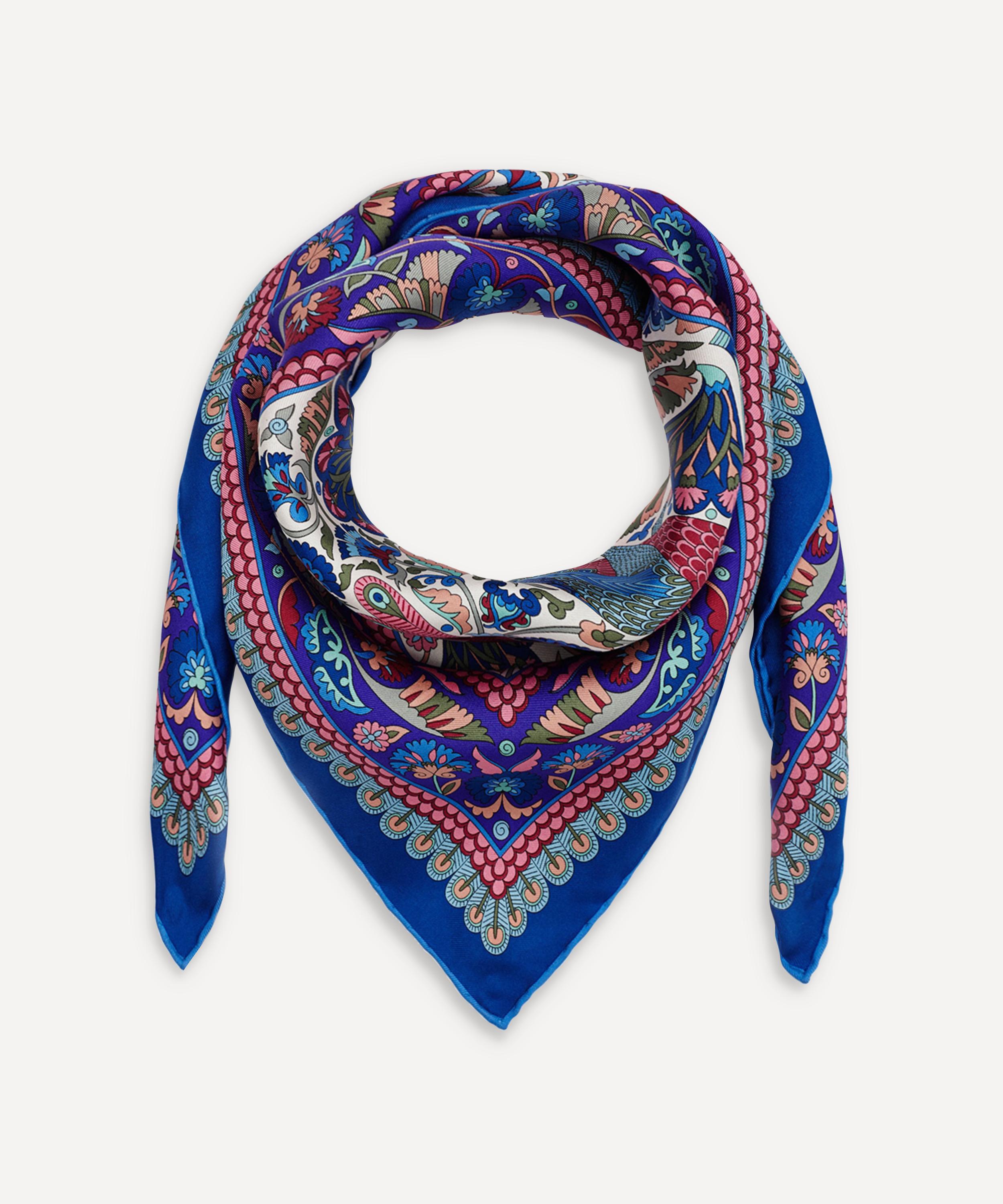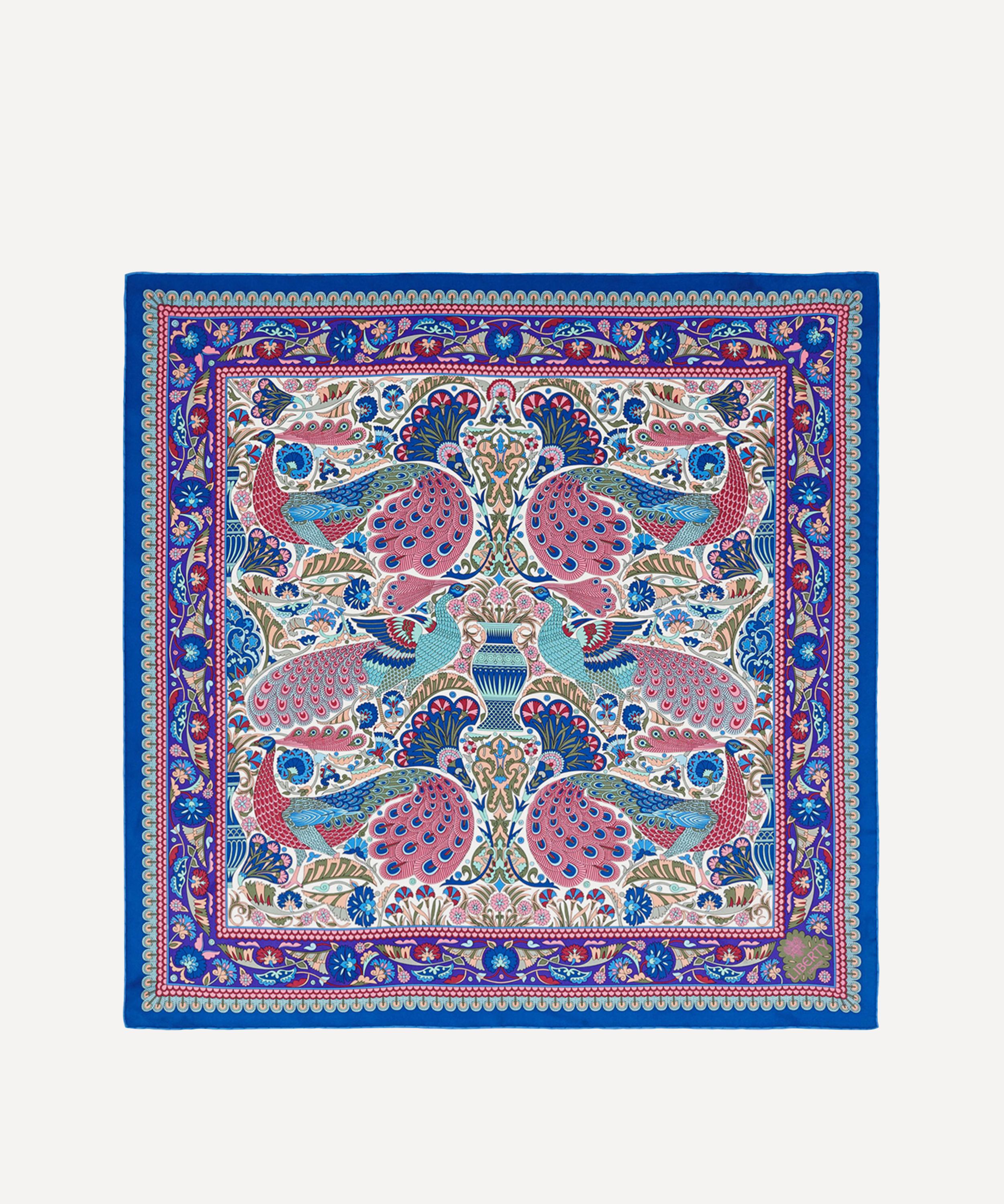 This small silk square scarf is beautifully decorated in Peacock Garden Liberty print. Reworked on silk twill, the original design dates back to 1990, and is based on a tile mosaic by William de Morgan. In 2013 the print was updated with a new peacock inspired border, emphasising the decorative detail of the original.