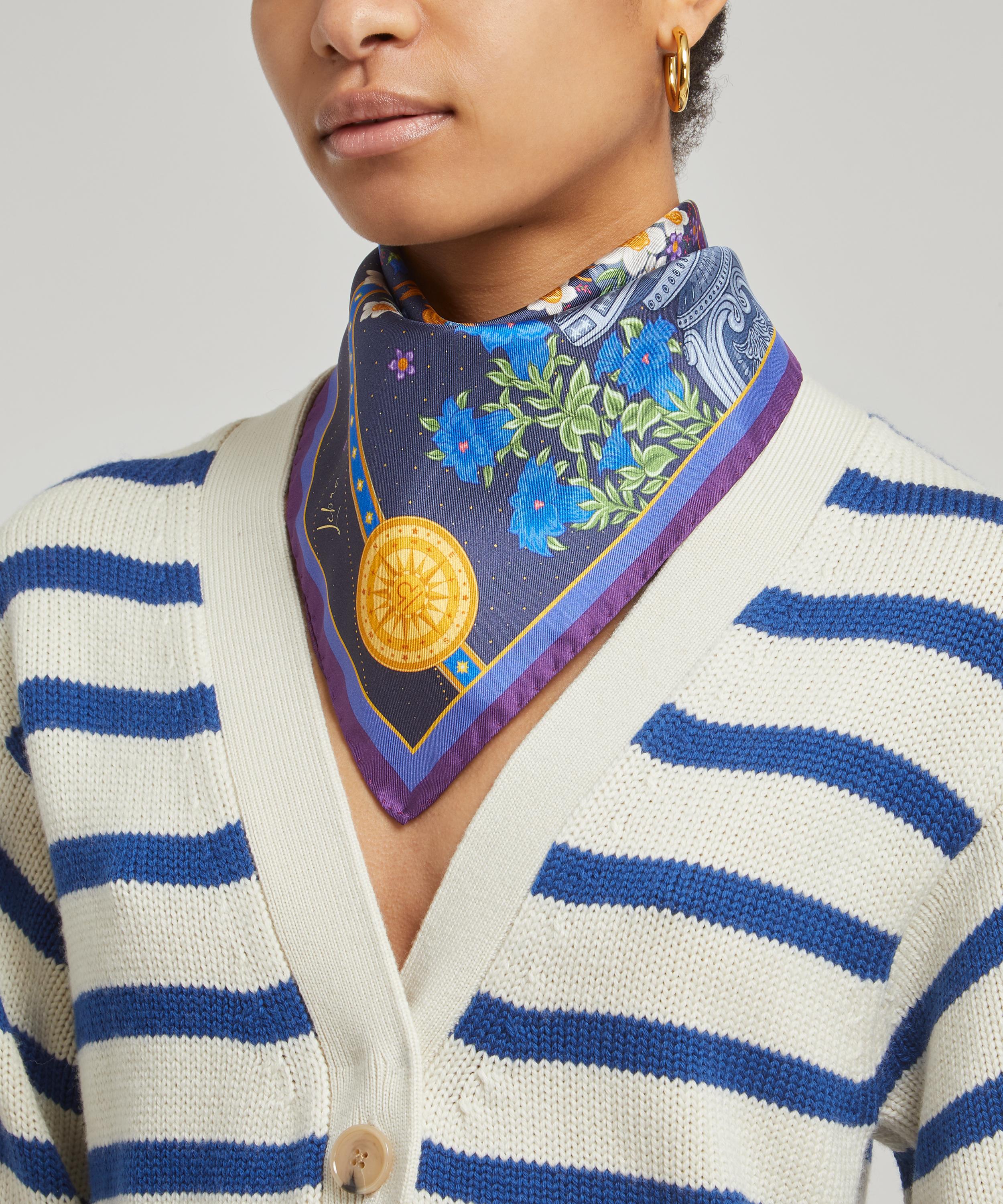 Liberty’s exclusive Celestial series spotlights each of the astrological signs within a luminously moonlit skyscape. Exquisitely made and printed in Italy on 14mm silk twill, each of the original designs has now been reimagined on a small, square silhouette. Wear your sign with pride as a head band, scrunchie or neckerchief for a flash of cosmic print magic – heaven-sent as a birthday gift for someone special, or a treat for yourself.