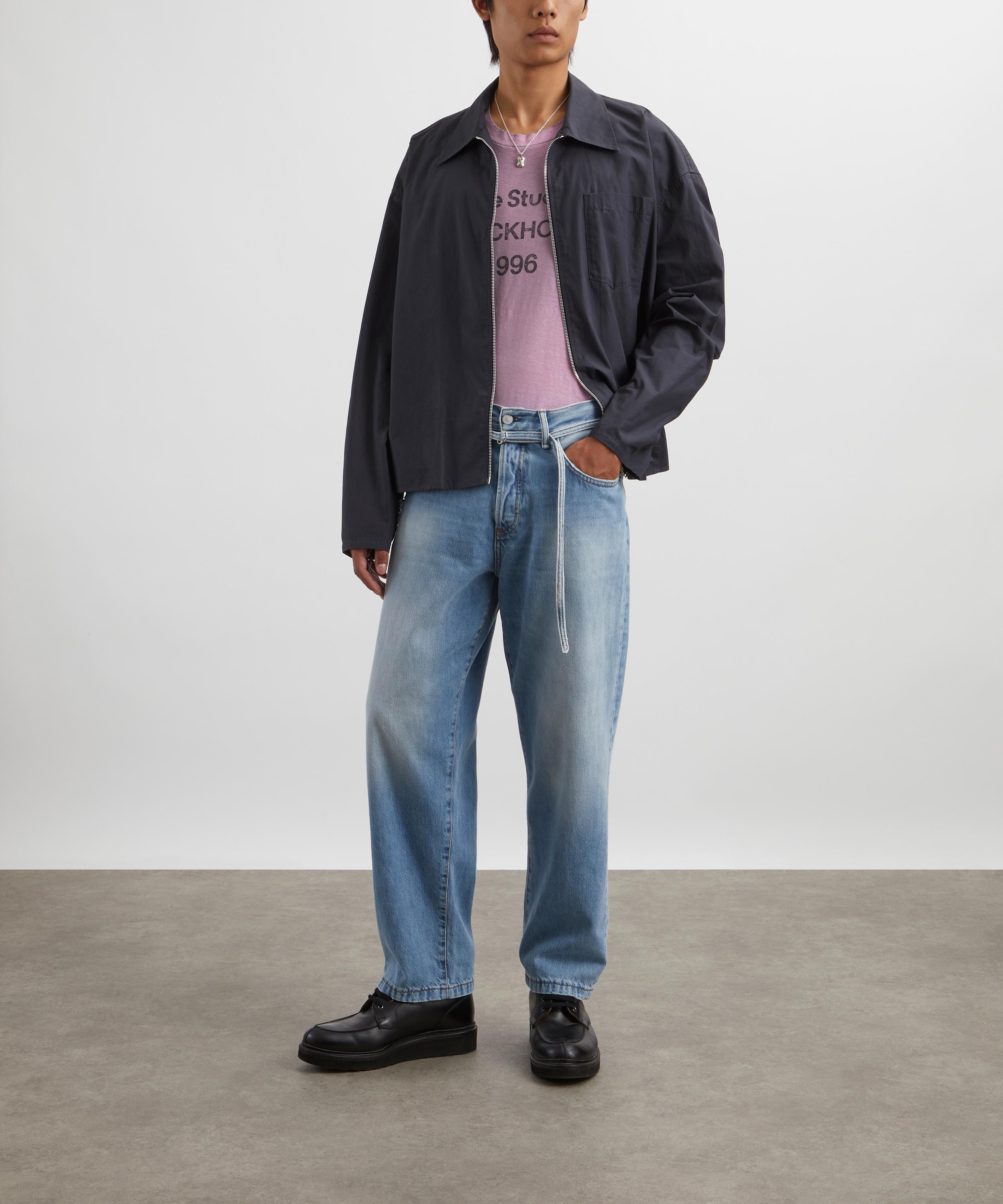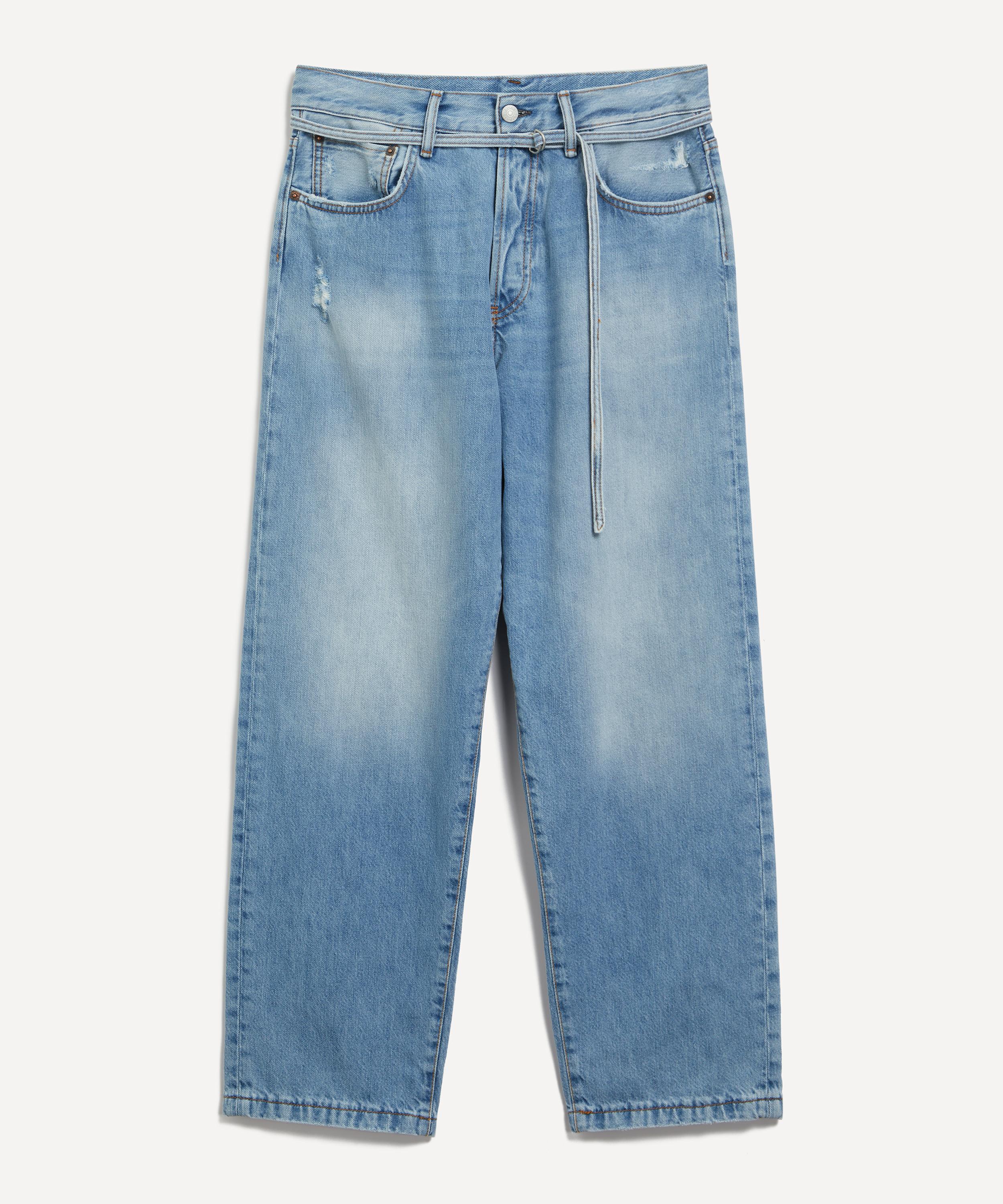 Crafted from rigid denim in a light blue wash, these loose fit jeans feature a low to mid-waist, and a straight leg complete with a thin belt, 5-pocket construction, and a logo-embossed jacron patch on the back. Inspired by vintage denim, this pair is finished with fading and distressed detailing throughout for a lived-in look.