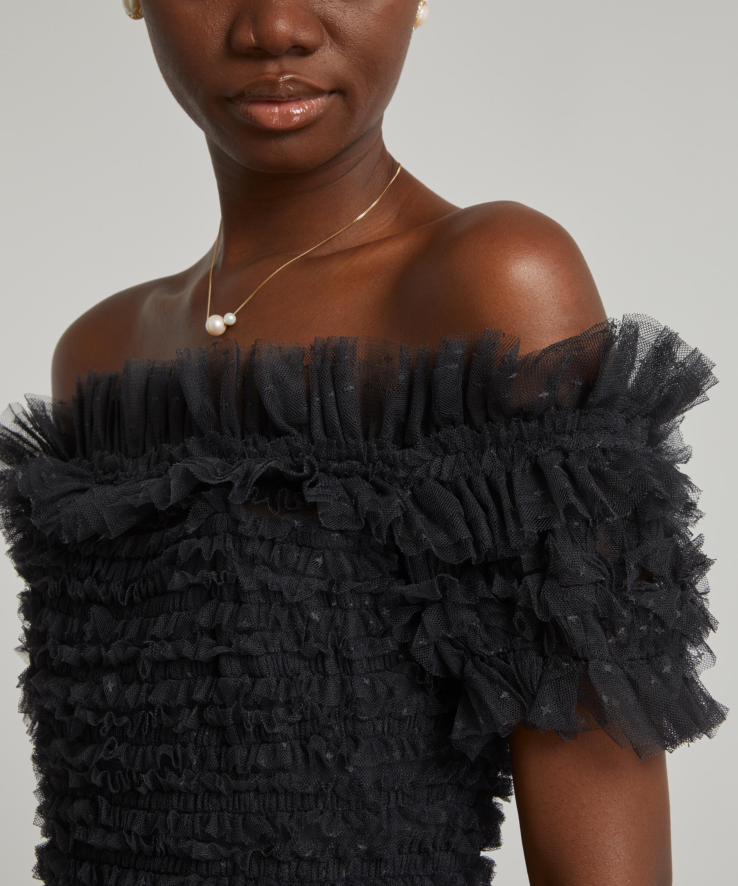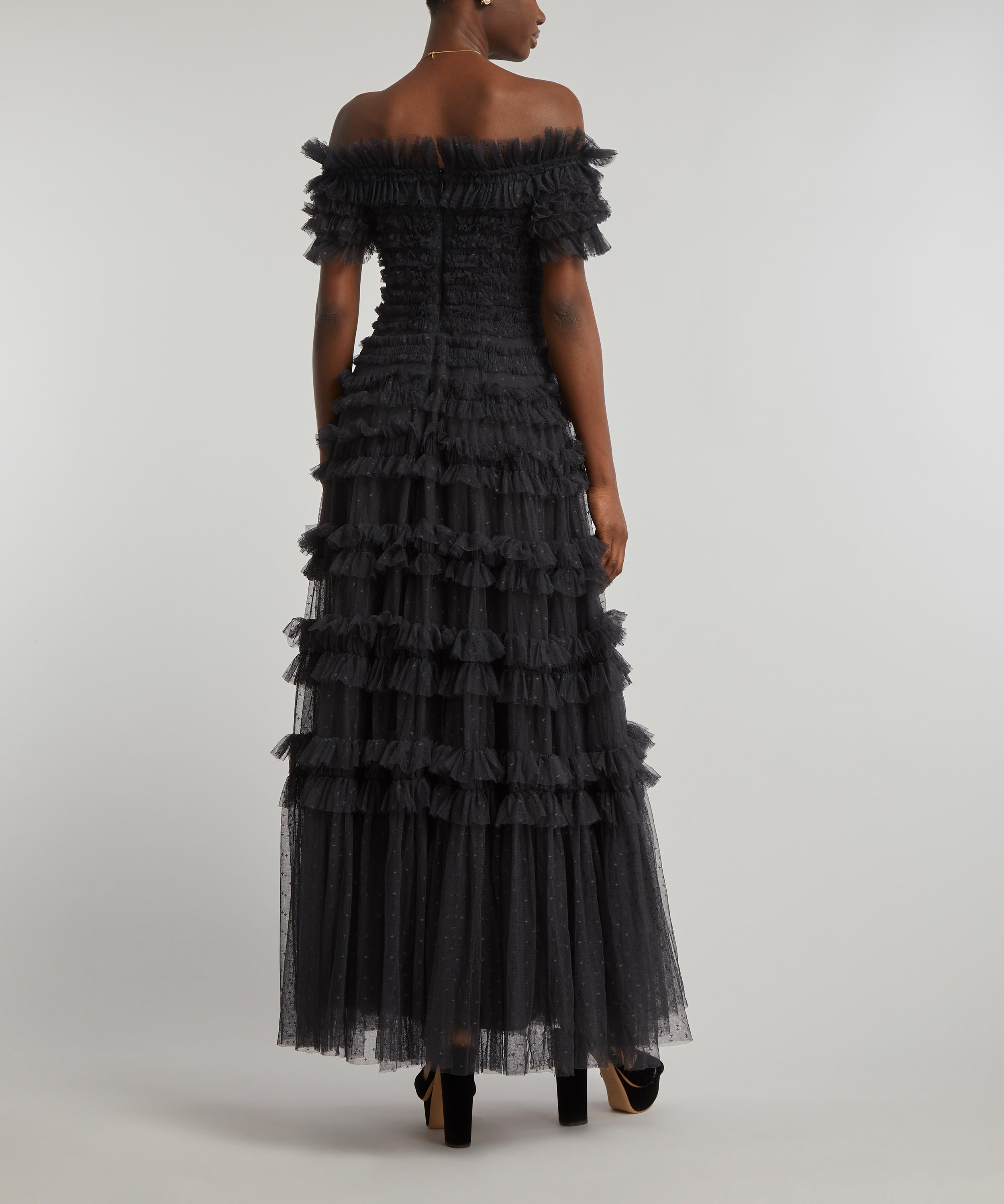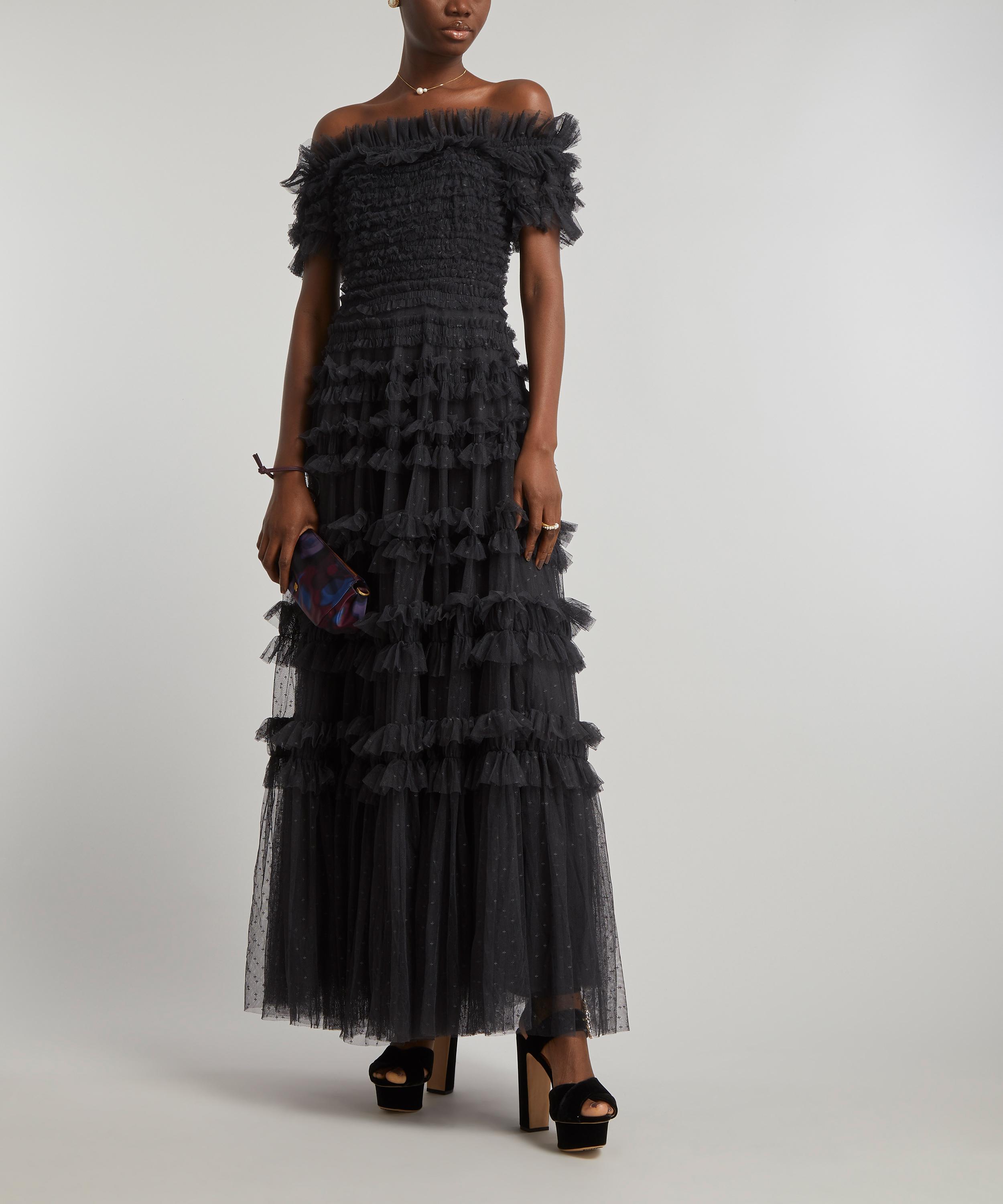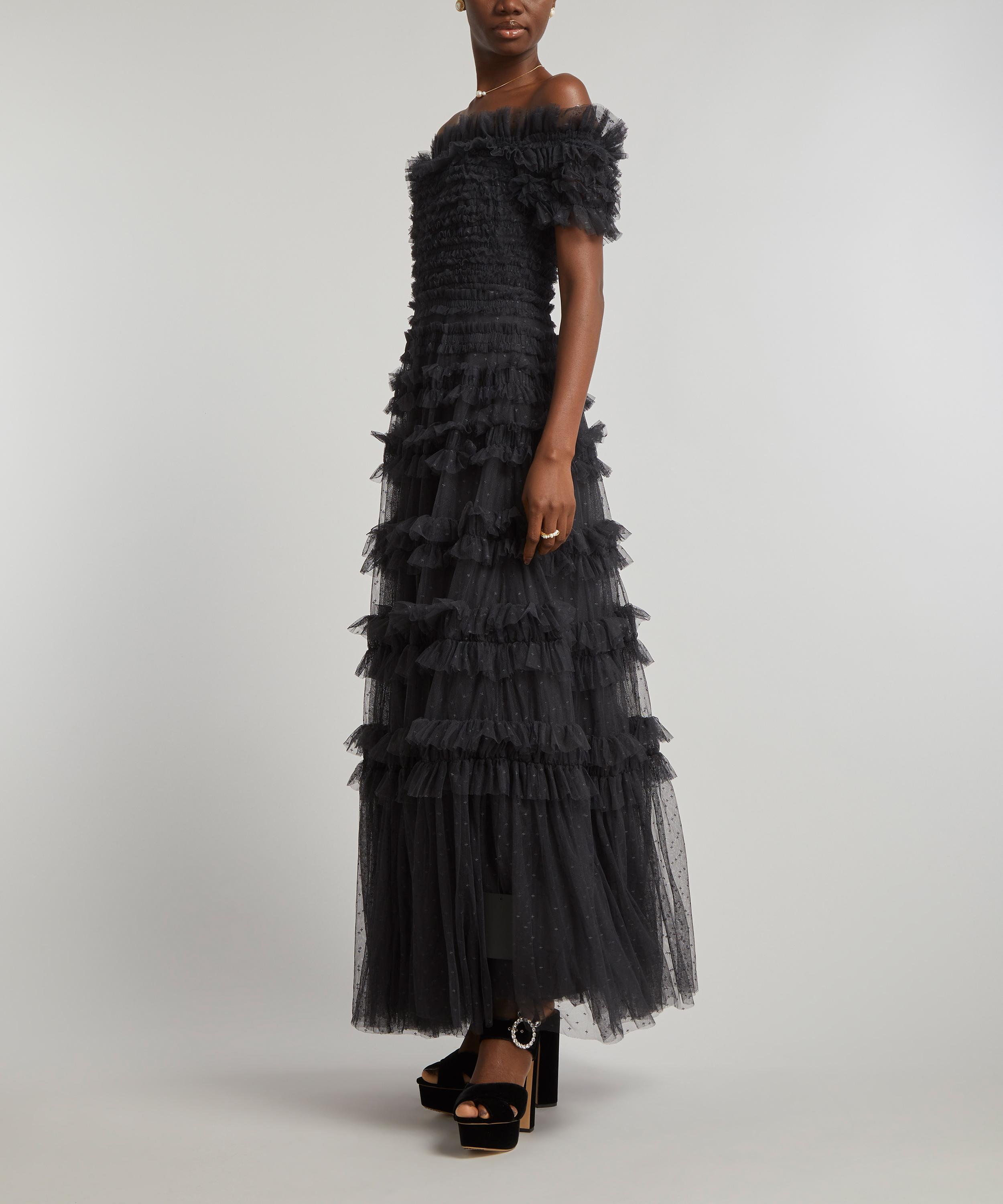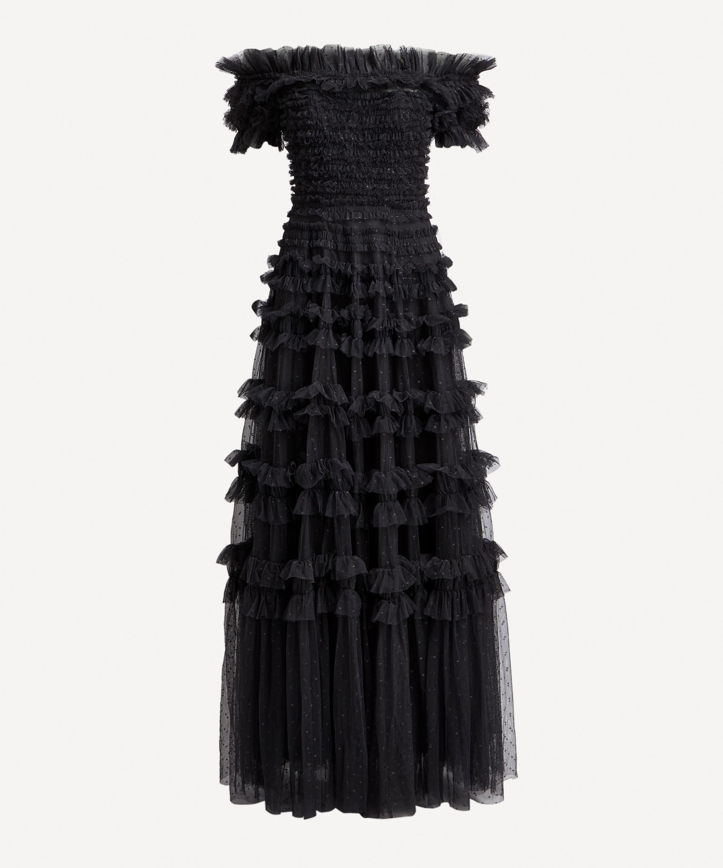 Needle & Thread prides itself on creating the stand-out piece you need for your next celebration – this statement ruffled gown is no exception. Effortlessly elegant, the Lisette is inspired by classic styles of the Golden Hollywood Age with its off-the-shoulder design. A true statement piece with its tiers of whimsical ruffles, it’s constructed with the brand’s signature Kisses tulle and double-stitched frills for a dramatic, romantic finish.