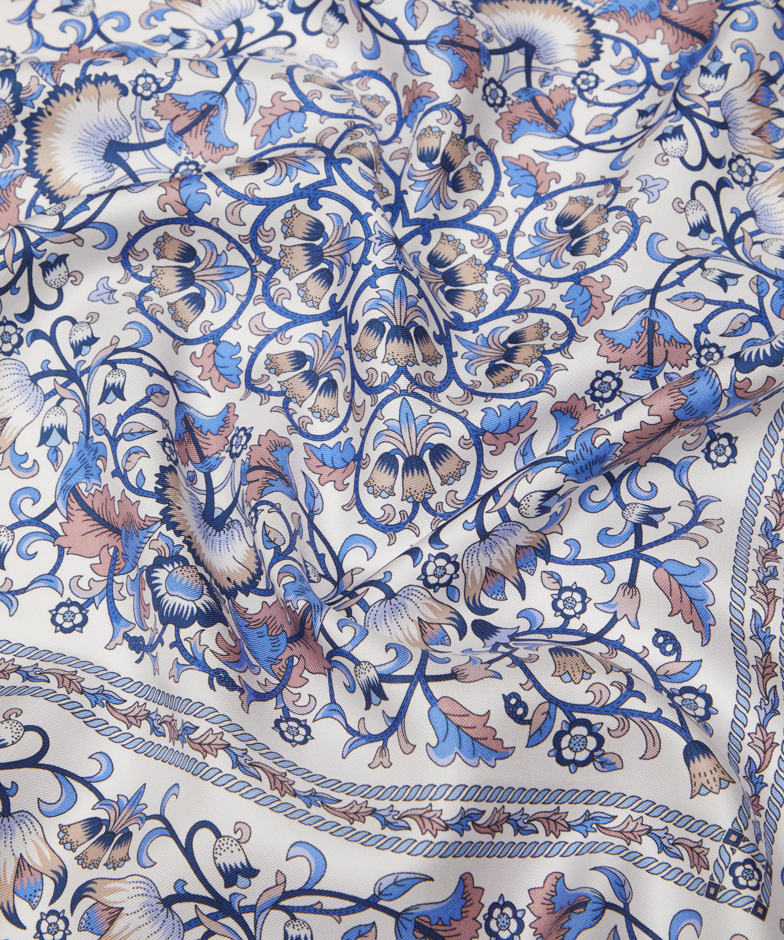 Update your look with a statement piece that is steeped in history; beautifully decorated in Lodden Liberty print, a design from 1884 credited to William Morris. When Morris & Co. closed down in 1939/40, the printers Stead McAlpine bought the original blocks, and Arthur Steward Liberty arranged for permission for a number of Morris designs to be used for Liberty. Here the original design has been transformed into this perfectly petite silk square scarf. Modernise the look by styling it creatively; think knotted onto bag handles, peeking from the neckline of a leather jacket or simply draped open around the neck.