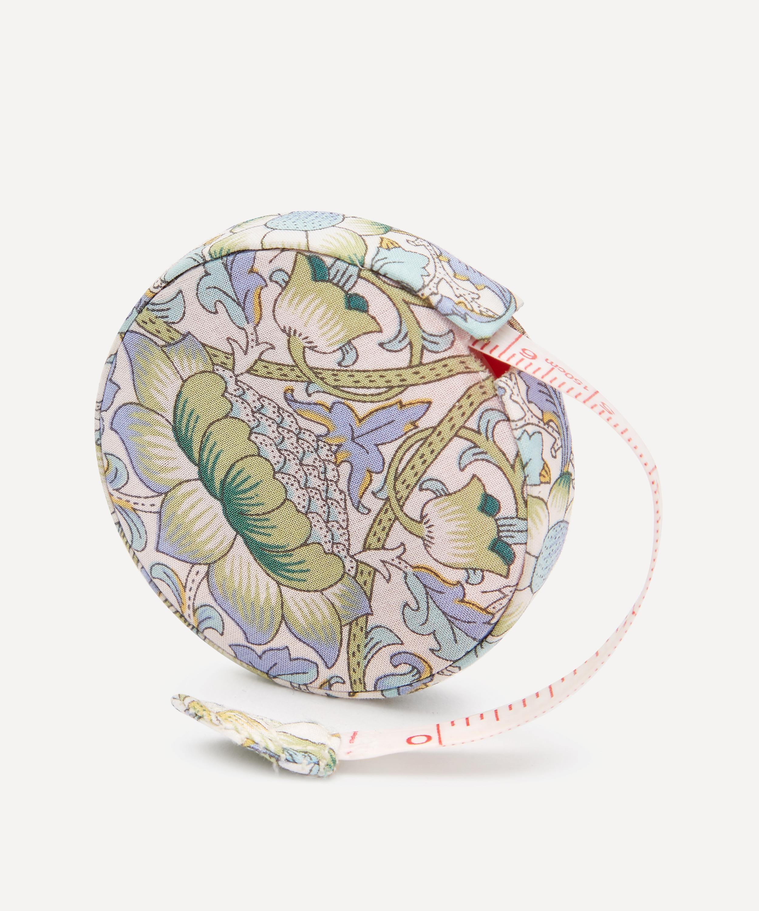 This measuring tape comes in a circular fabric case featuring a classic Liberty print.