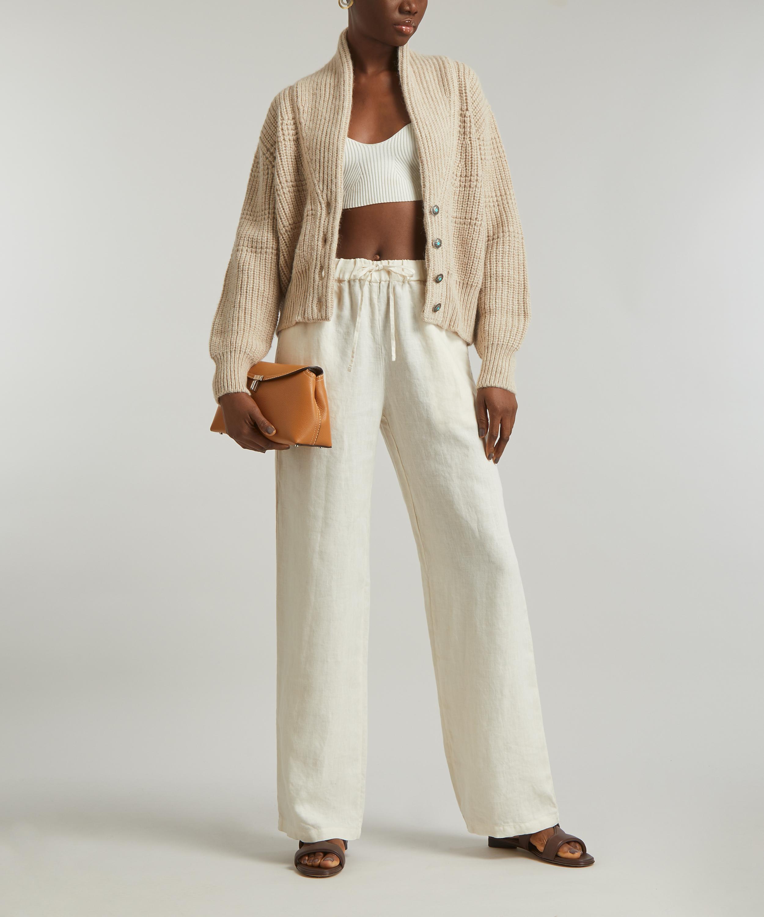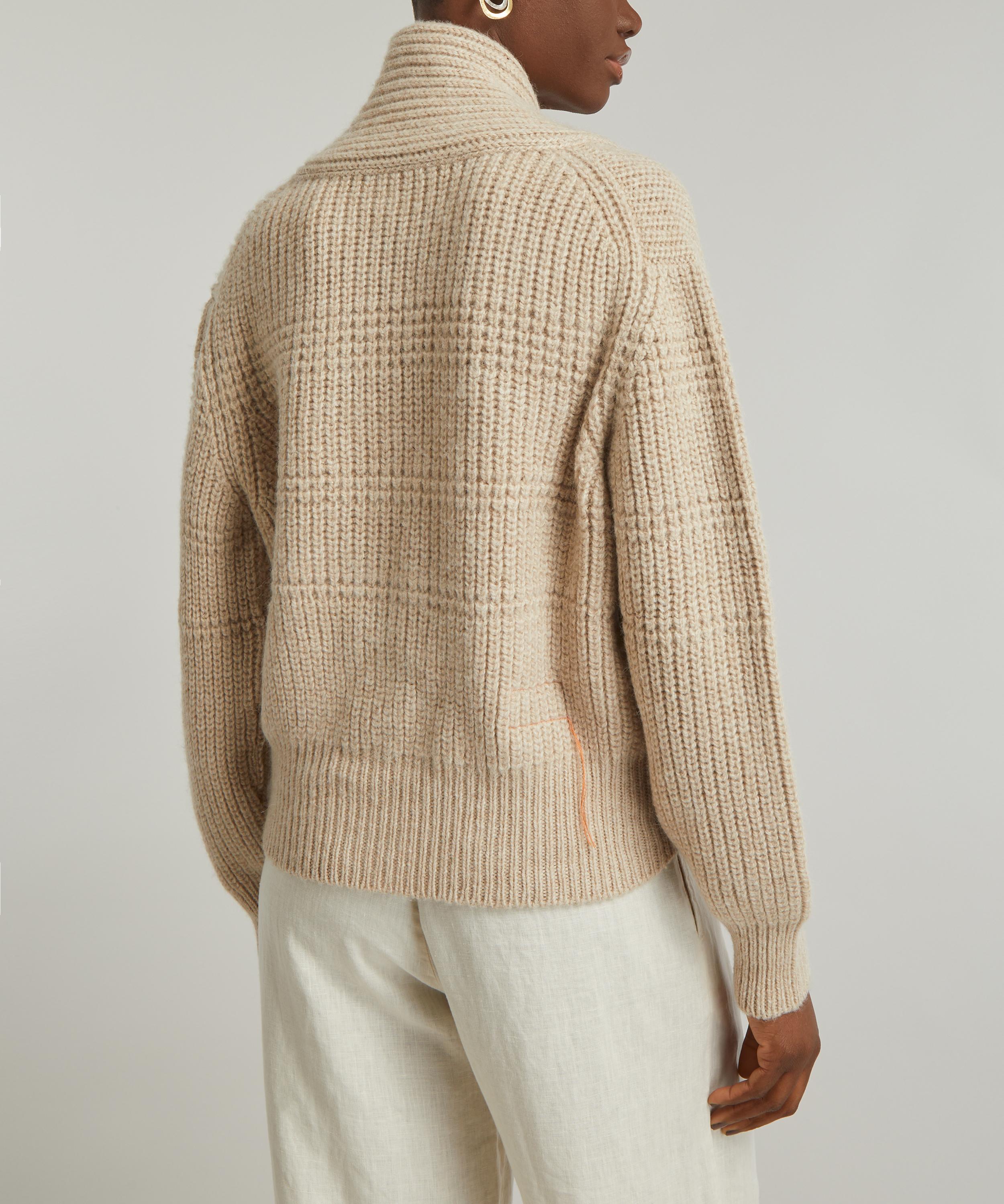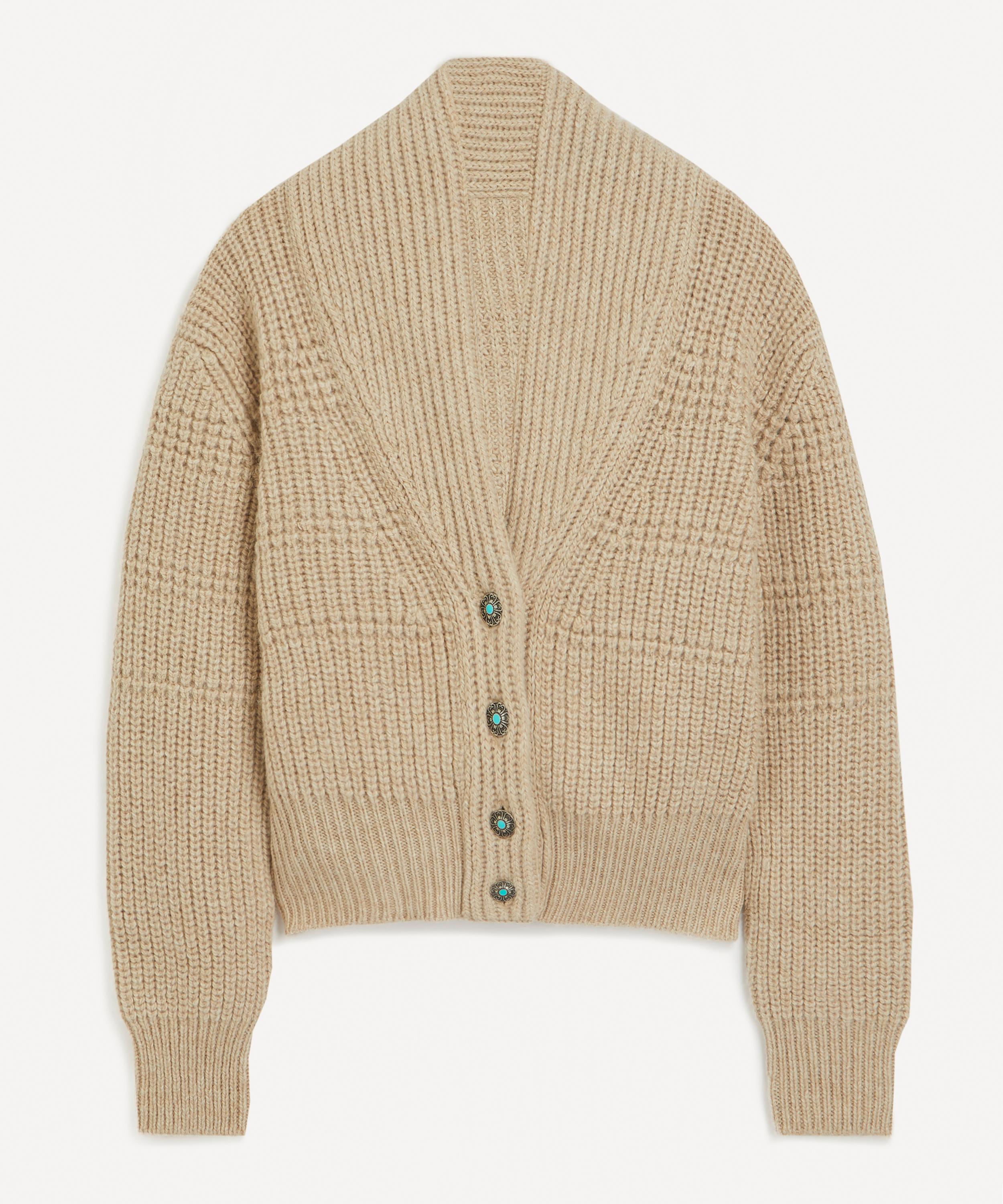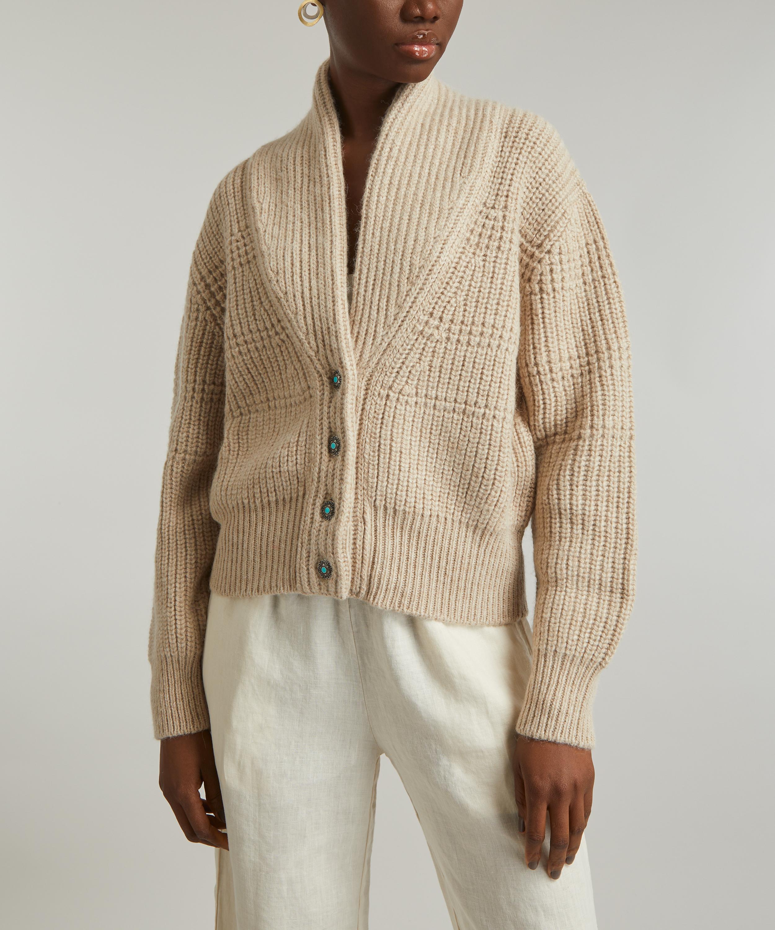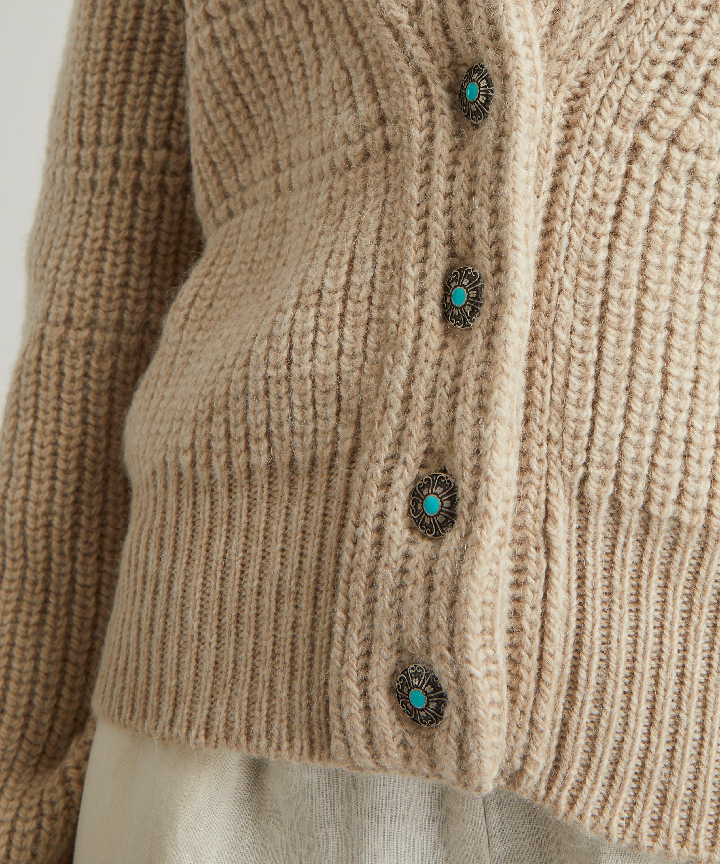 Open-knitted from super-soft alpaca for a slouchy, relaxed fit with a statement shawl-collar and contrasting ribbed trims, its buttoned closure features Navajo-style, turquoise-embellished silver buttons.