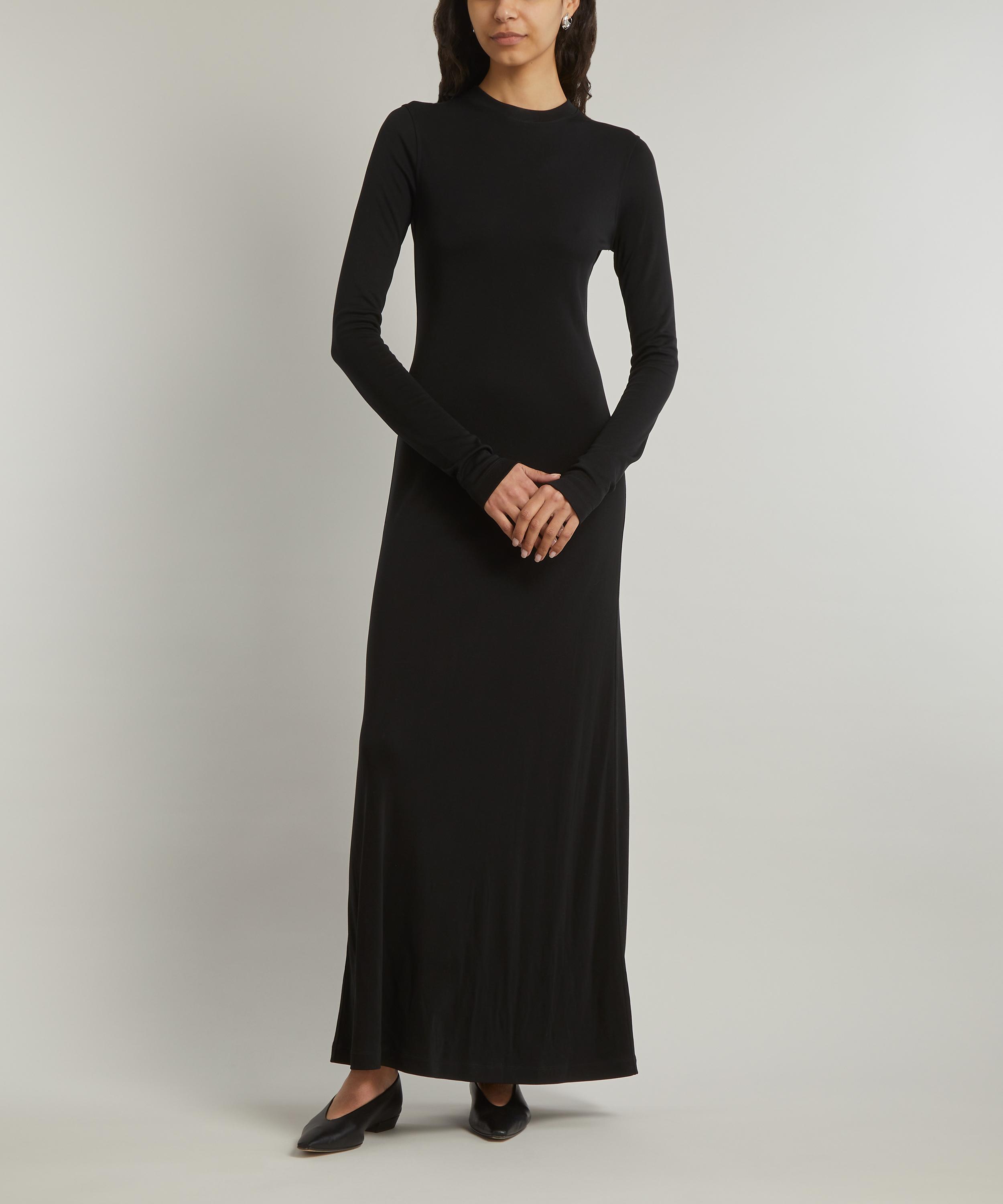 This sleek dress is cut from mid-weight, soft Lyocell jersey to a sleek longline silhouette with a ribbed crew neck and elongated sleeves. Wear with mules or sandals for a fresh and versatile addition to your daily edit.