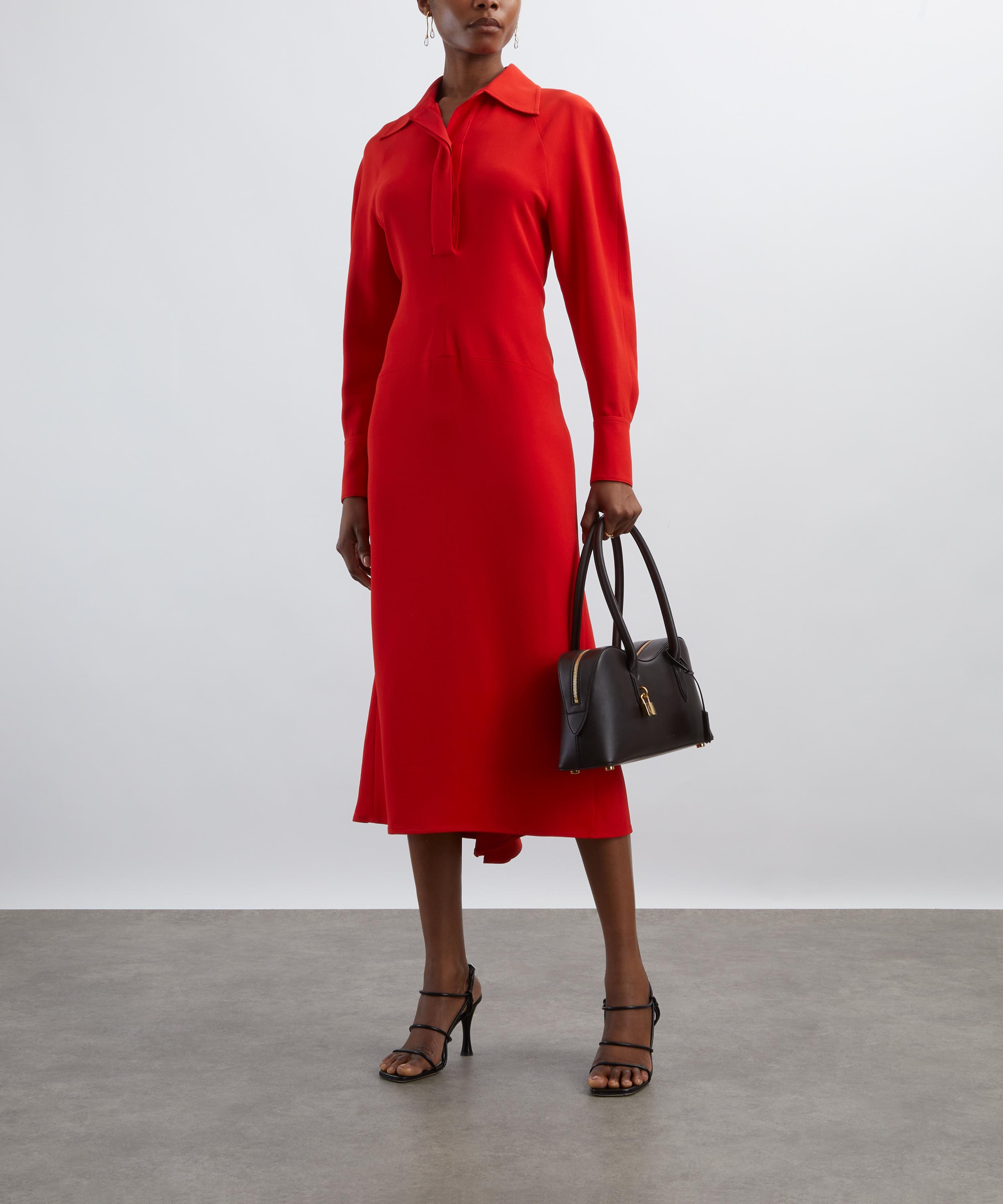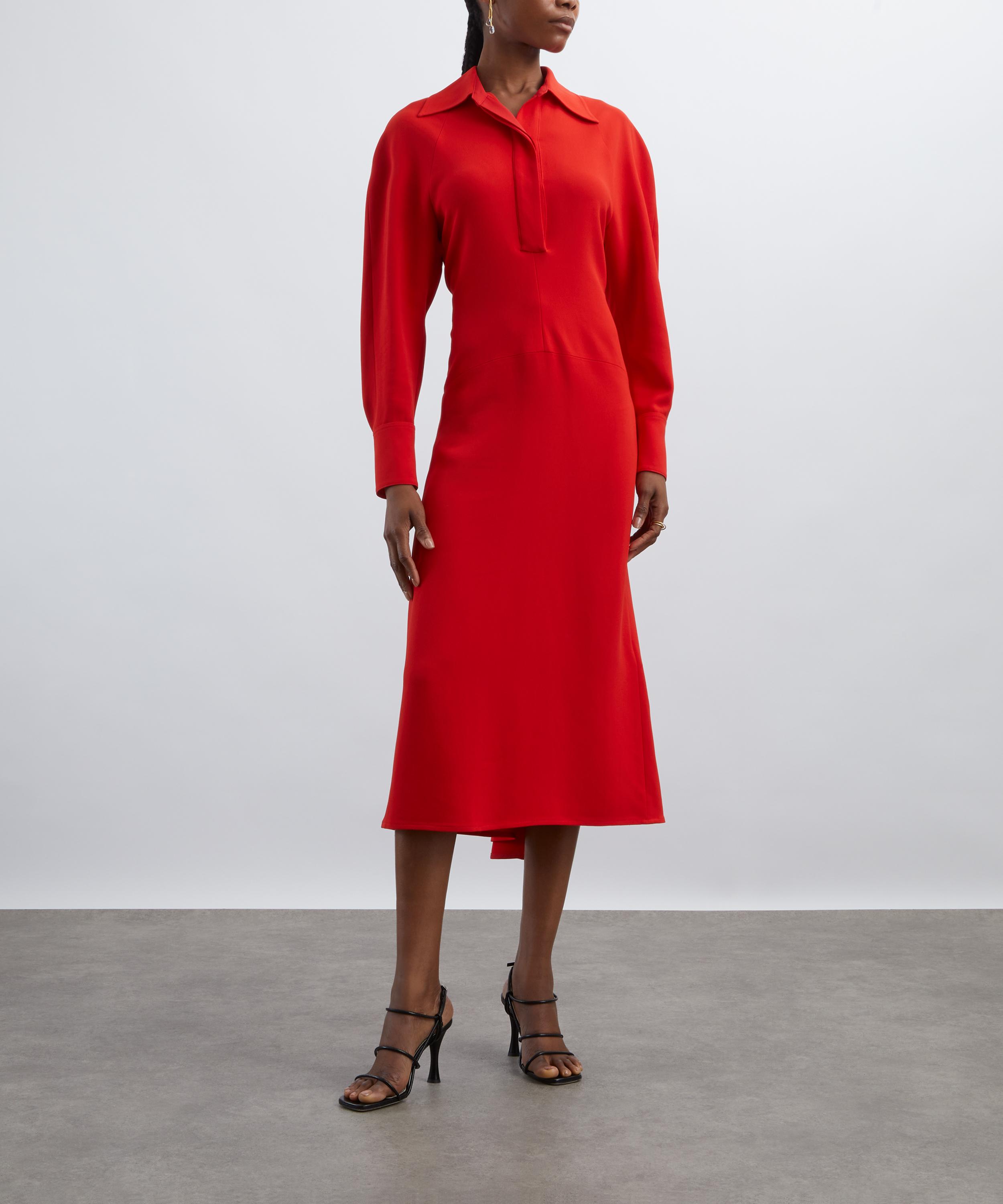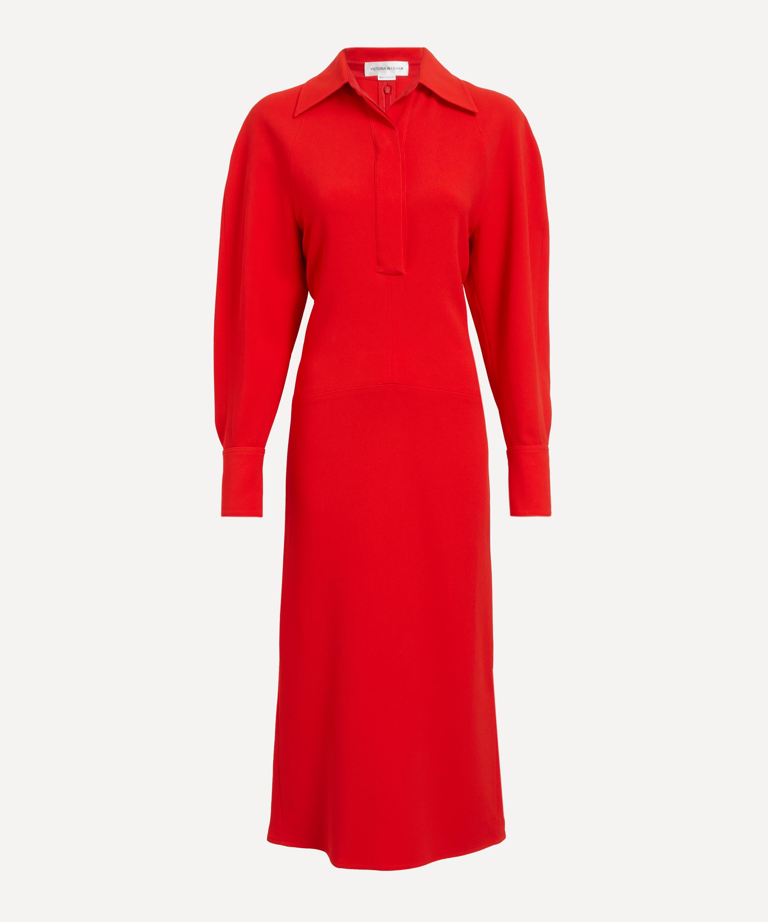 The Long Sleeve Polo Collar Midi Dress from Victoria Beckham serves as the foundation of the modern woman's wardrobe with its timeless design and sophisticated silhouette.